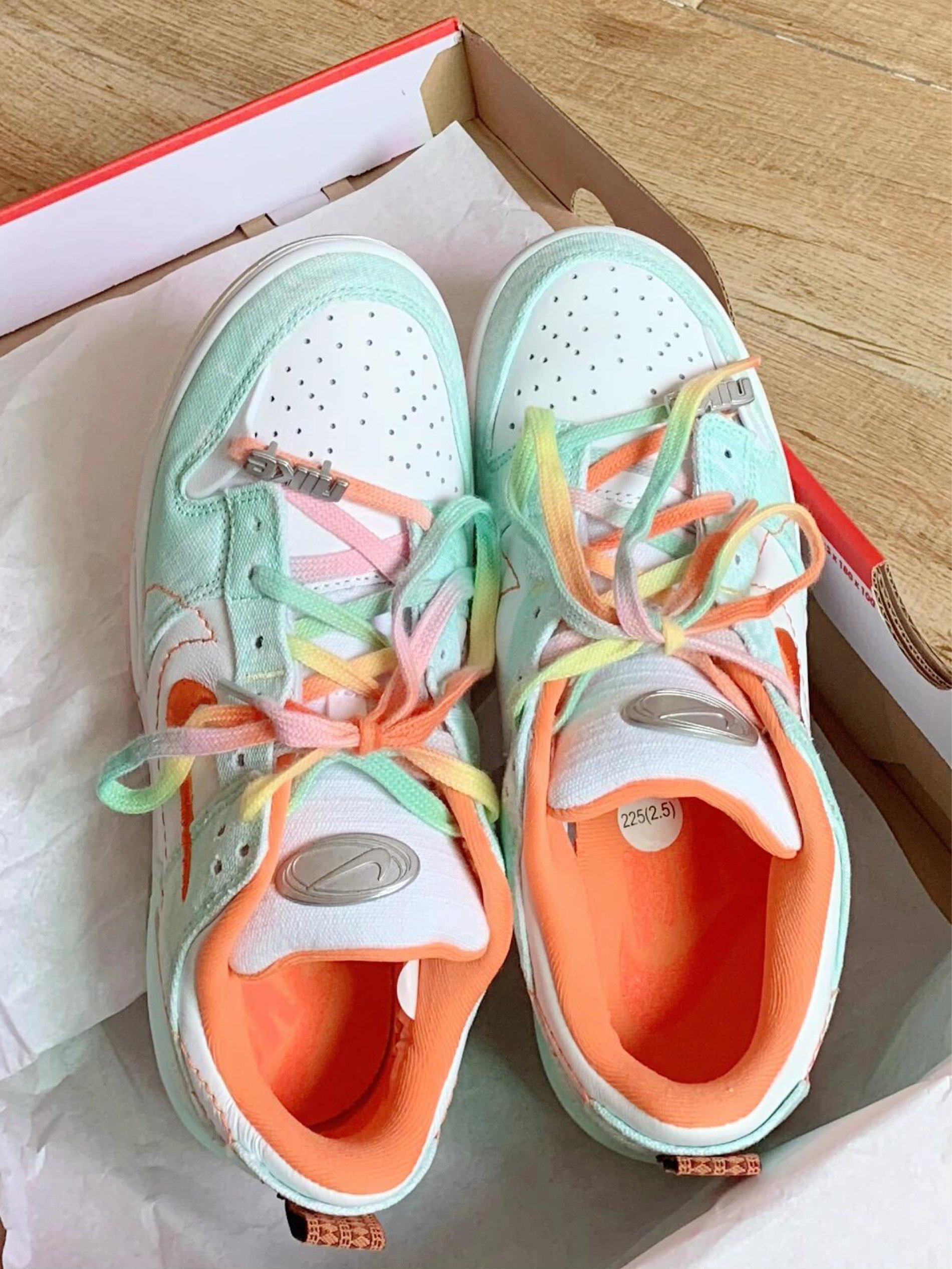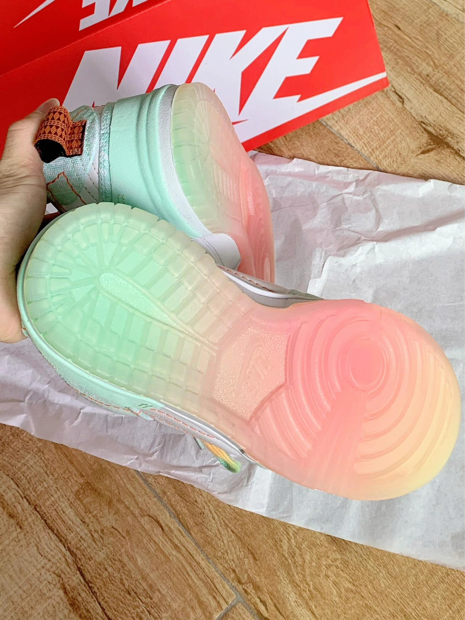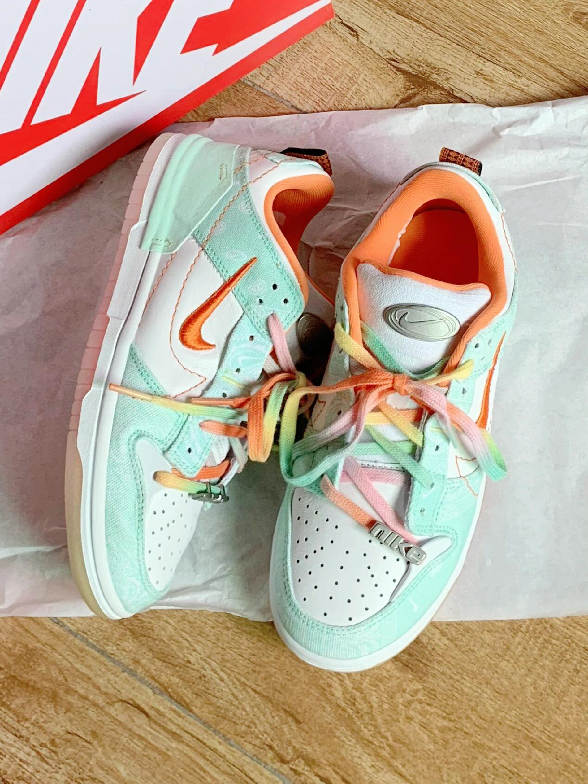 这双白绿小清新Dunk太特别了吧!白绿“哈密瓜 ”配色颜值真的好清新,扎染布的设计搭配街头感十足的腰果花 整体毫无违和感 还很搭配,鞋底也是一大亮点 渐变的水晶果冻鞋底,踩上去脚感也很不错,软软的,鞋带也是彩绳设计,真的很美丽🛒