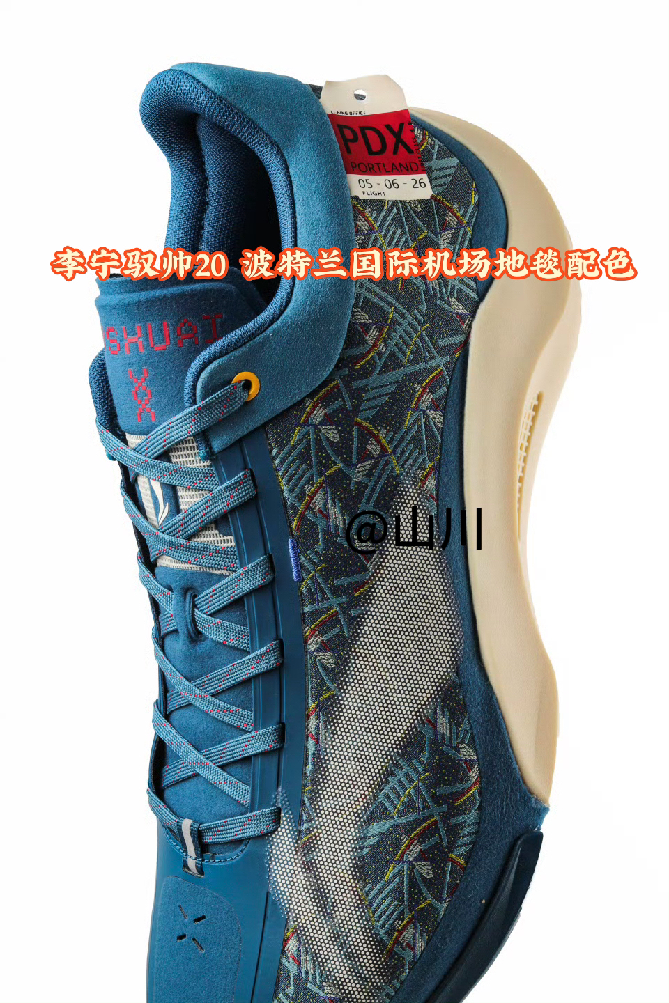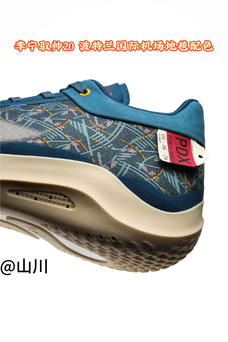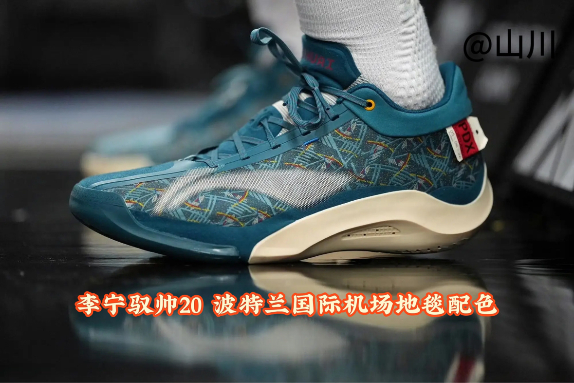 杨瀚森上脚波特兰国际机场地毯配色李宁驭帅20 PE 鞋面图案来自波特兰国际机场标志性的地毯,这个配色此前CJ1上也应用过这个配色方案!以蓝绿色为主色调,点缀深蓝色"T"字图案及红、紫、蓝小方格,代表了美国西北部的大自然景色、几何T字的设计还象征着波特兰机场相交的南北跑道。 鞋子后跟处的标签上写有波特兰国际机场的缩写代码“PDX”。