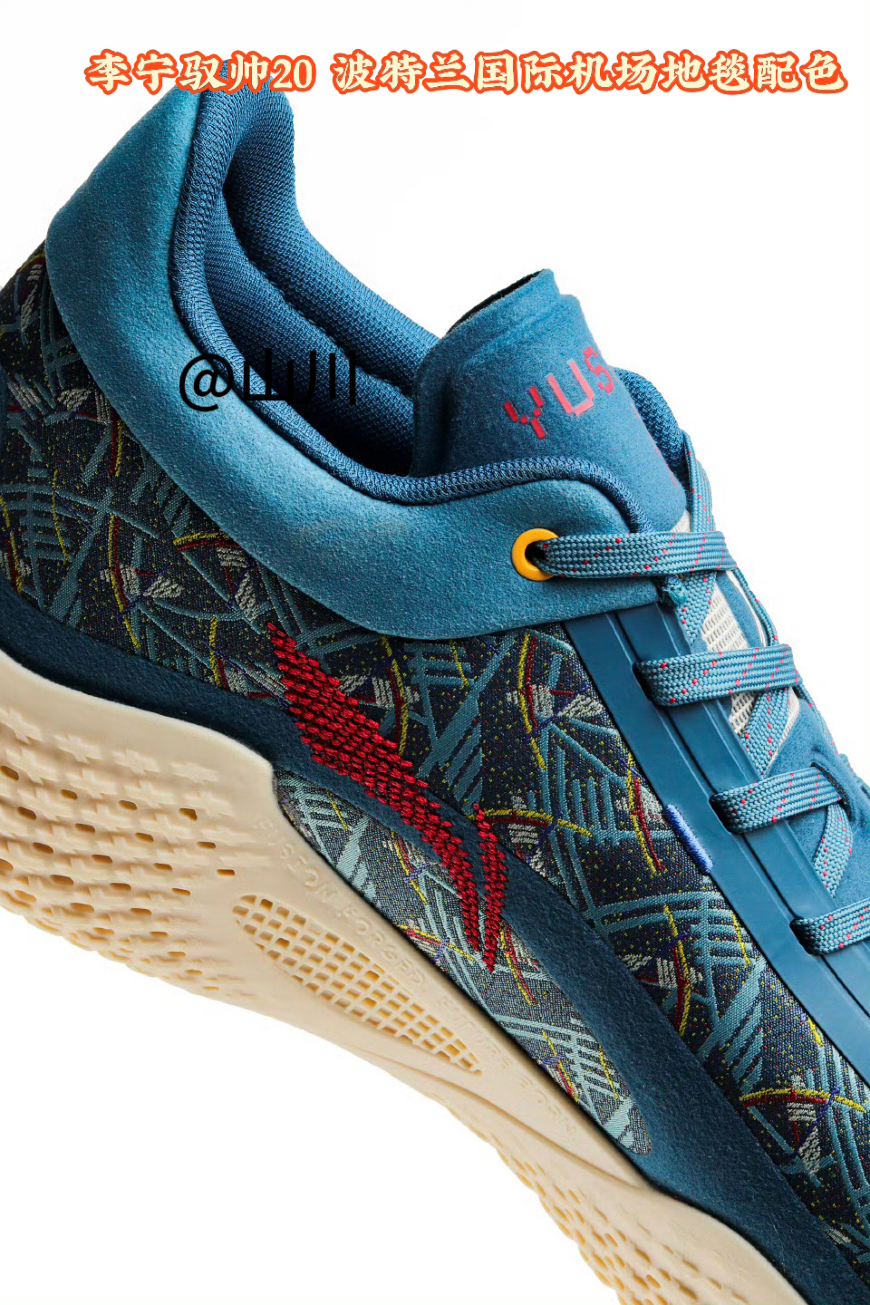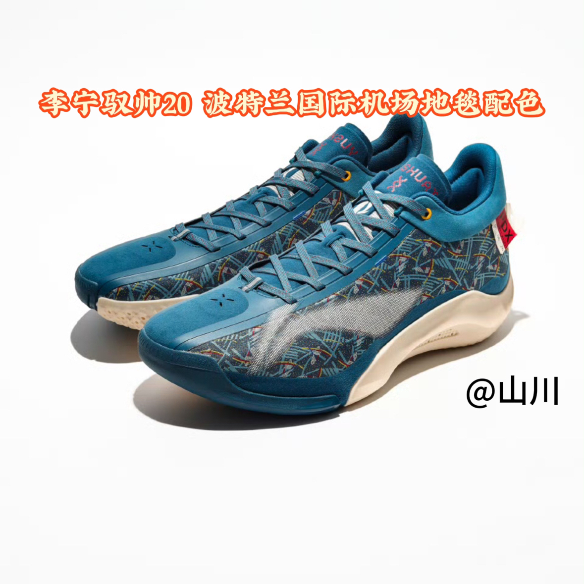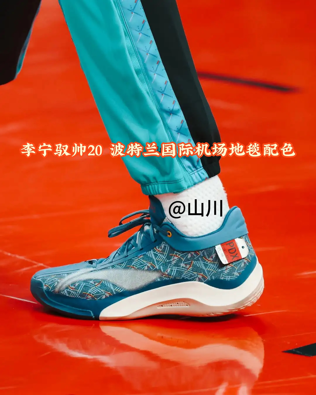 杨瀚森上脚波特兰国际机场地毯配色李宁驭帅20 PE 鞋面图案来自波特兰国际机场标志性的地毯,这个配色此前CJ1上也应用过这个配色方案!以蓝绿色为主色调,点缀深蓝色"T"字图案及红、紫、蓝小方格,代表了美国西北部的大自然景色、几何T字的设计还象征着波特兰机场相交的南北跑道。 鞋子后跟处的标签上写有波特兰国际机场的缩写代码“PDX”。