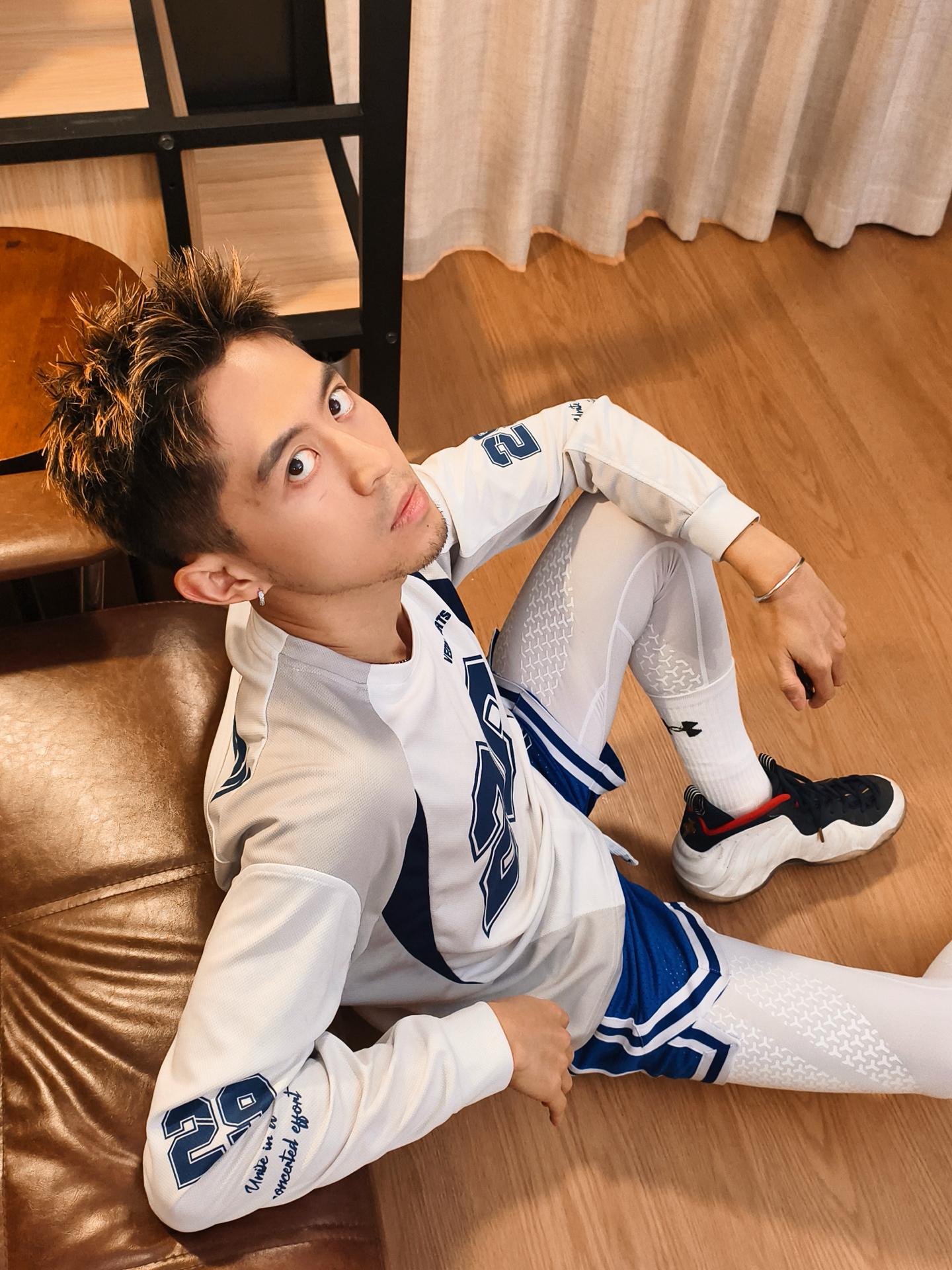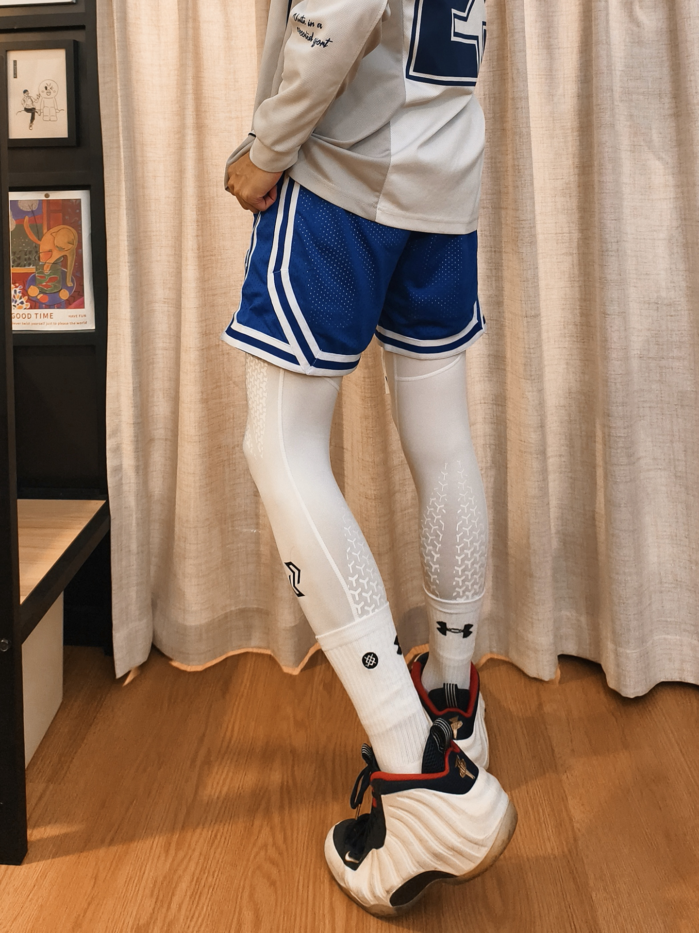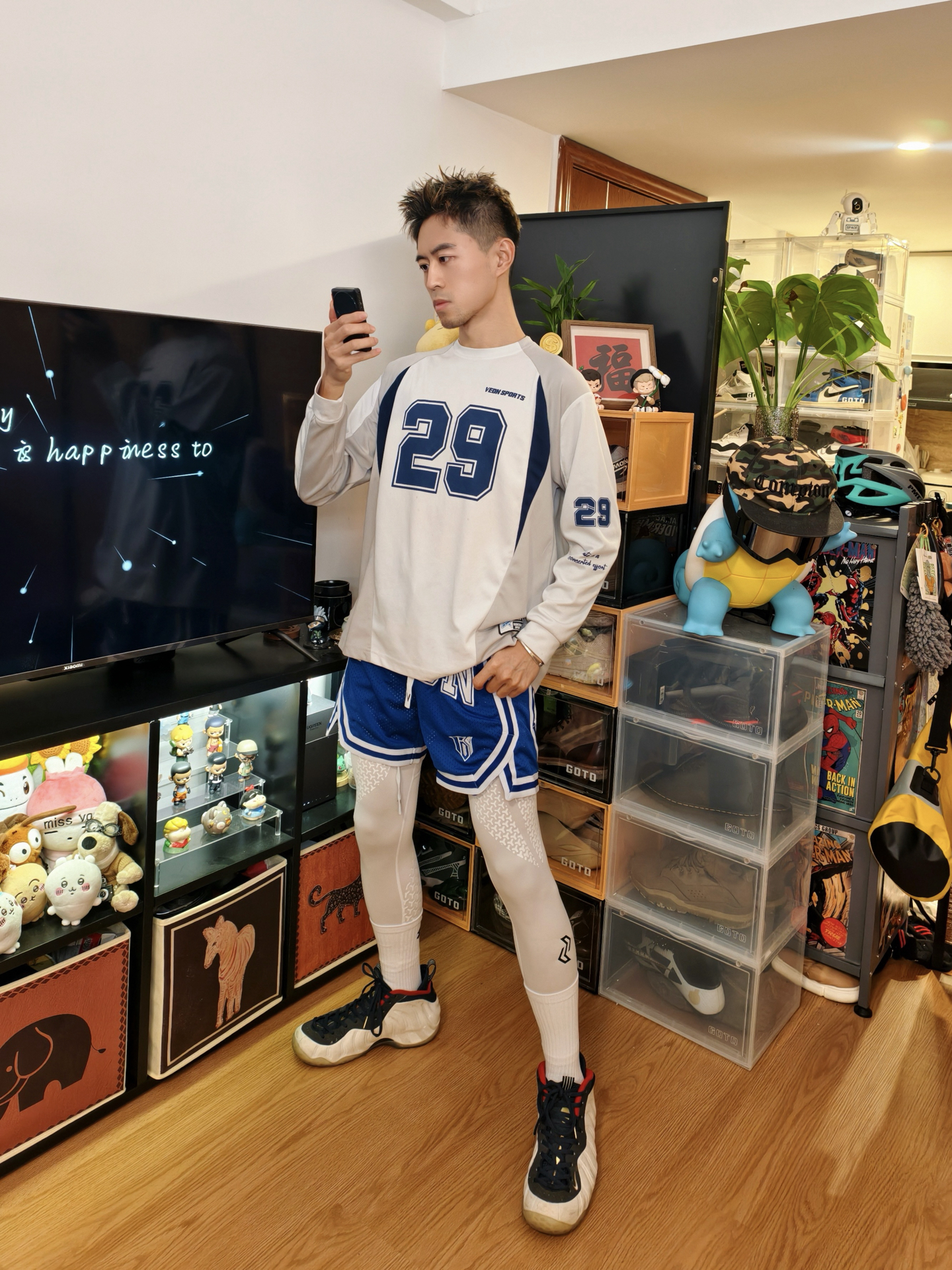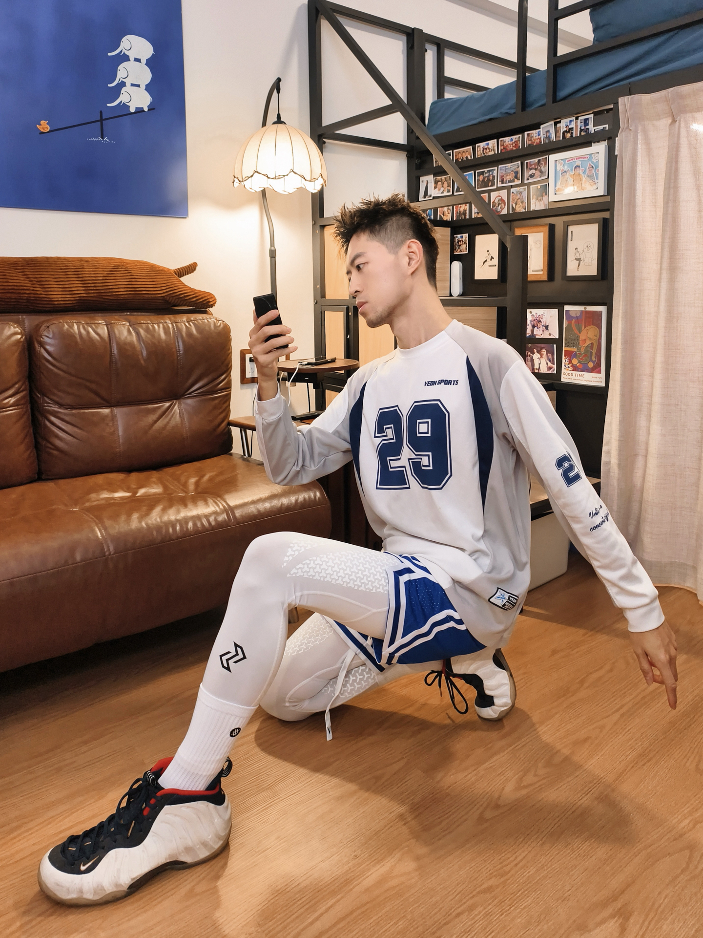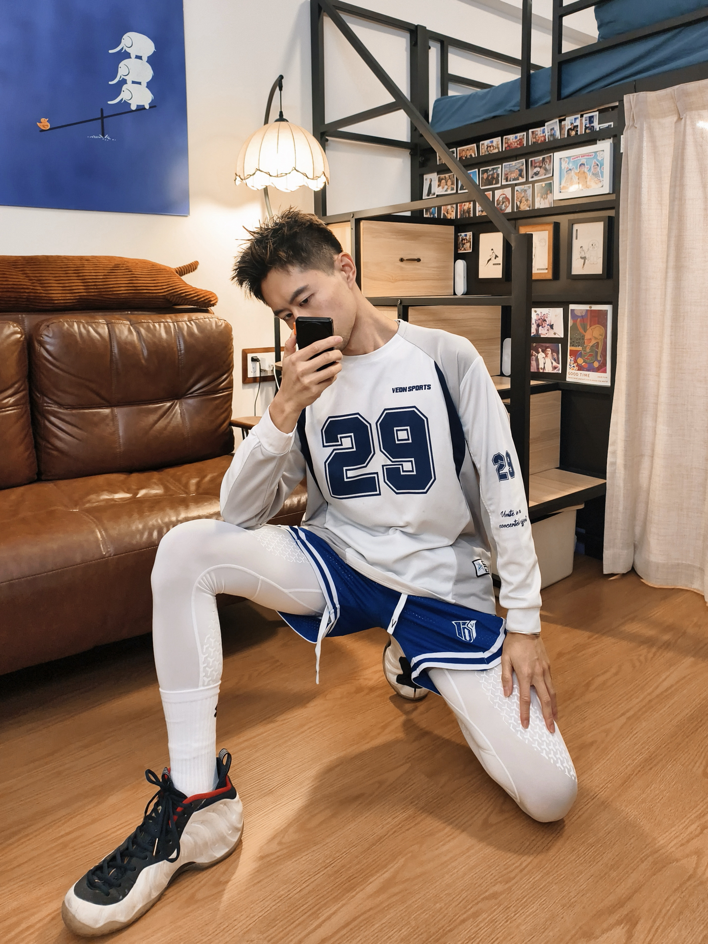 👕白蓝数字长袖版型宽松随性,大“29”印花自带赛场张力,透气面料贴肤不闷,训练、出街都适配,运动松弛感一下就到位了。 🩳蓝白拼色短裤细节利落,侧边条纹强化篮球风格,叠穿白色高弹紧身裤既适配微凉天气,又添了运动层次感,蹲坐活动都自在。 👟奥运喷真的很酷!简直是街头运动的经典标配,鞋型和整套风格高度契合,踩上就走超省心,直接焊死美式赛场氛围。 – #休闲运动风短裤穿搭 #街头篮球T恤 #篮球生冬日...