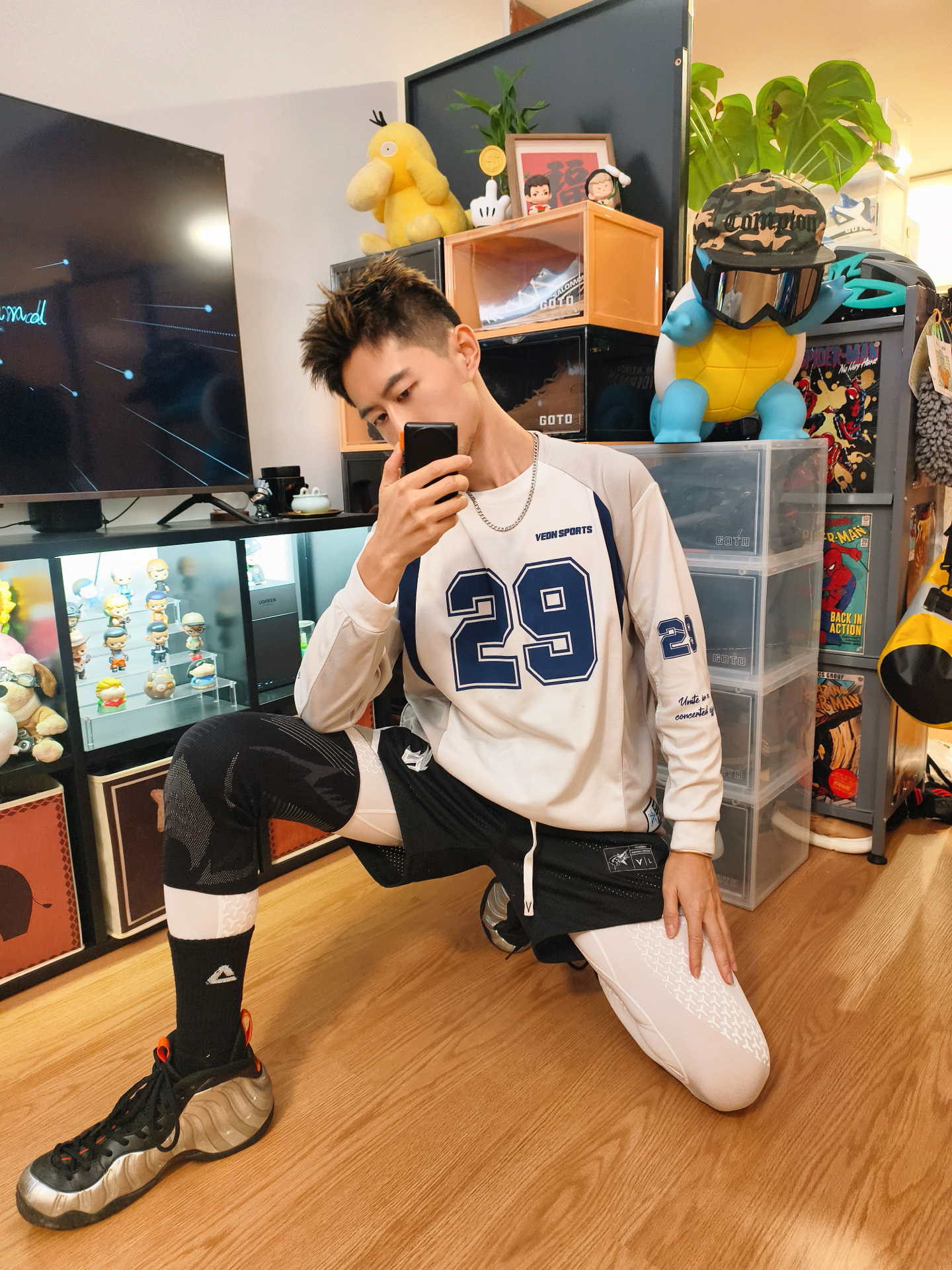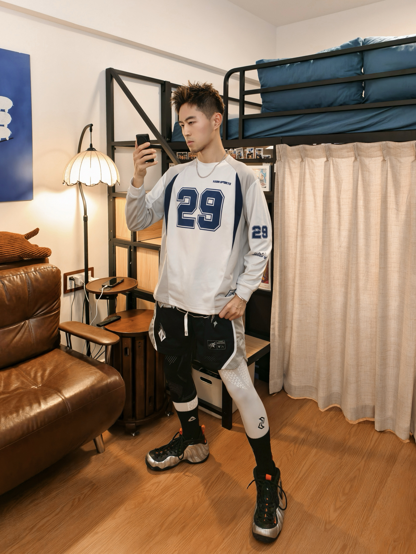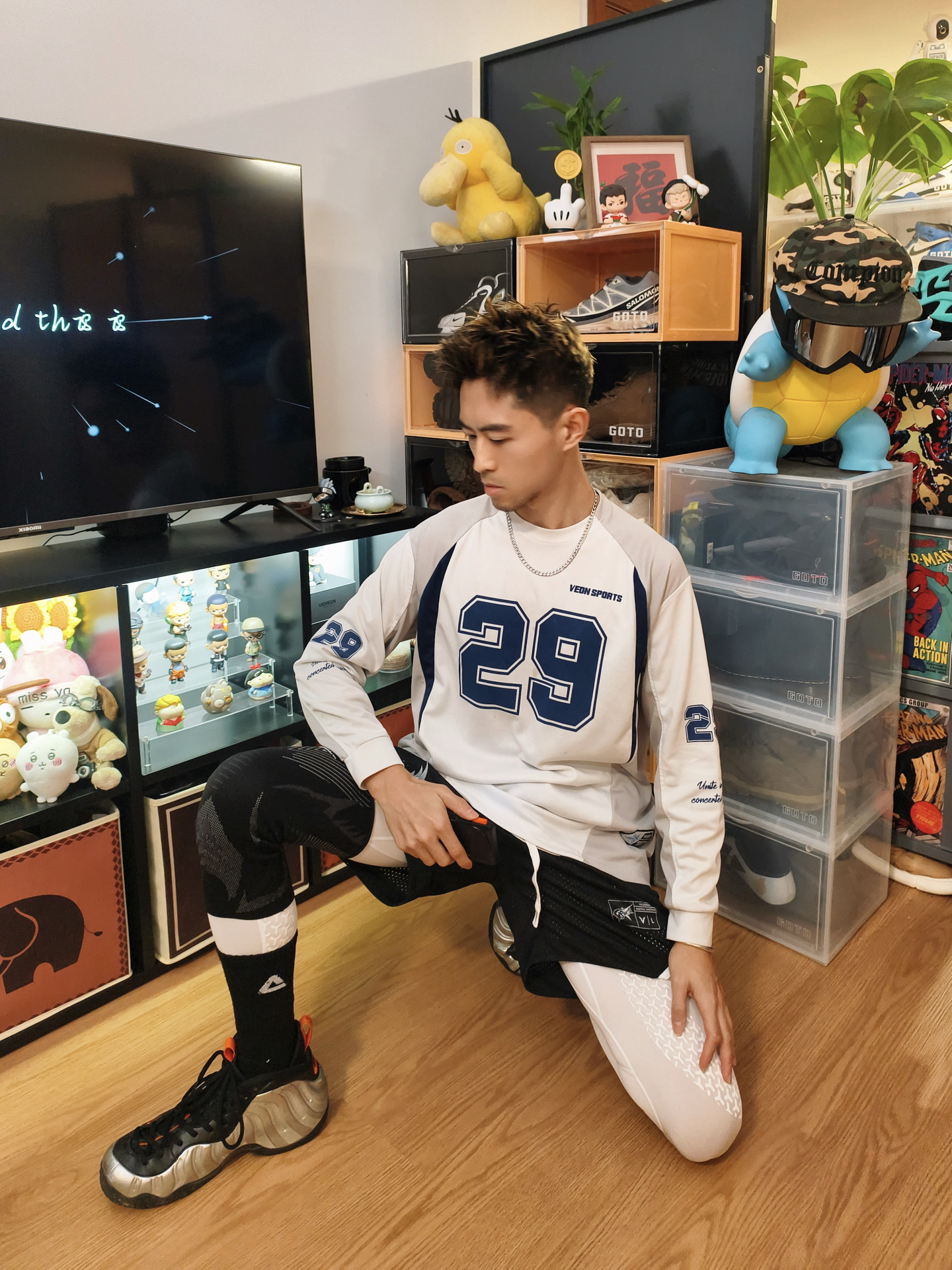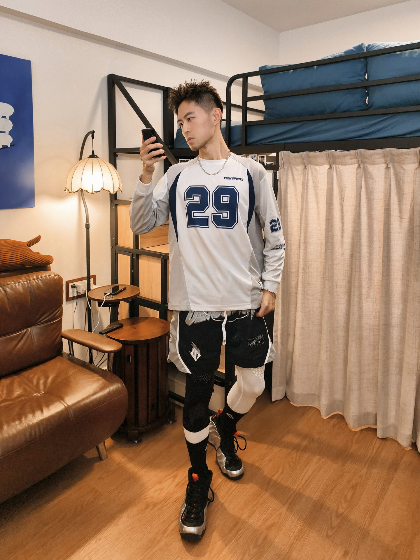 👕白蓝数字长袖版型宽松随性,大数字印花自带赛场张力,透气面料贴肤不闷,训练、出街都适配,运动松弛感一下就到位了。 🩳黑灰拼色短裤细节利落,叠穿黑白拼接紧身裤+护膝是核心亮点:护膝兼顾运动防护与造型层次,和整套穿搭的球员属性高度契合,蹲坐跑跳都自在。 👟万圣节喷是球员风的经典标配,鞋型和护膝、紧身裤的运动感呼应,踩上就走超省心,直接焊死赛场氛围。 – #篮球服穿搭 #篮球风穿搭 #体育生穿搭日常...