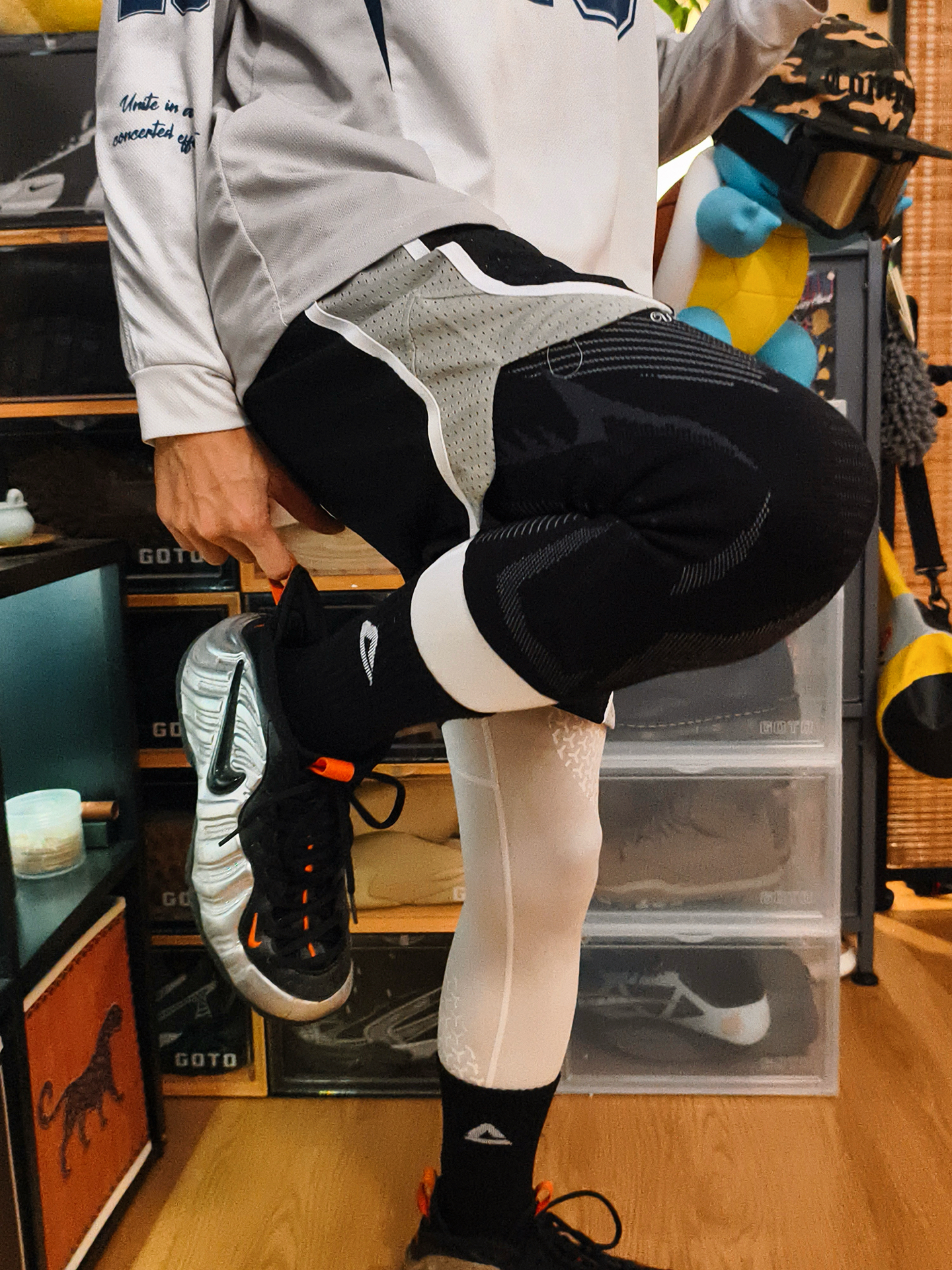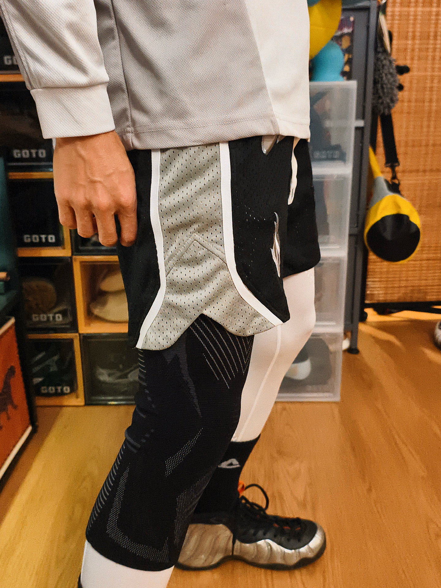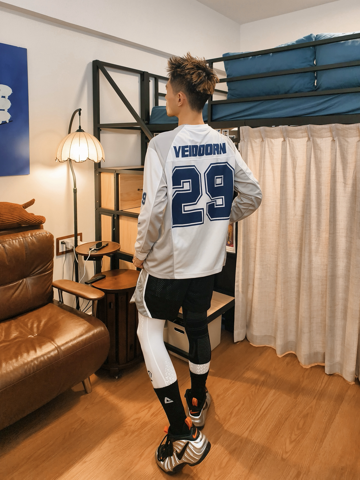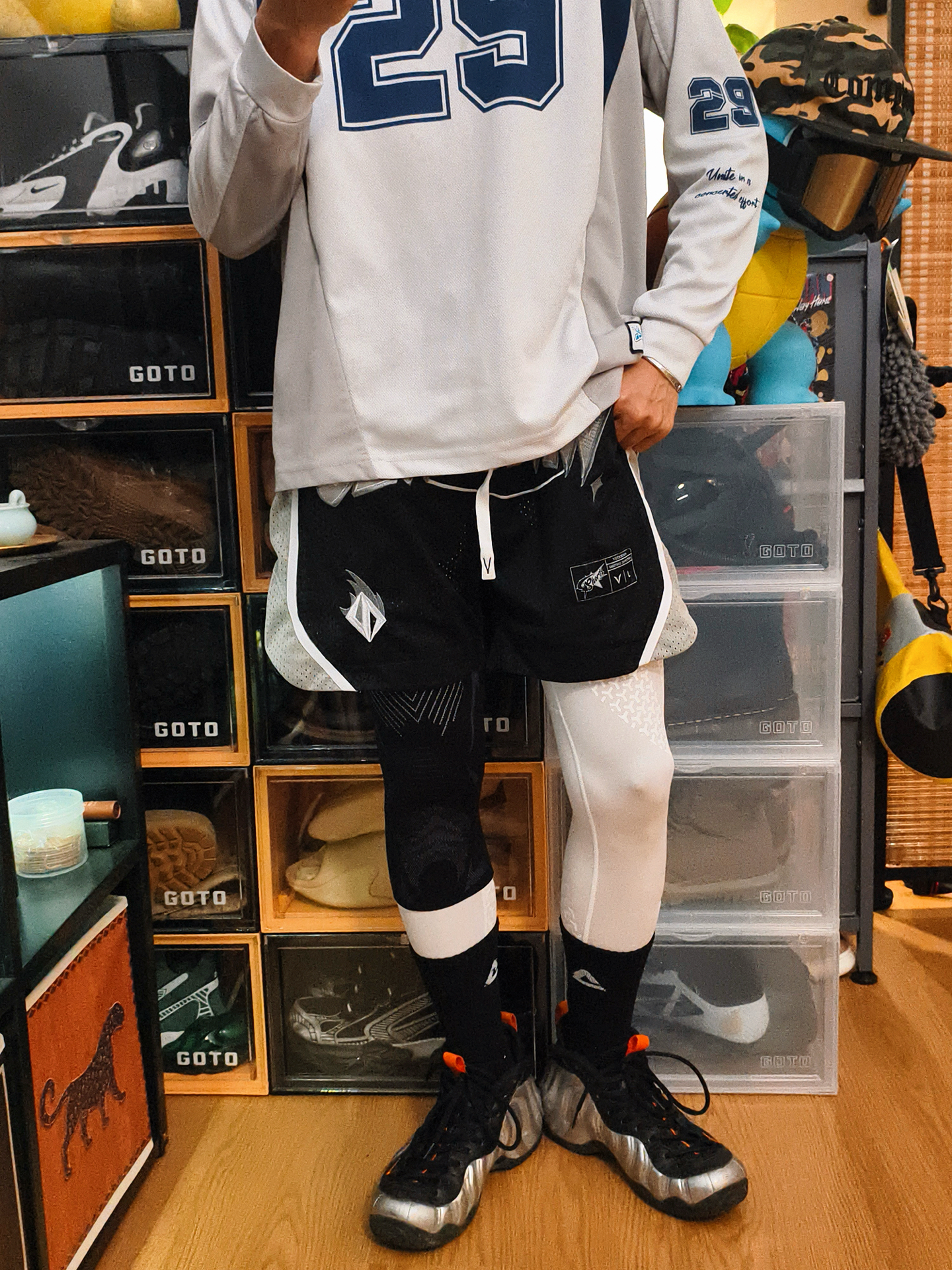 👕白蓝数字长袖版型宽松随性,大数字印花自带赛场张力,透气面料贴肤不闷,训练、出街都适配,运动松弛感一下就到位了。 🩳黑灰拼色短裤细节利落,叠穿黑白拼接紧身裤+护膝是核心亮点:护膝兼顾运动防护与造型层次,和整套穿搭的球员属性高度契合,蹲坐跑跳都自在。 👟万圣节喷是球员风的经典标配,鞋型和护膝、紧身裤的运动感呼应,踩上就走超省心,直接焊死赛场氛围。 – #篮球服穿搭 #篮球风穿搭 #体育生穿搭日常...