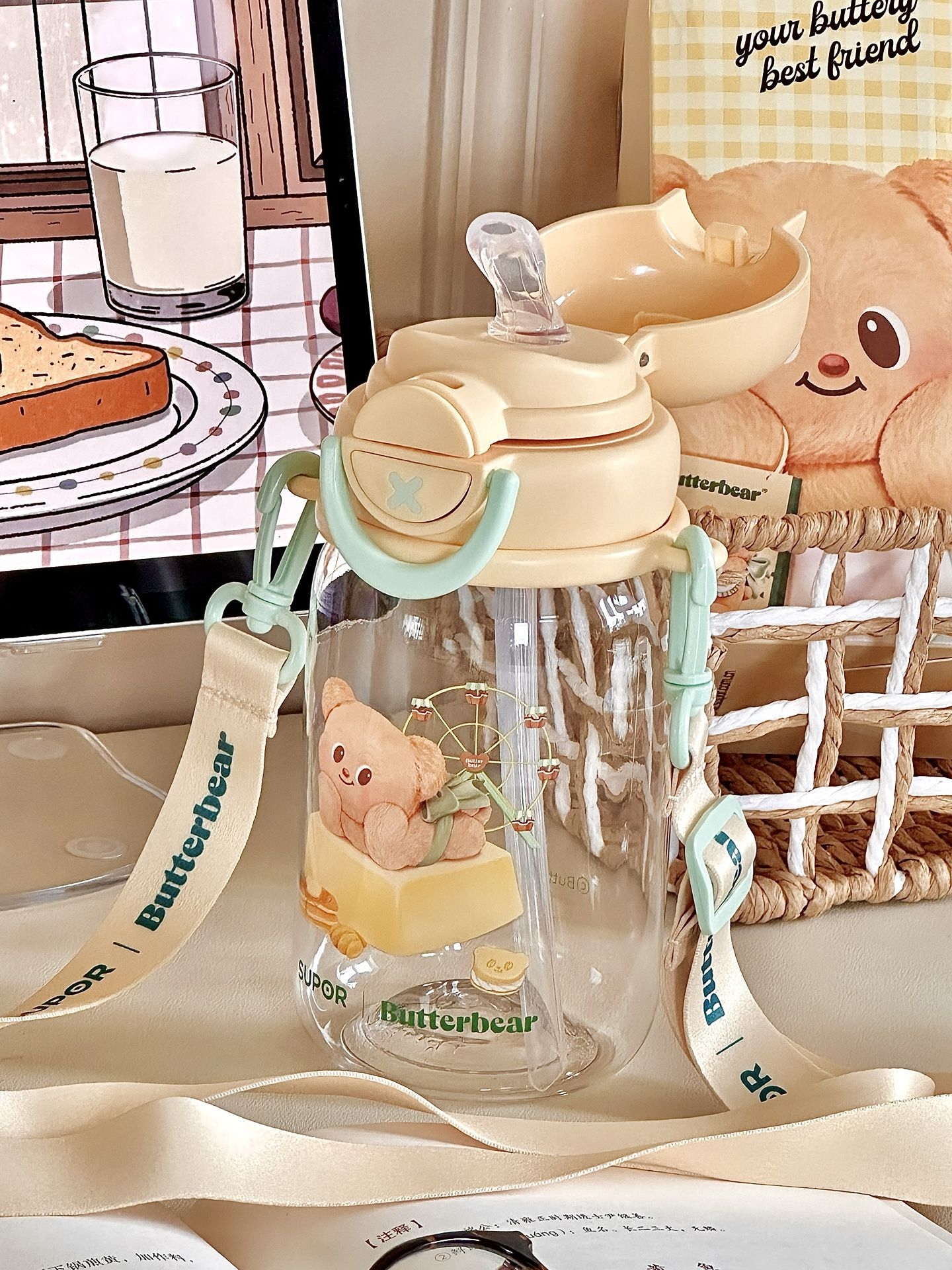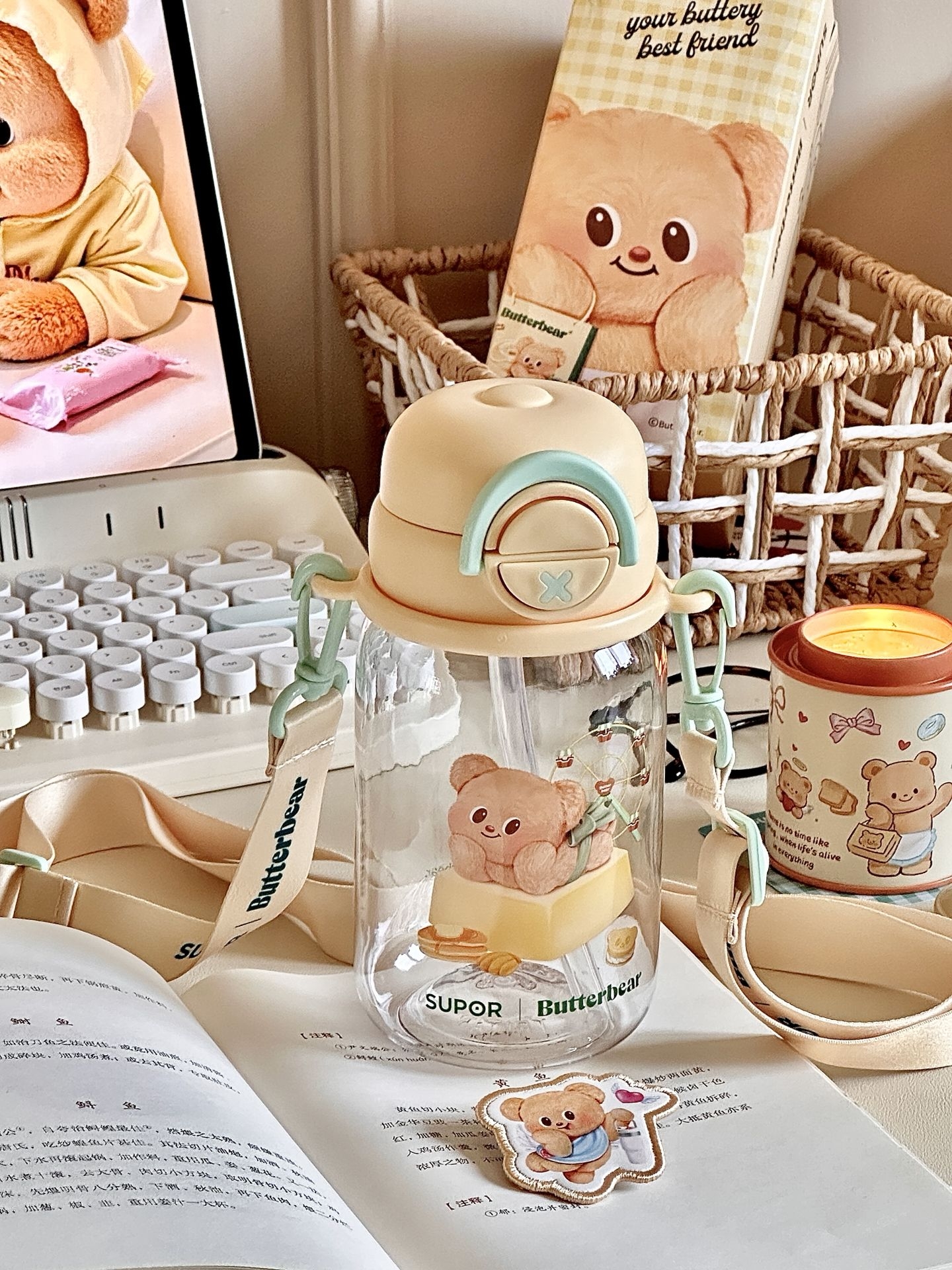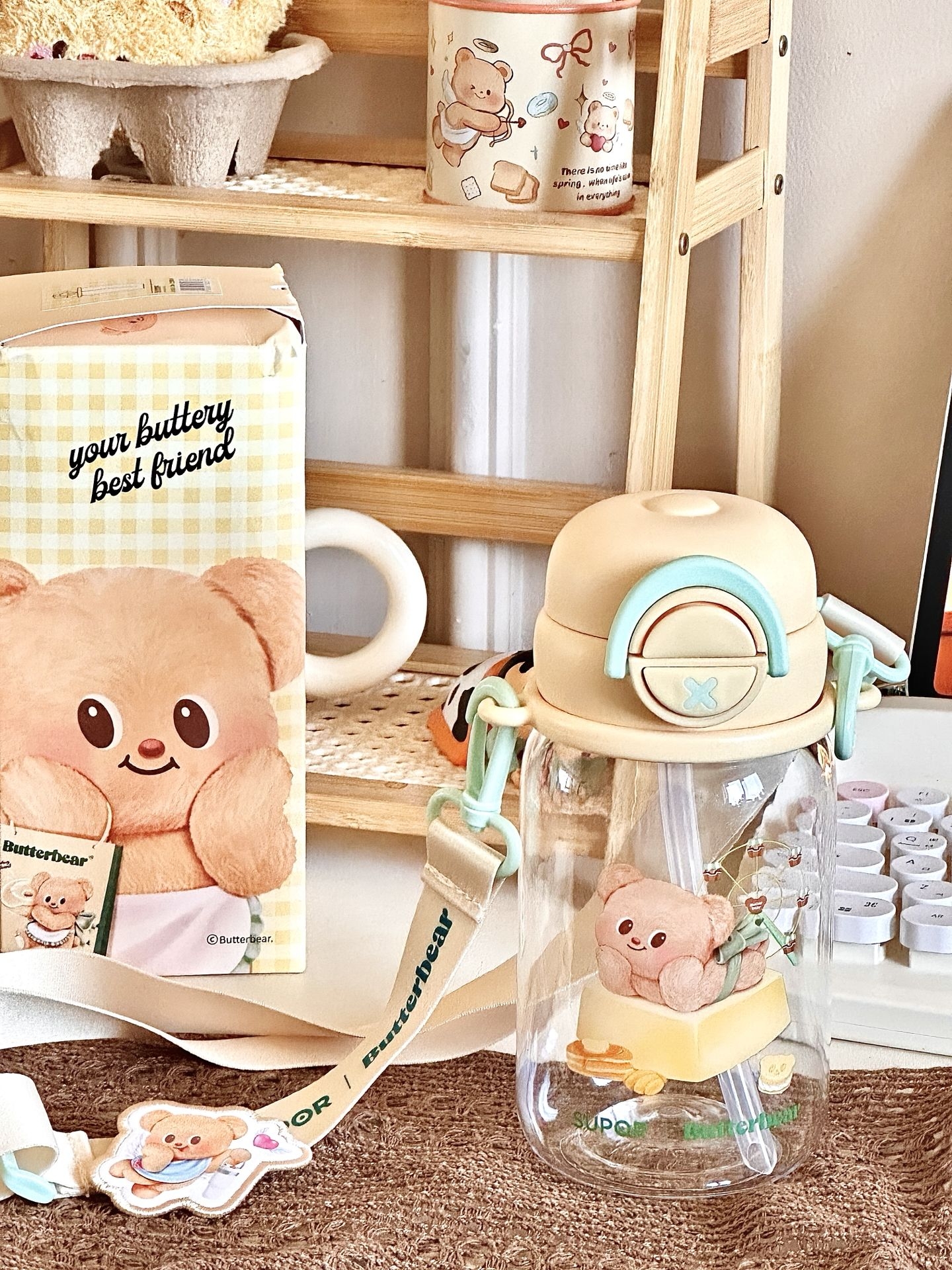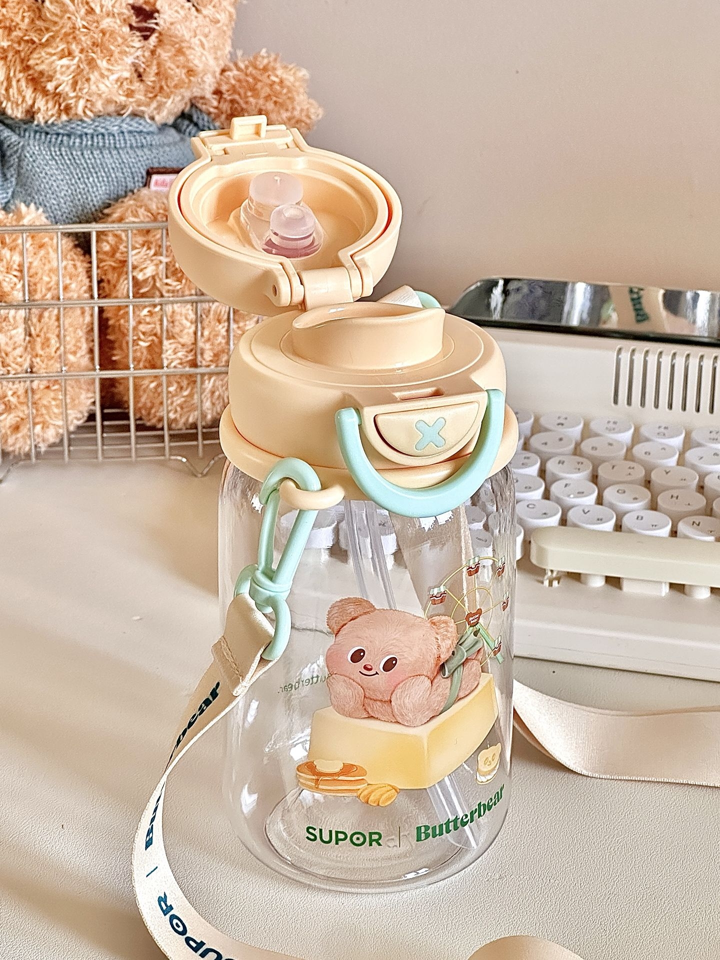 #一件入春的多巴胺好物 给你们展示一下我的黄油小熊水杯 夏天放上冰块🧊真的拒绝不了啊 而且我试过怎么晃都不漏水 我还专门选了这种背带款式 能够背着出门,用吸管喝一大口冰水 这高温天也太太太太太舒服了吧! #五一出游好物 #可爱卡通高颜值水杯 #适合做礼物的宝藏水杯 #夏日标配水杯