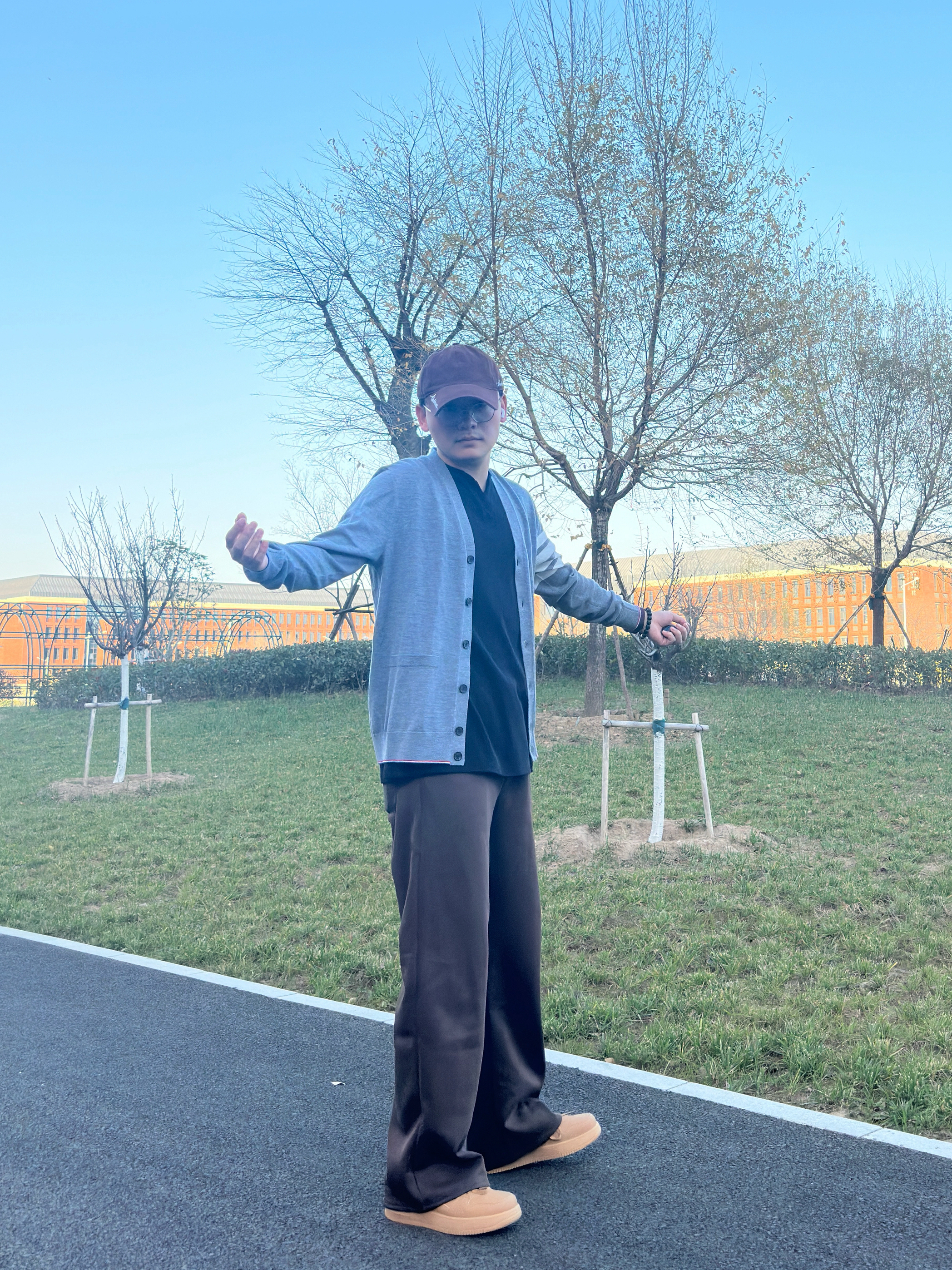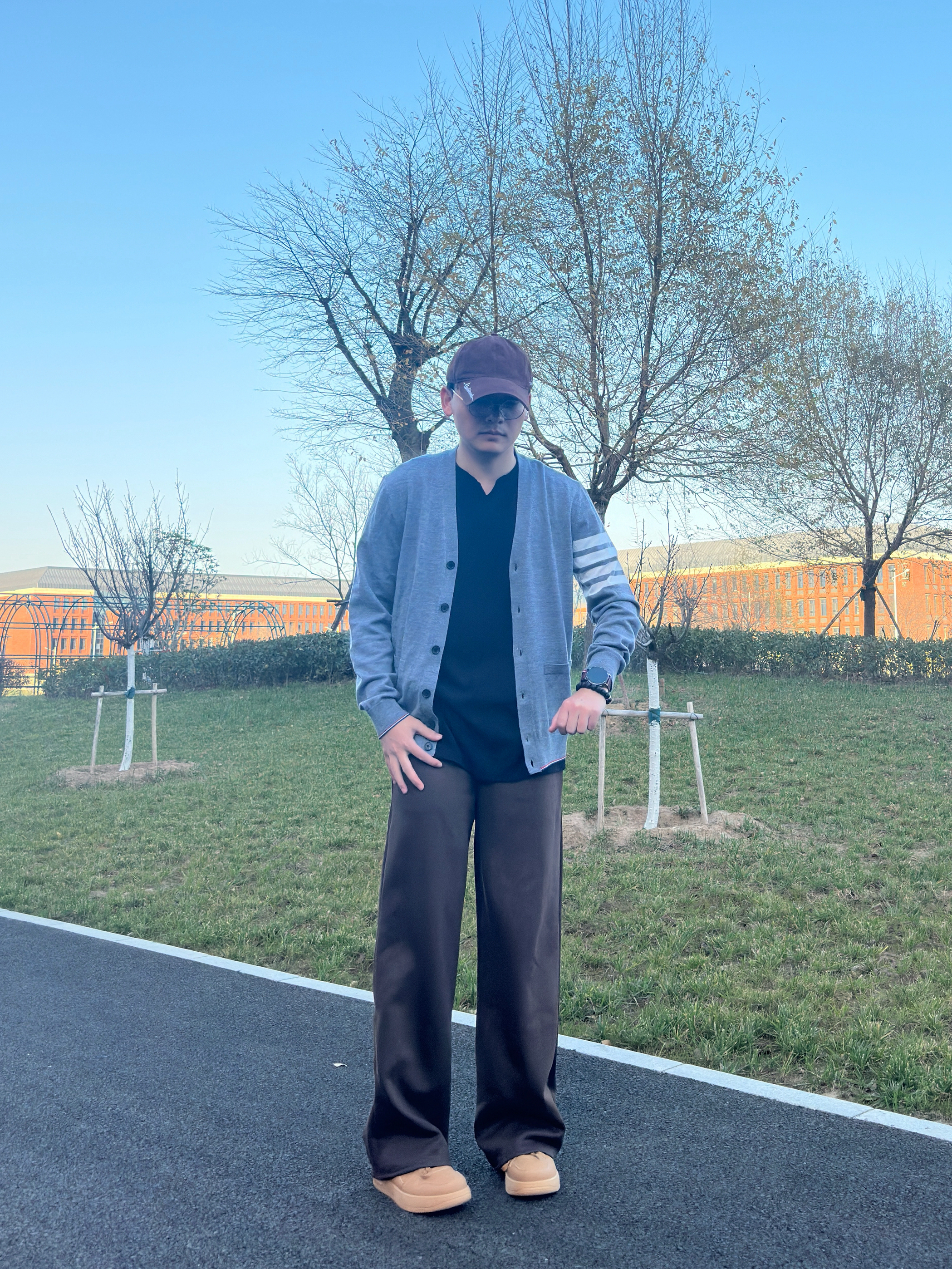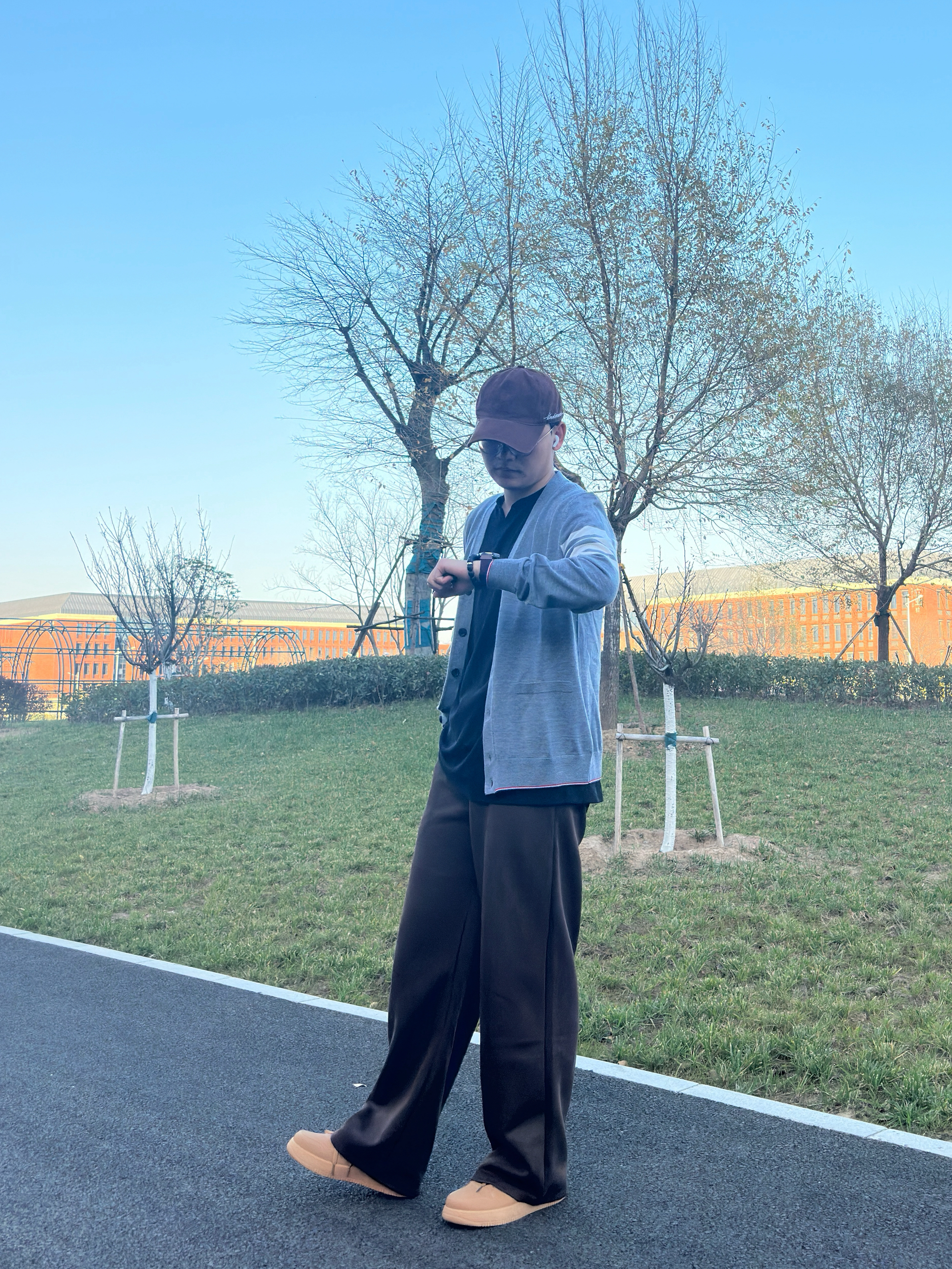 今天这身直接戳中我日常穿搭命门——舒服还能打! 灰开衫的软乎乎是摸得到,袖子三条杠悄悄提了点精致度,敞开穿刚好藏住内搭的小随性👕 棕阔腿裤 ALEXANDRO FRATELLI 板正得体,配焦糖色厚底鞋,把“不费力的高个子”焊在腿上了🦵 整套下来,教室→咖啡角→图书馆无缝切换,暖调配色自带秋日滤镜,连风裹在身上都软乎乎的🍂 不用费脑搭,舒服到想焊在身上,这大概就是早八人的关键词“精致摆烂”