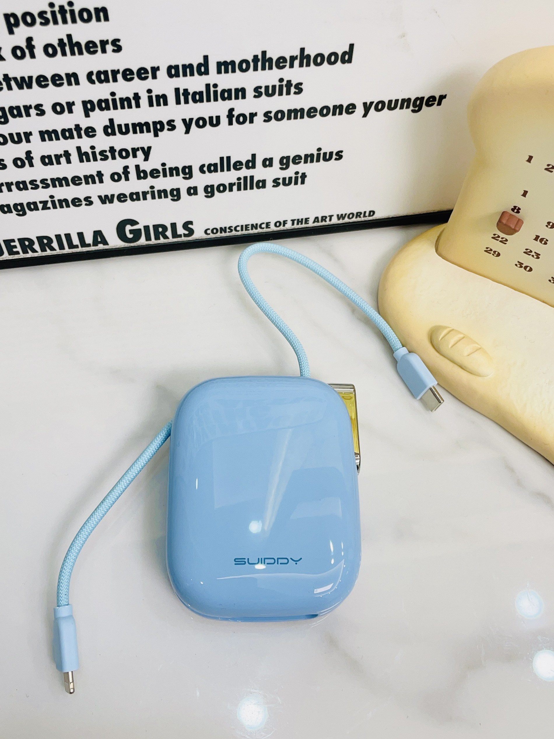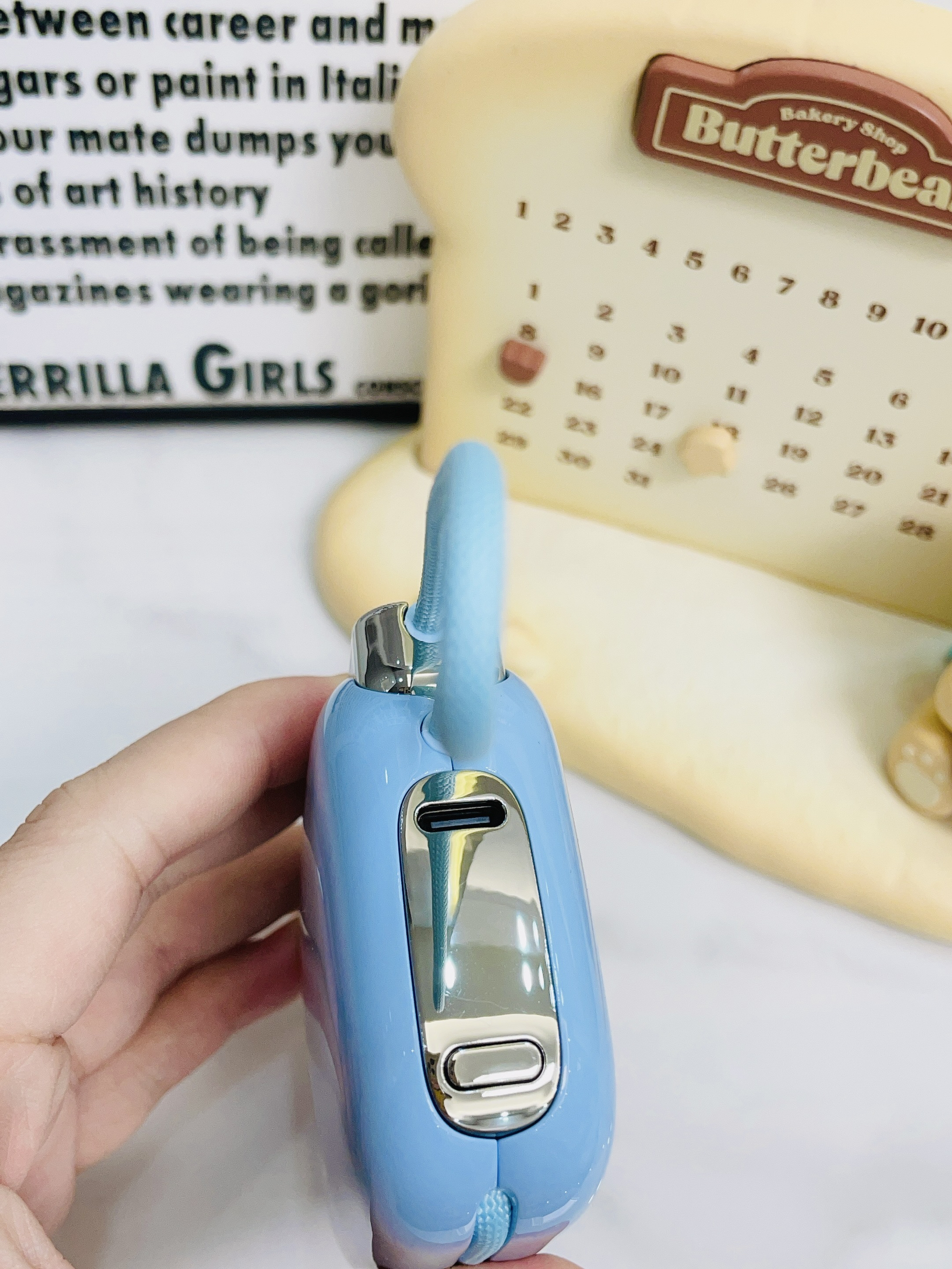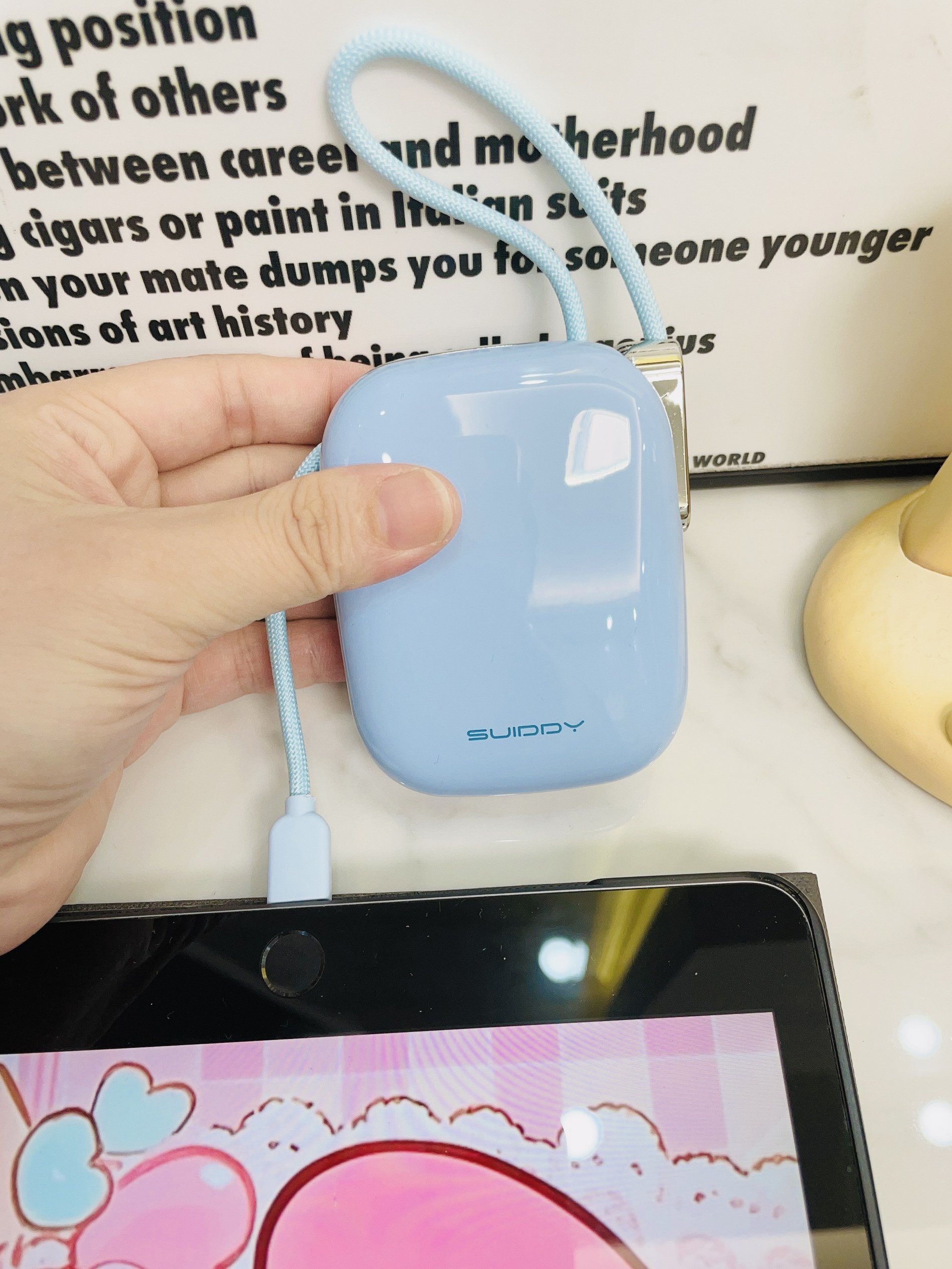 这不十二月啦又是年末的时候 我给自己安排了新的充电宝 这款充电宝蓝色好好看啊 双头数据线可以一次性充两个设备 我感觉还蛮方便的 1w毫安的容量能用蛮久的 小小一个 出门携带放包包都可以 盒子包装 圣诞用来送礼也可