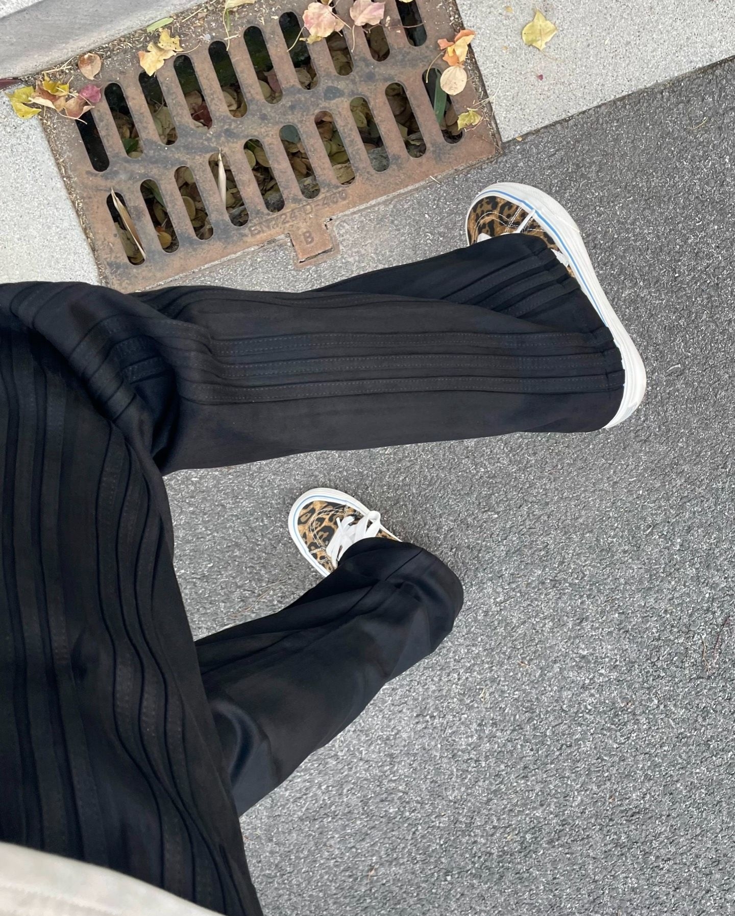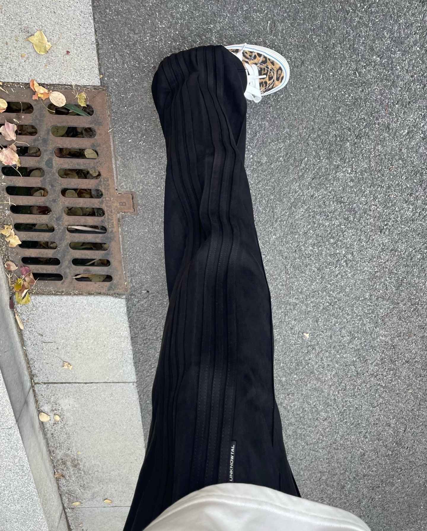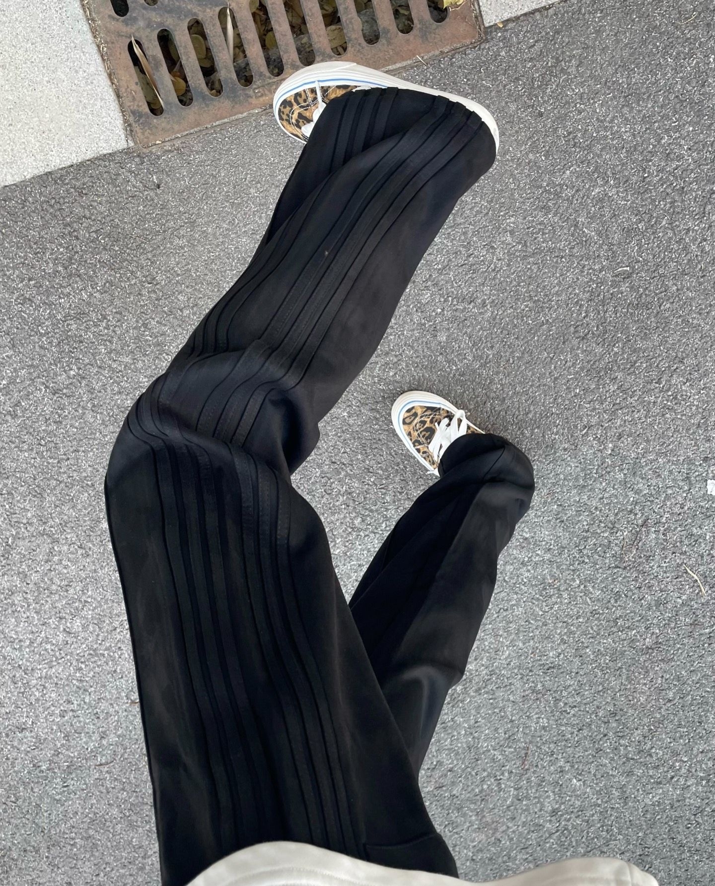不得不说冬天穿这条麂皮休闲裤太爽了哈哈哈 直筒的版型男女穿都可以 面料摸起来厚实有质感 侧面三条杠设计俺很喜欢 搭配一双板鞋看起来更显腿长了 好爱这种搭配!
