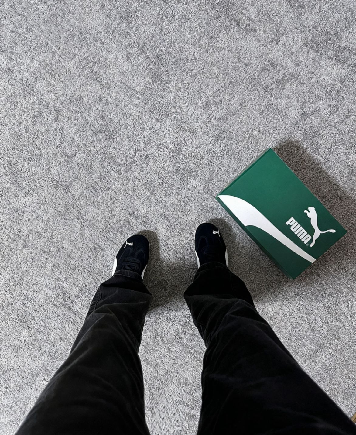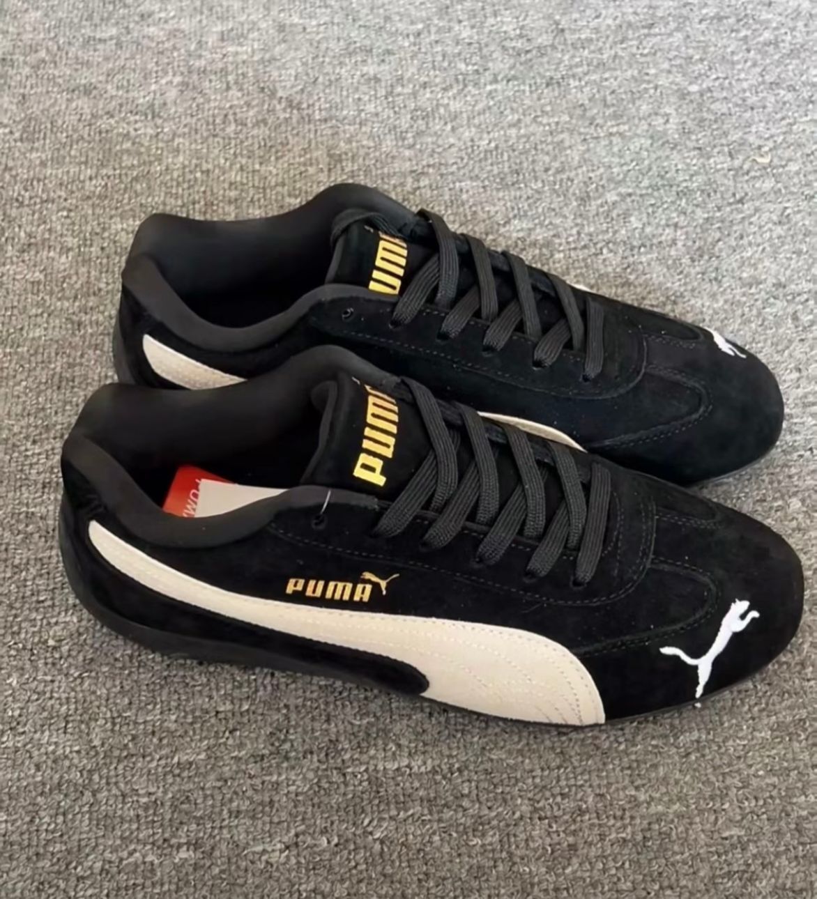今日分享PUMA赛车鞋黑色😎已经穿了有两个月了,当时红色也很热门🔥🔥🔥🔥,但是红色真的不好搭配,我选择了黑色。 鞋面采用了黑色绒面革拼接白色绒面革,美洲狮部分是刺绣的,这个小细节确实还不错,鞋侧以及鞋后跟处小logo烫金点缀,性价比来说还是比较适中。