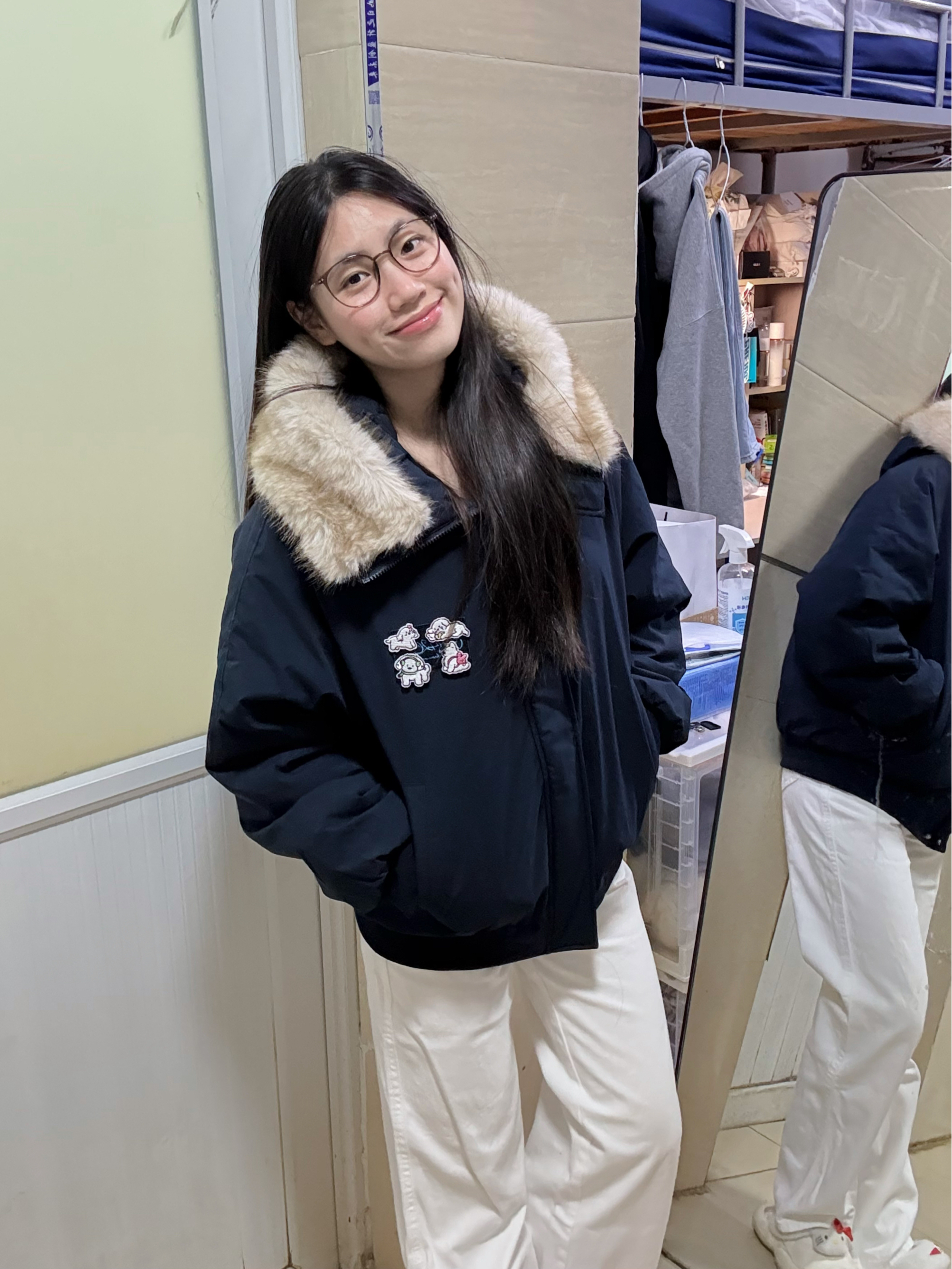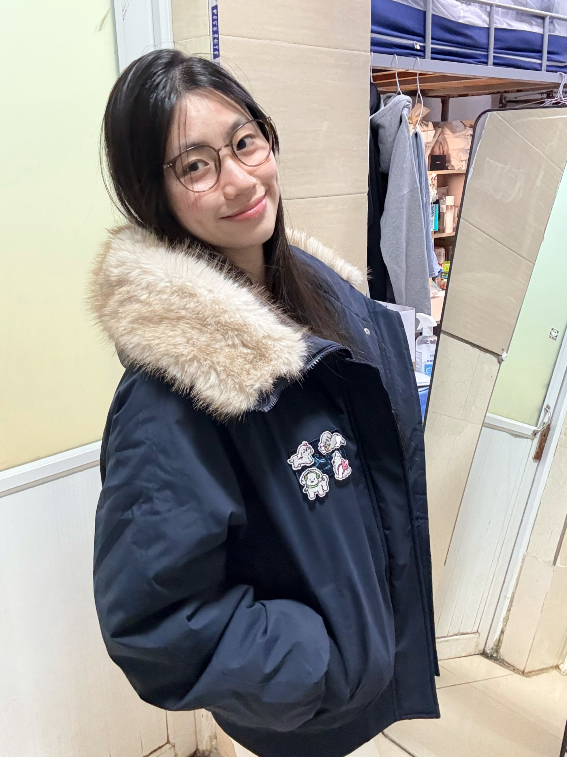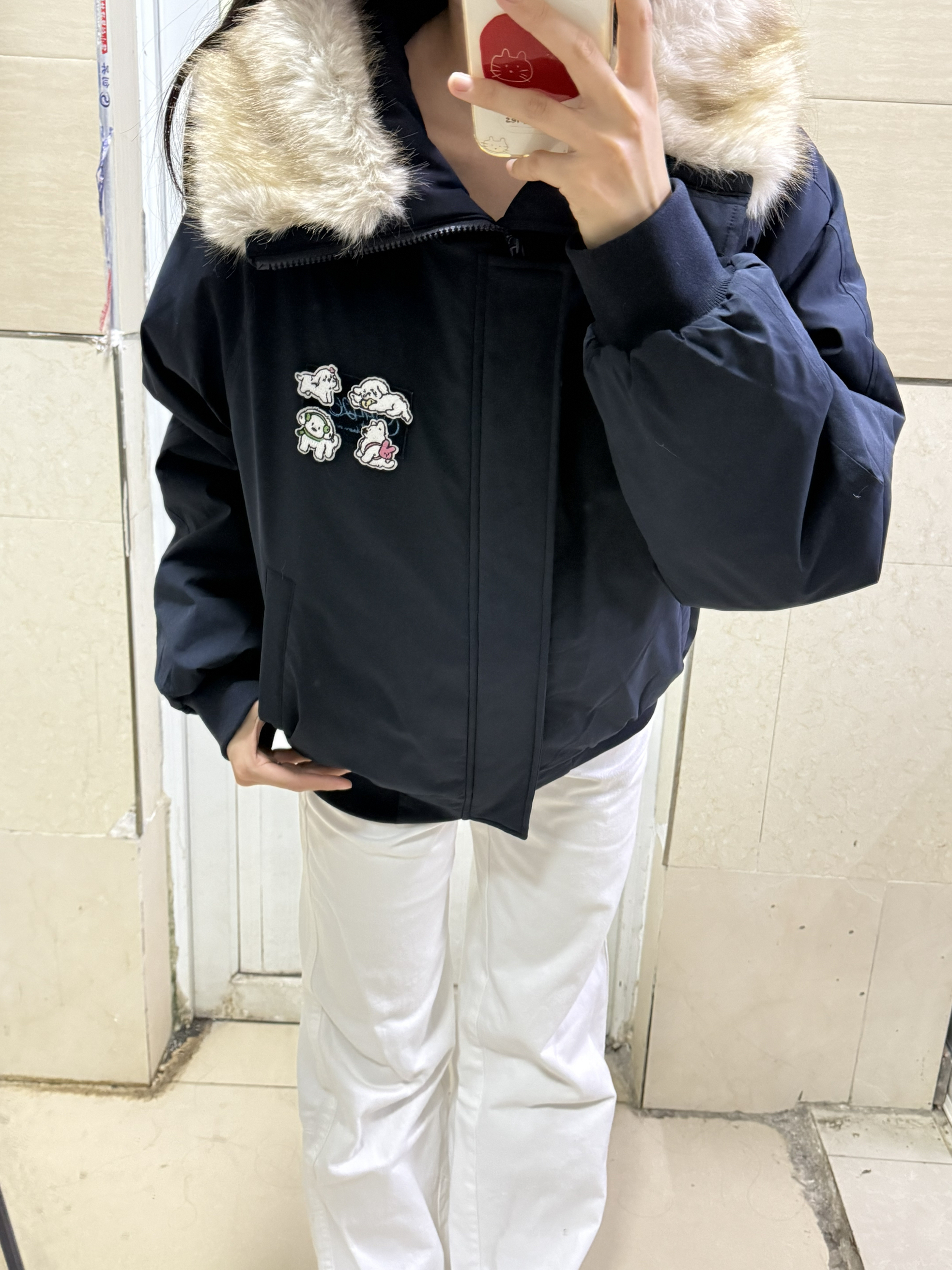 166 102穿的是M码 还带了一个大毛领摸起来软乎乎的 而且胸前还做了小狗贴布 好可爱呀 喜欢的宝宝可以参考一下哦