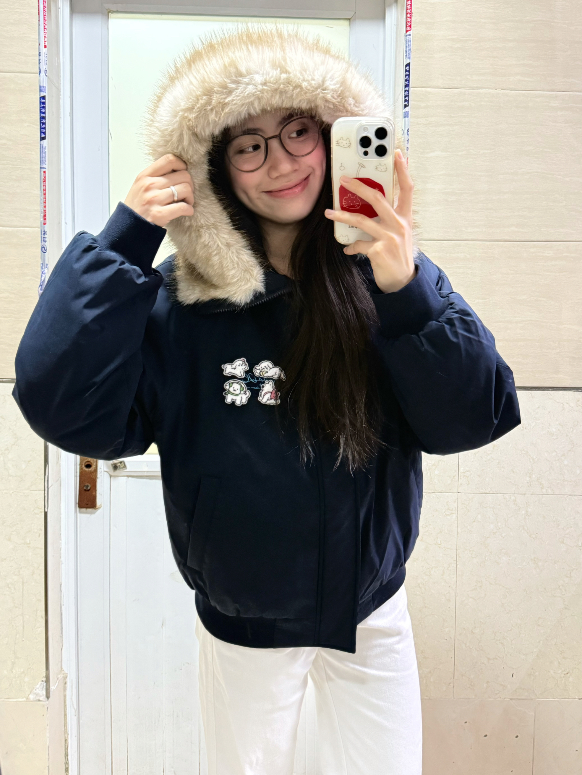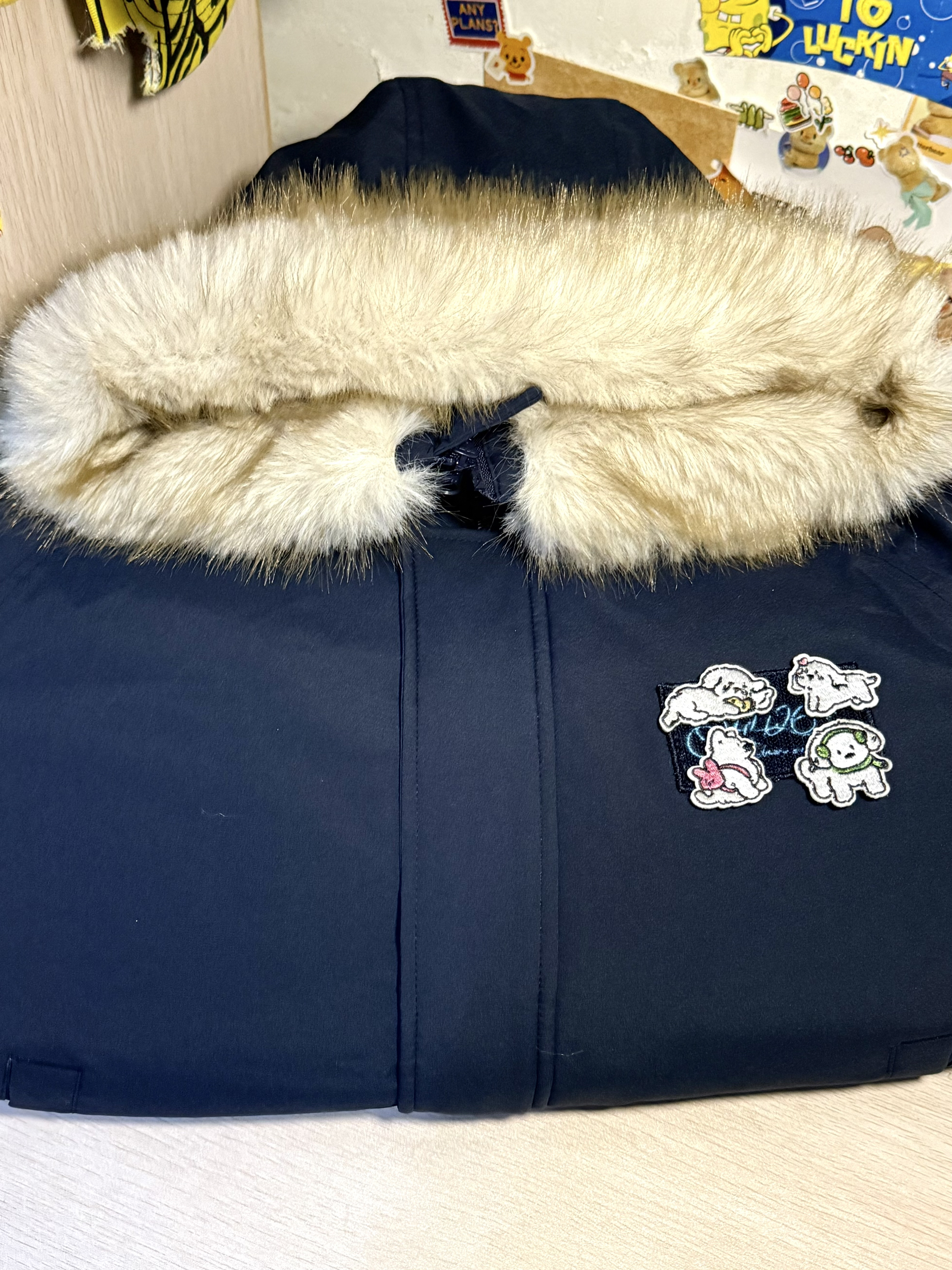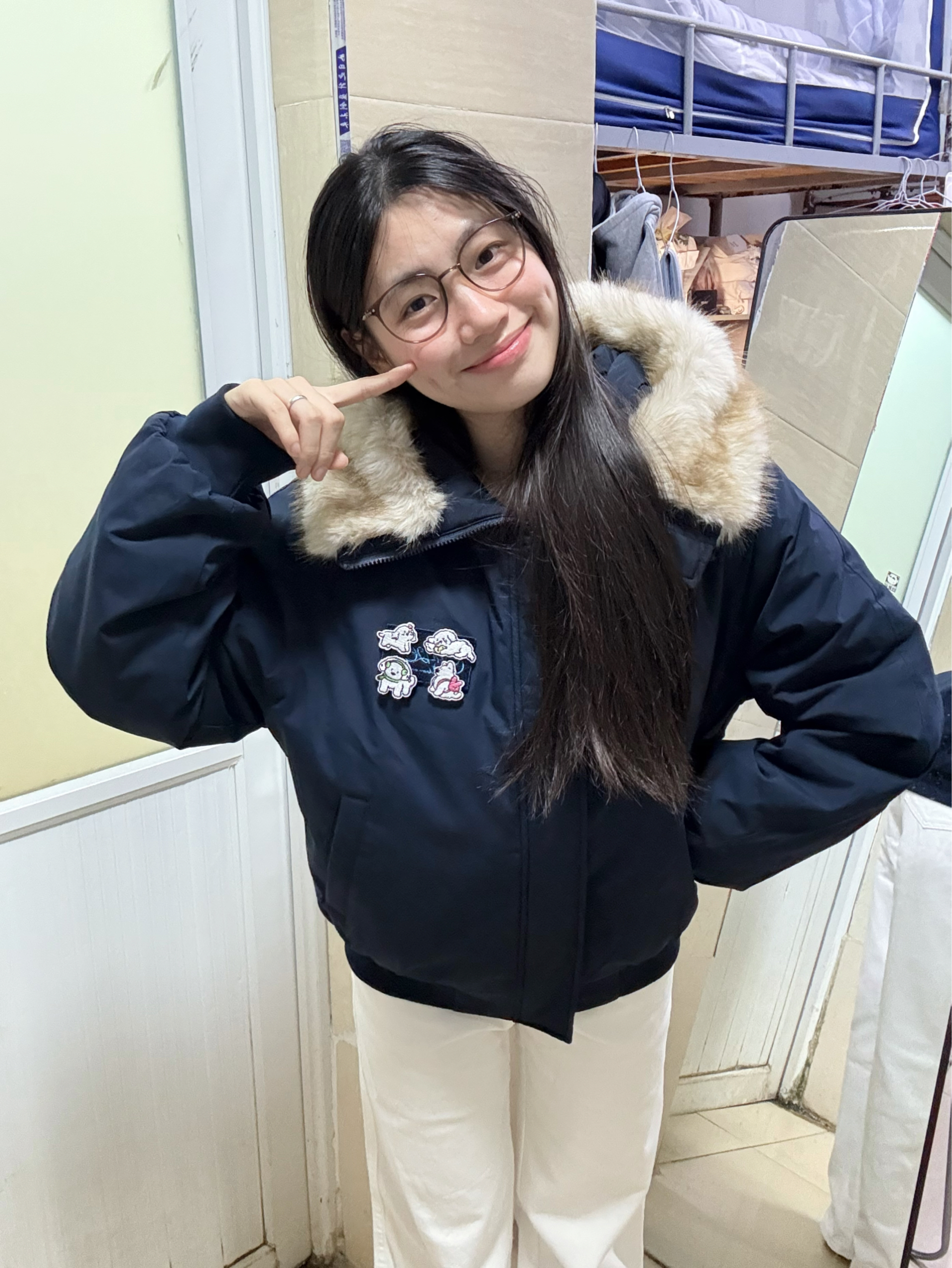 166 102穿的是M码 还带了一个大毛领摸起来软乎乎的 而且胸前还做了小狗贴布 好可爱呀 喜欢的宝宝可以参考一下哦