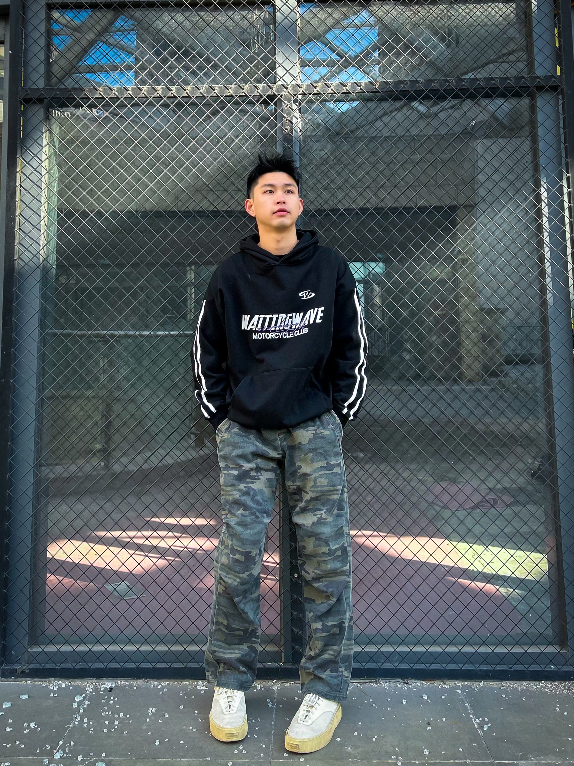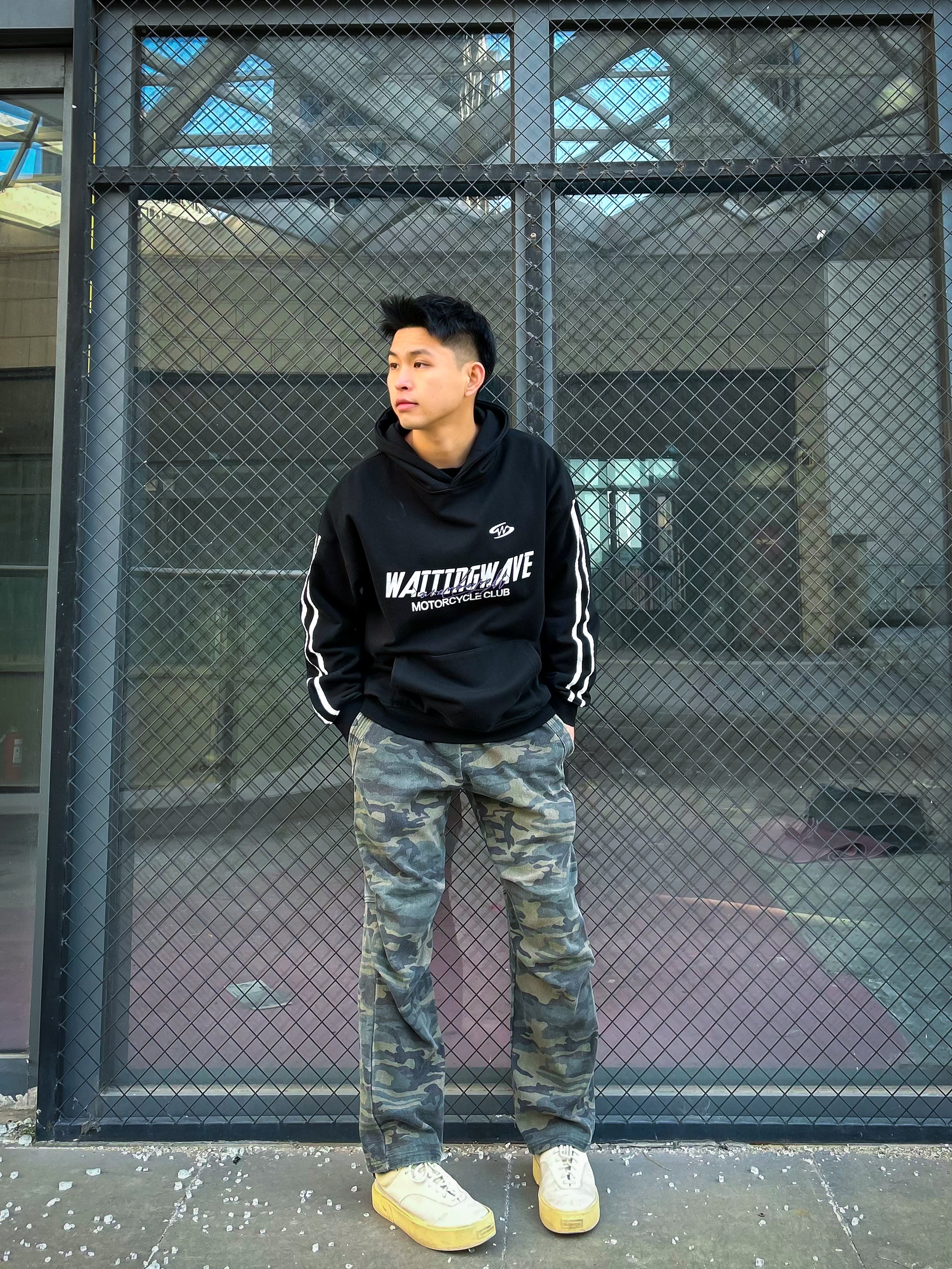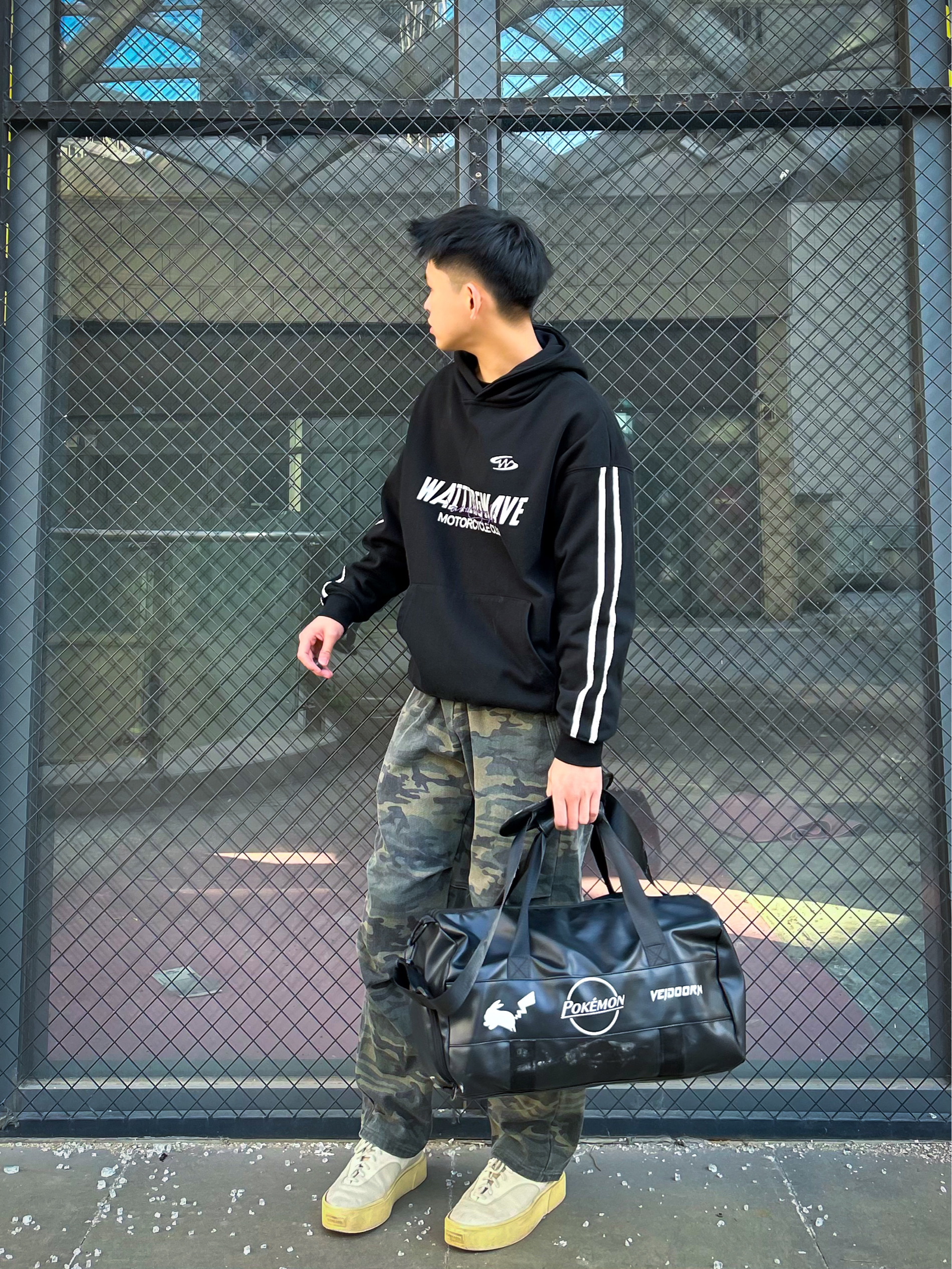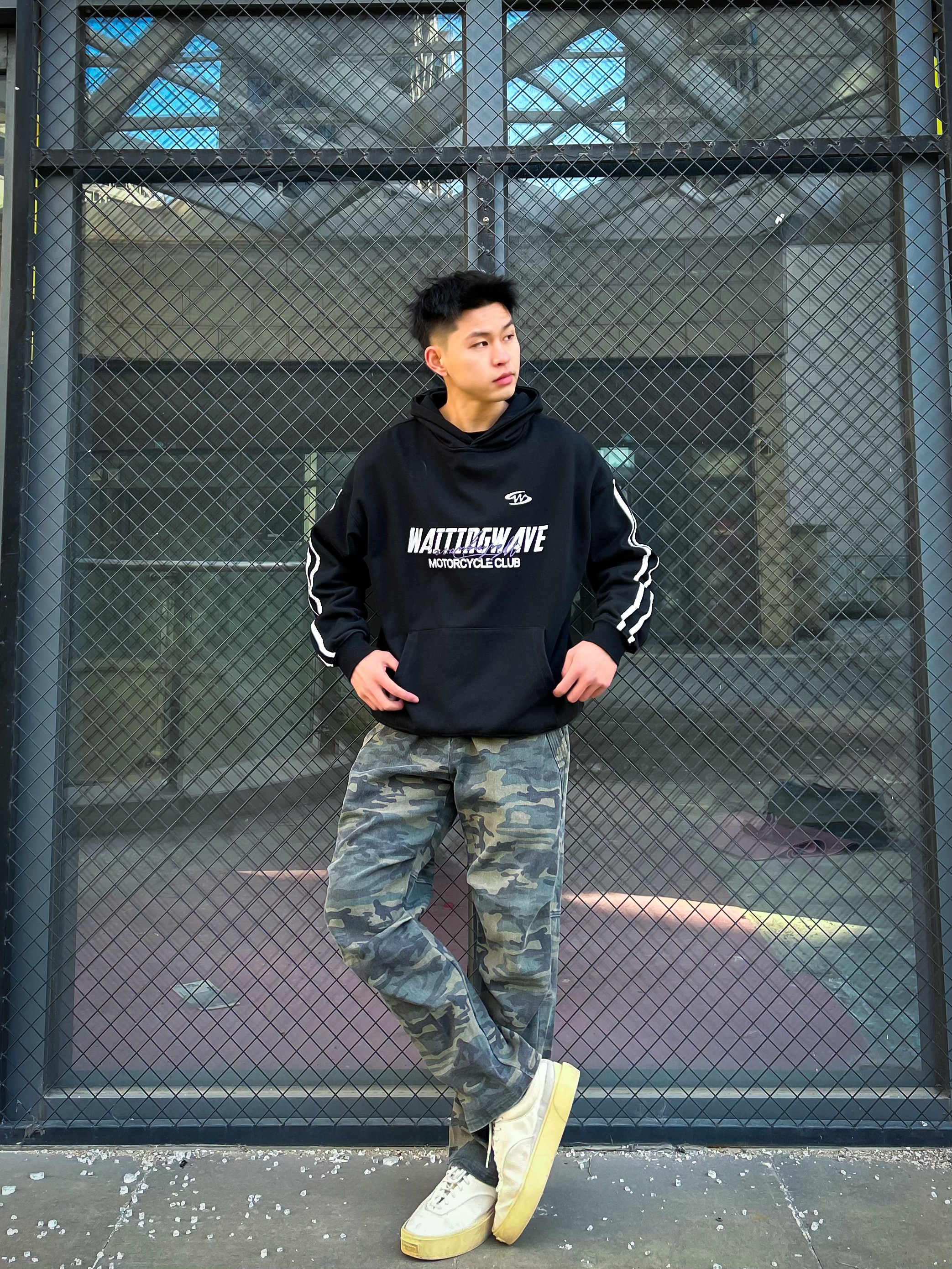 哈咯,这里是爱打球爱穿搭的卢_SG 年度穿搭秋冬美式潮酷运动风直接拿捏! 上身:黑色字母连帽卫衣 加绒面料适配秋冬低温,衣身美式印花+袖侧三条杠装饰,宽松版型既能藏肉,又能满足打球时的肢体舒展需求。 • 下身:迷彩工装阔腿裤 做旧迷彩纹理自带复古潮感,垂坠阔腿版型修饰腿型的同时,兼顾日常通勤与运动场景的舒适度。 • 配饰:做旧厚底鞋+印花运动包 浅色系做旧鞋平衡整体深色调,避免造型沉闷;黑...