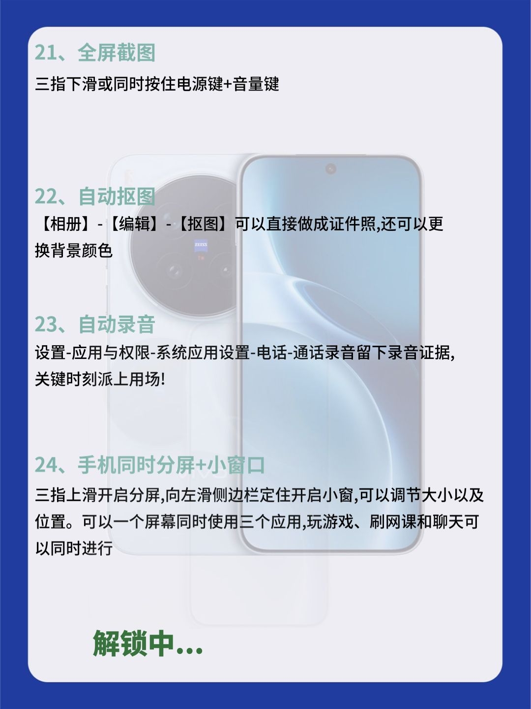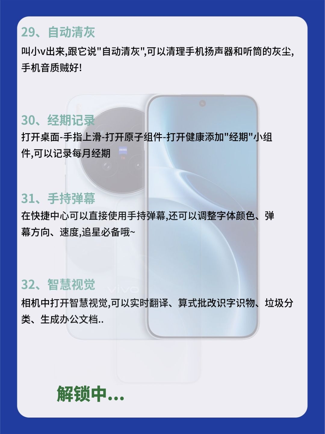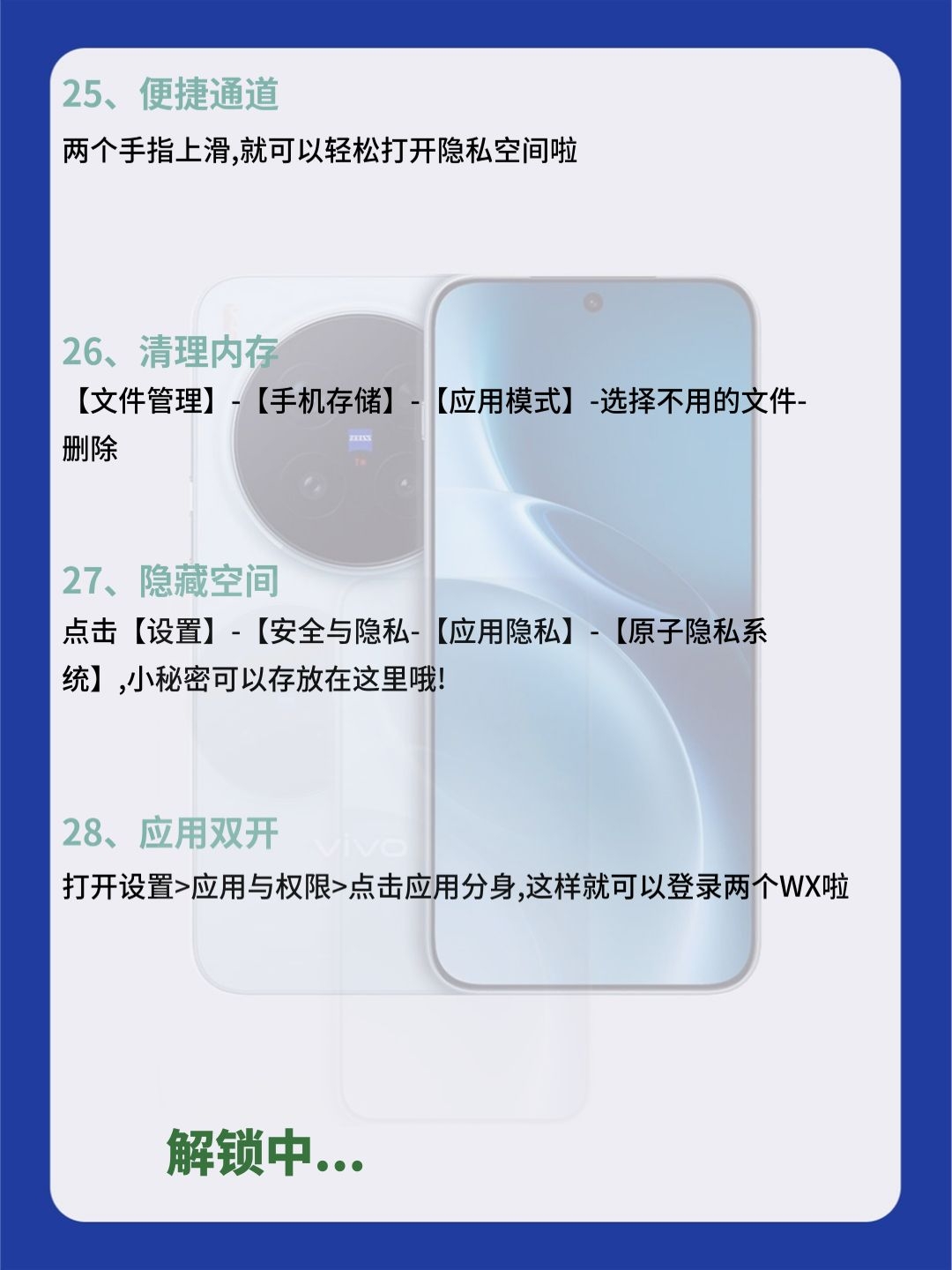 99% vivo 党都不知道!这32 个隐藏功能,快来试试吧! 宝子们!用 vivo 这么久才发现,手机里藏着超多宝藏功能!以前真是白用了… 今天把压箱底的 32个隐藏技巧全扒了!从刚需到彩蛋,每一个都超实用 【效率开挂】:三指截屏 + 花式裁剪,文档批注直接写,跨设备复制粘贴超丝滑,办公学习直接提速! 【实用刚需】:照片一键消路人,隐私保护锁重要文件,酒店防偷拍检测神器,日常用着超安心!...