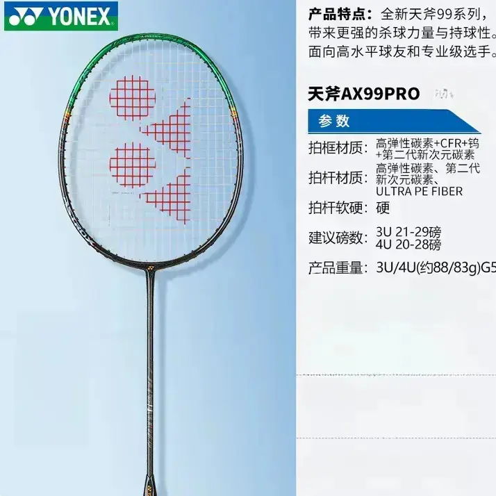 本篇笔记关联了YONEX/尤尼克斯 天斧系列 天斧99PRO AX99PRO 明星款 进攻型 耐打 控球 连钉设计 防守 默认穿线 杆硬 拍头重 专业级 耐用精准 全碳素 羽毛球拍 陨石绿等商品,为用户提供真实的使用体验和购买参考。