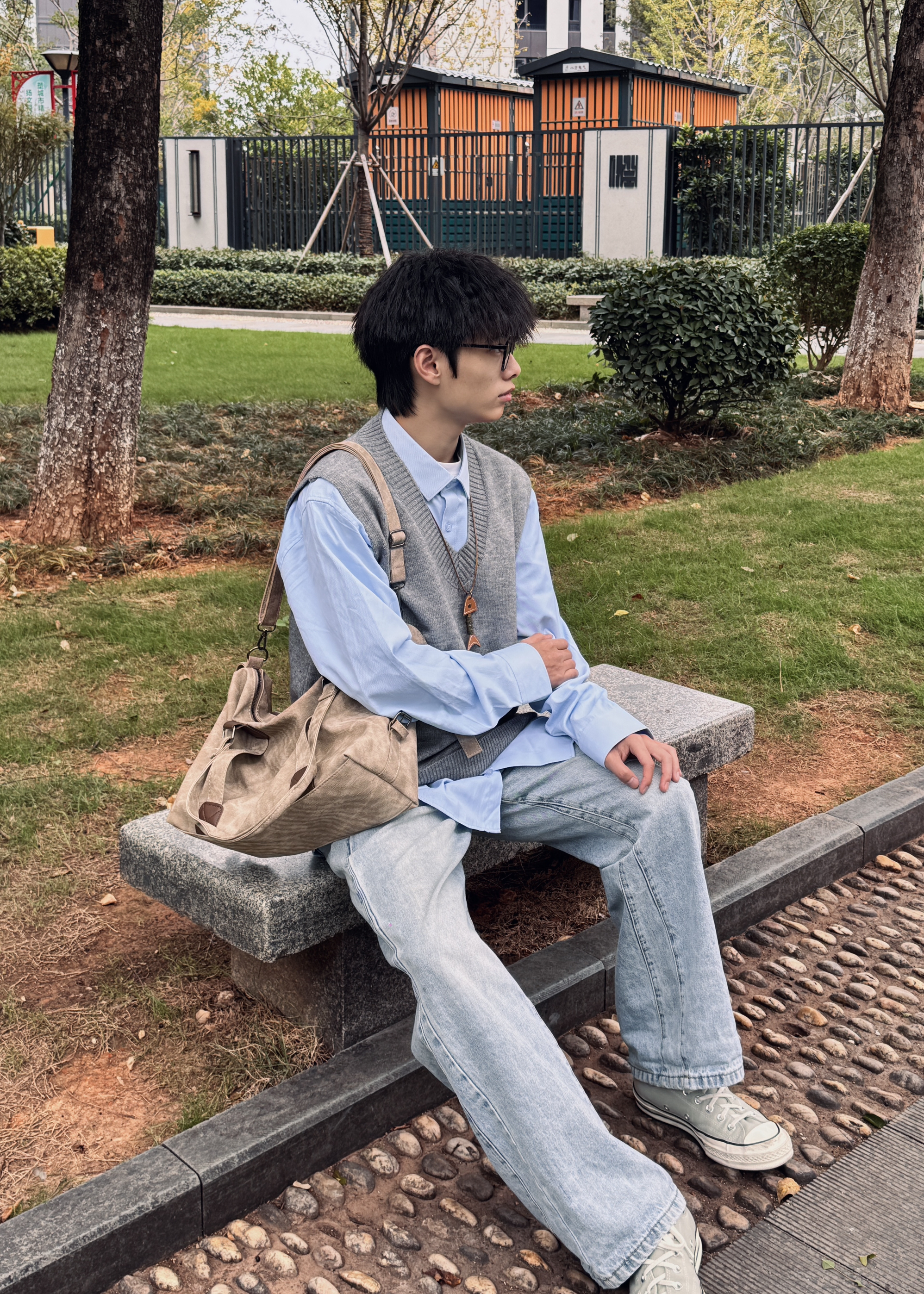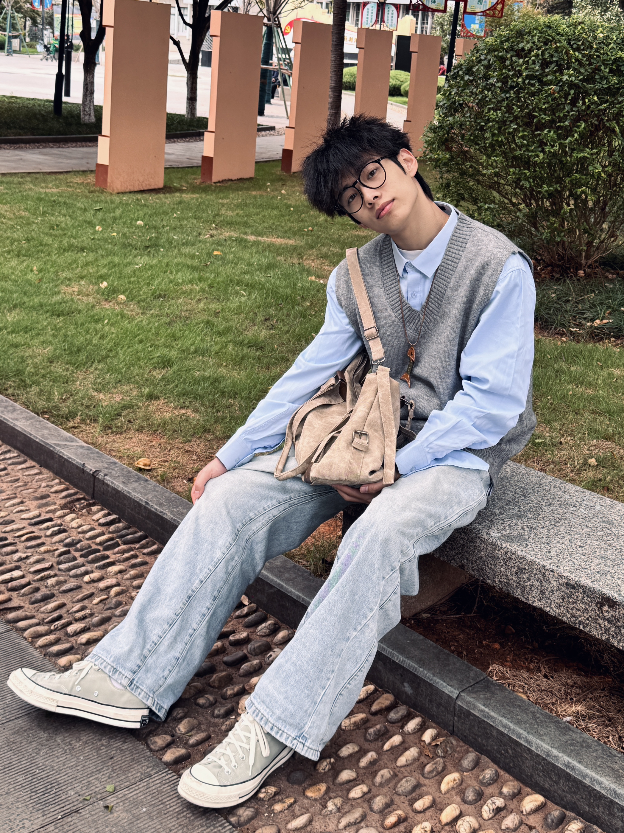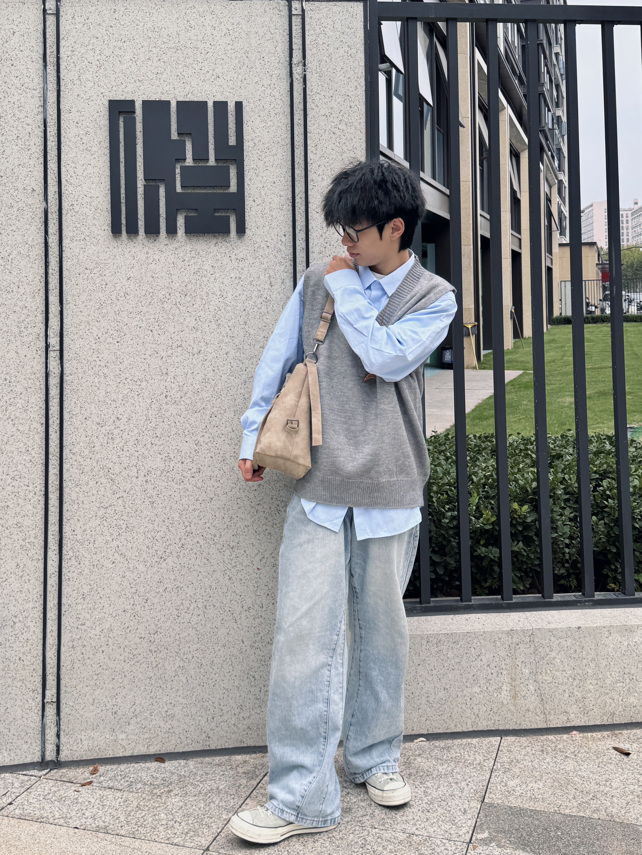 秋日穿搭不想寡淡?这套“马甲叠穿公式”直接抄作业! 浅蓝衬衫打底+灰色针织马甲,软乎乎的质感自带松弛感,层次感瞬间拉满;搭配做旧阔腿牛仔,藏肉又显高,复古帆布鞋一踩,日系少年那味儿直接焊在身上~穿上出门少年感十足!拍照妥妥出片!大家快穿起来!