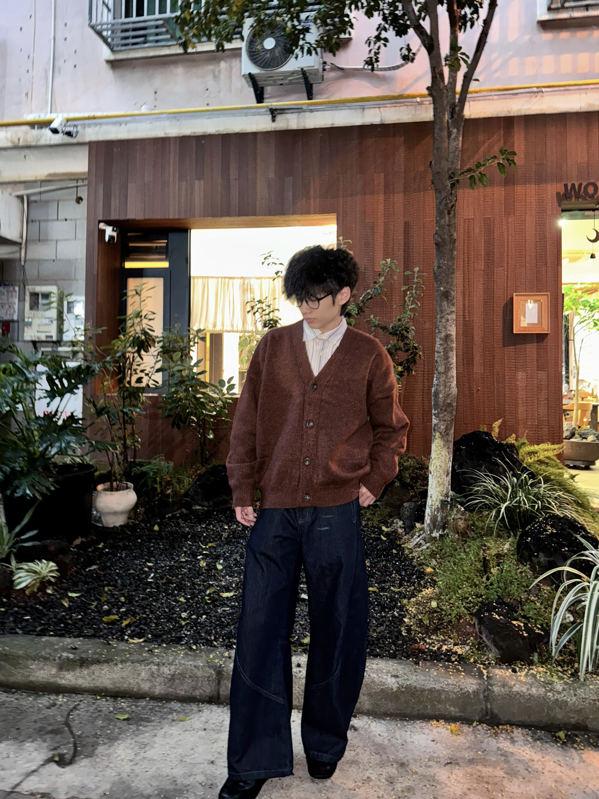 把复古格调穿在身上,是秋日最舒服的打开方式。 一件焦糖棕针织开衫,自带做旧质感,宽松版型慵懒又随性,单穿叠搭都很有味道;内搭条纹衬衫,细节处的复古感瞬间拉满;再配上一条阔腿牛仔裤,垂坠感十足还能修饰腿型,脚踩一双黑色皮鞋,复古腔调直接拉满。 在街头的暖光里,把日常穿成电影画面,这种不费力的复古松弛感,大家也快来穿起来!