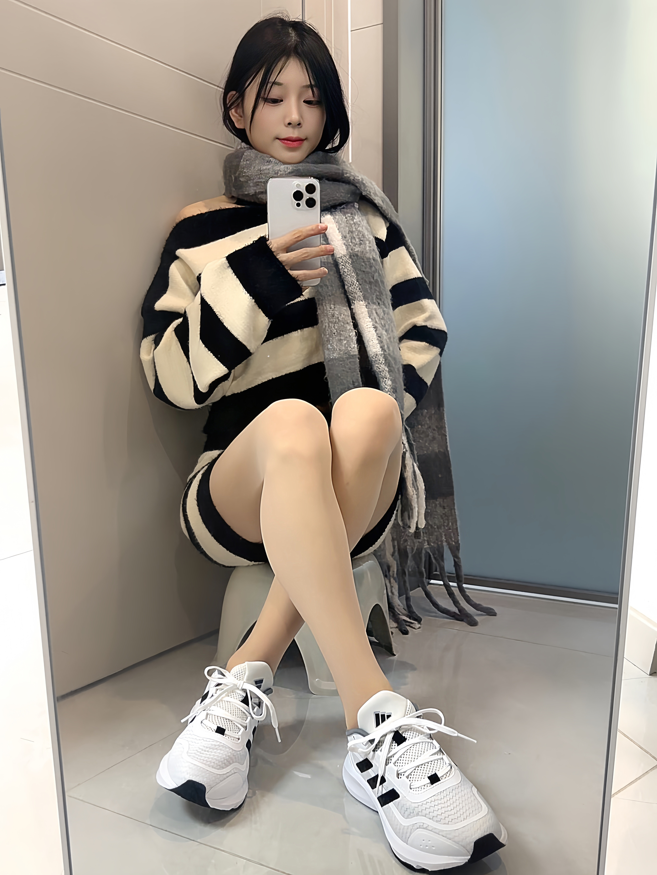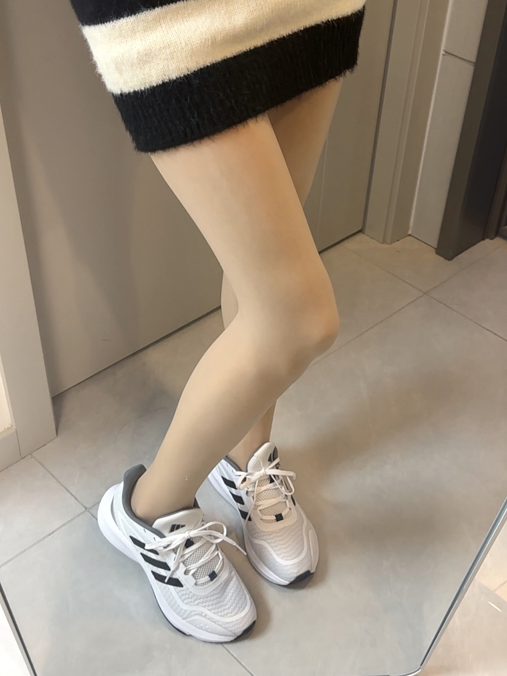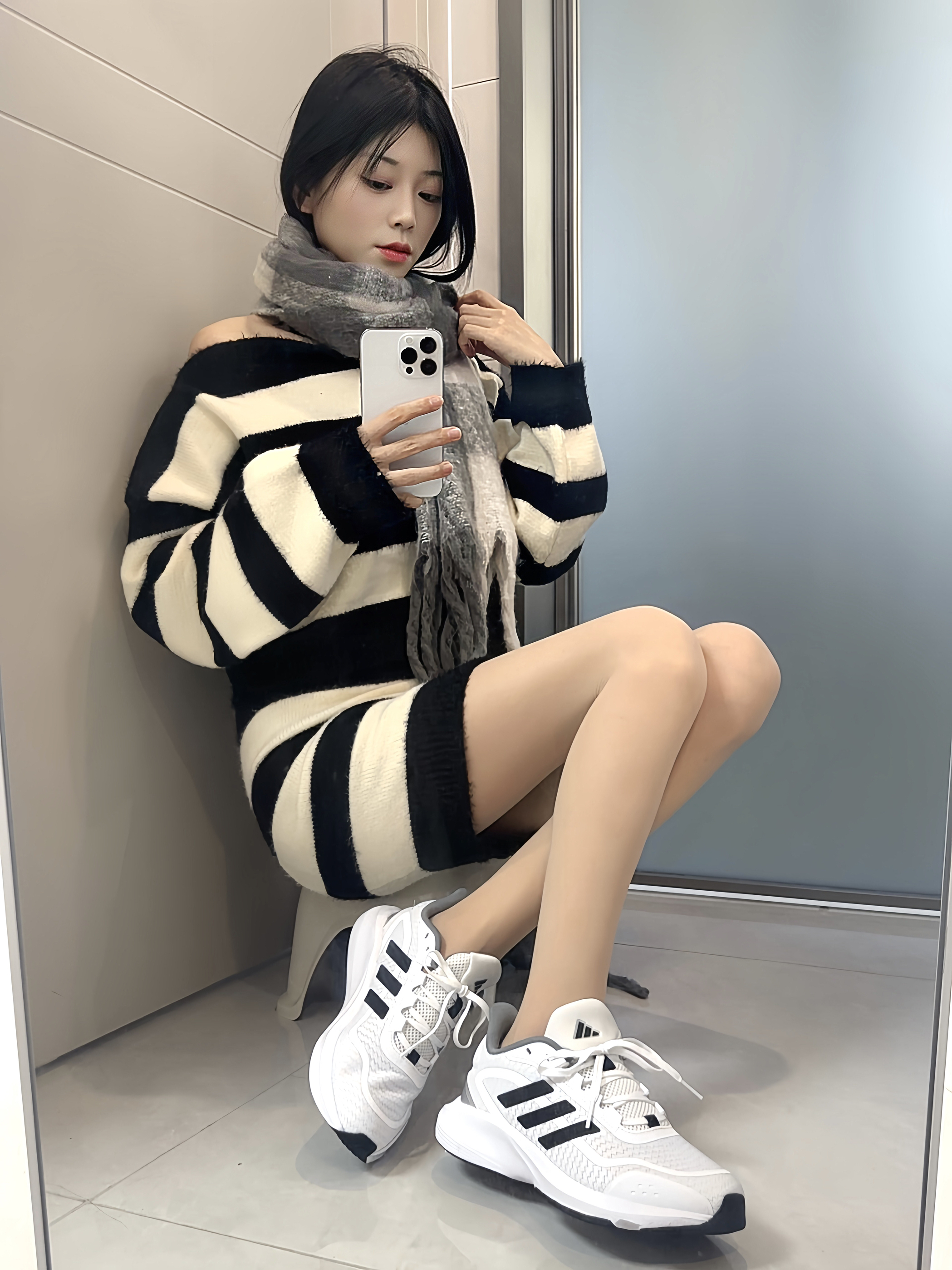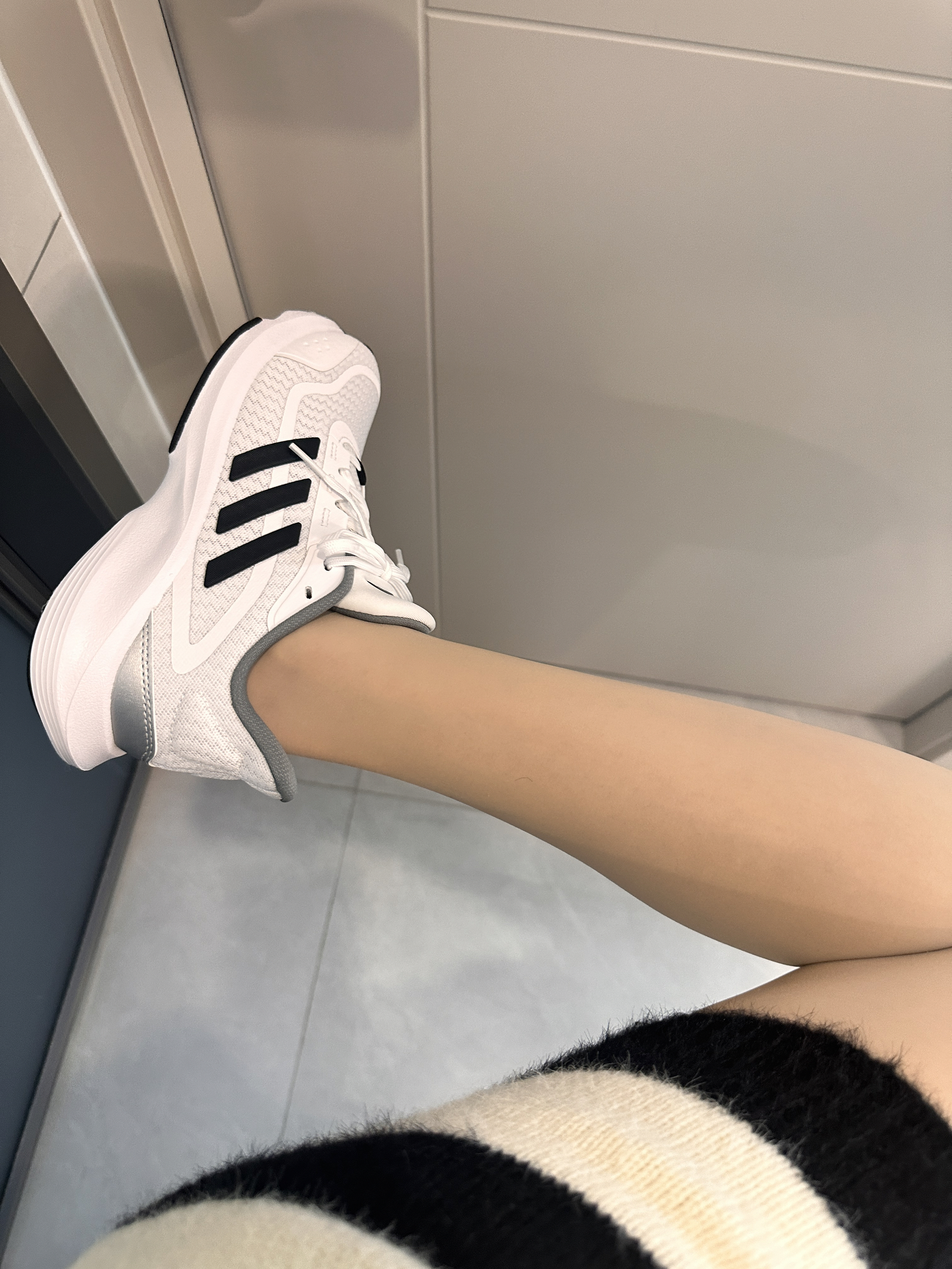 黑白条纹套装自带松驰感~ 裹条灰围巾暖乎乎的 鞋子👟穿的的adidas Runfalcon 5.0 网面透气不闷脚 缓震底走路软软的 通勤赶地铁、周末约会都舒服😌