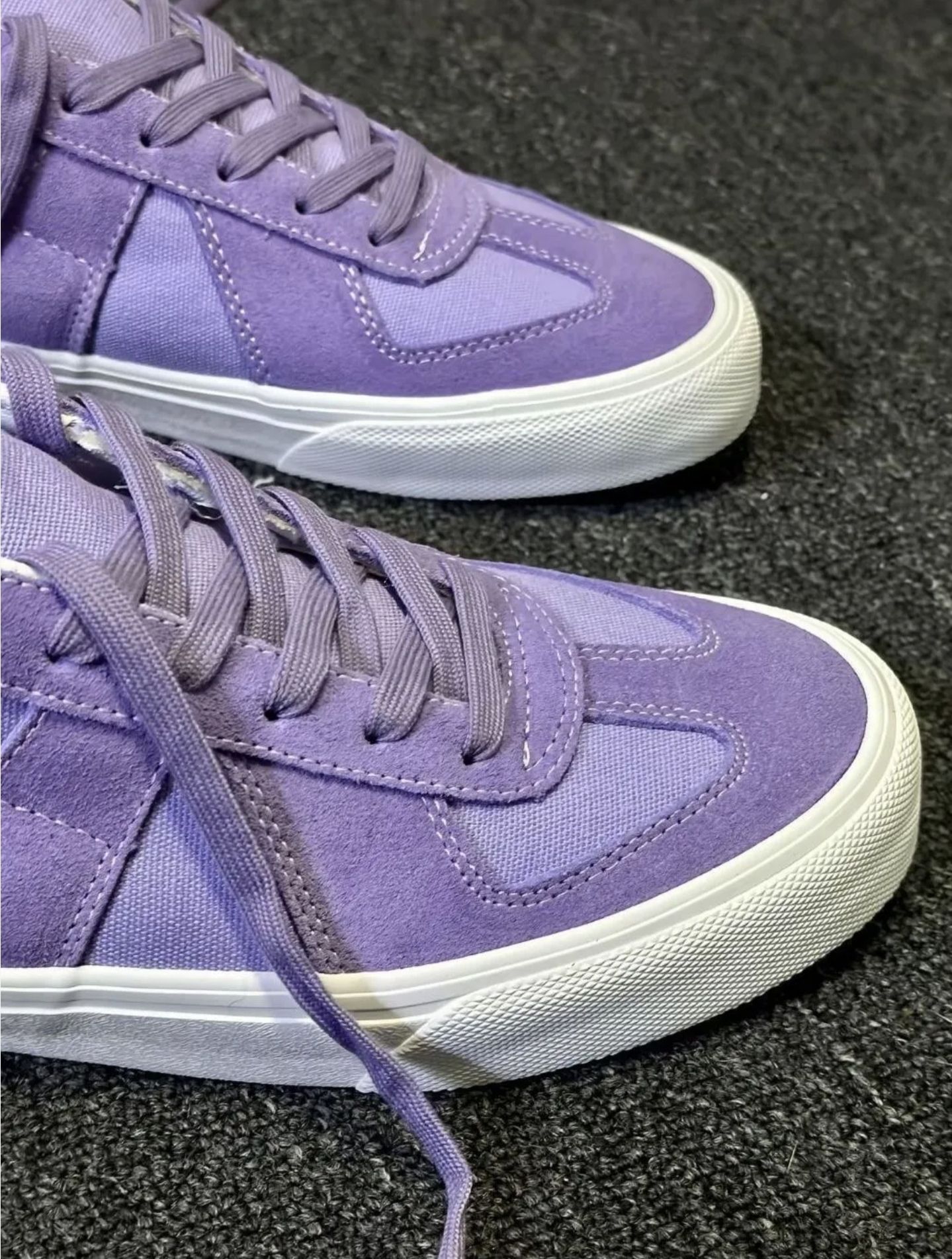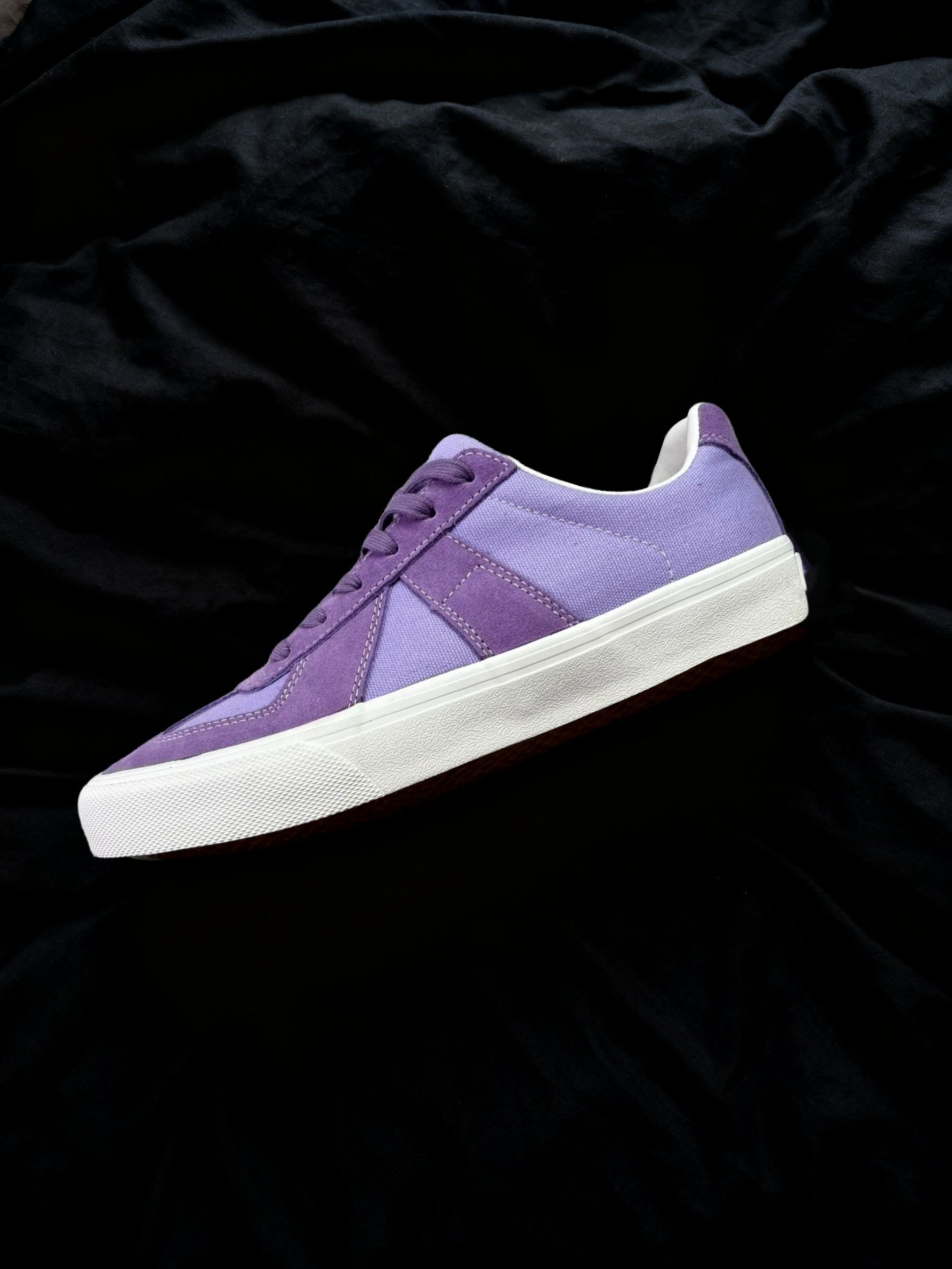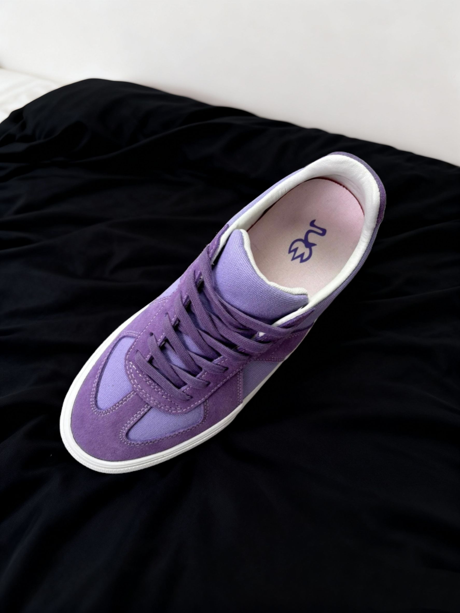 麂皮+帆布的拼接还挺软乎😌,上脚不压脚背,走久了也没磨脚。浅紫调很百搭,配牛仔裤、运动裤都不突兀,就是麂皮部分得小心蹭脏🧹,整体是舒服又不扎眼的款~