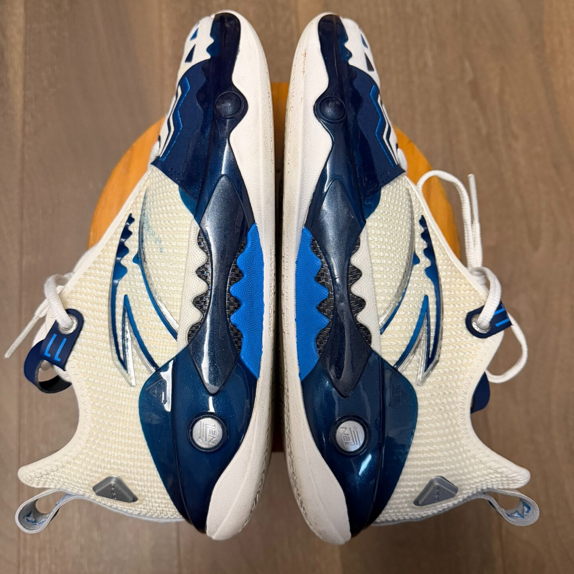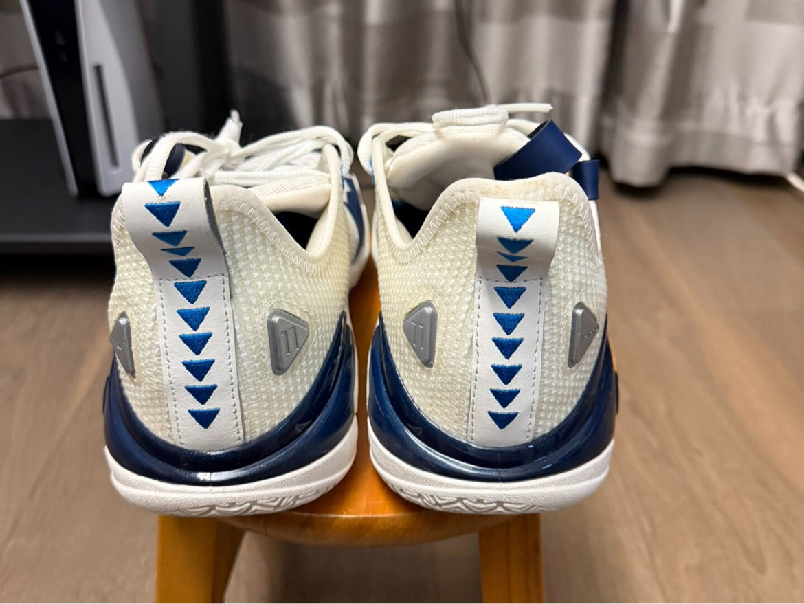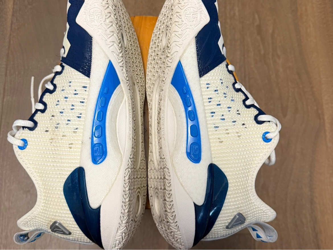 这双狂潮5Pro达拉斯配色拿到手真的被清爽感暴击了!鞋面用纯白基底打底,侧墙安踏Logo玩起电镀镭射——光线下转角度会浮出蓝银渐变流光,远看像德克萨斯晴空近看藏着球馆地板反光!最绝的是后跟TPU彩蛋——透明材质里压印了独行侠队徽暗纹,跑动时像把美航中心灯牌穿在脚上,闷骚得让东契奇想传球!