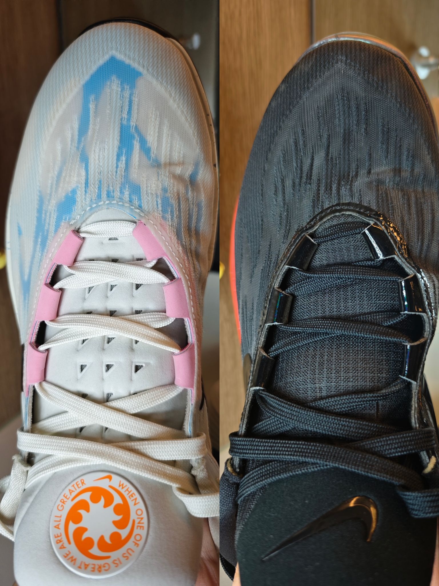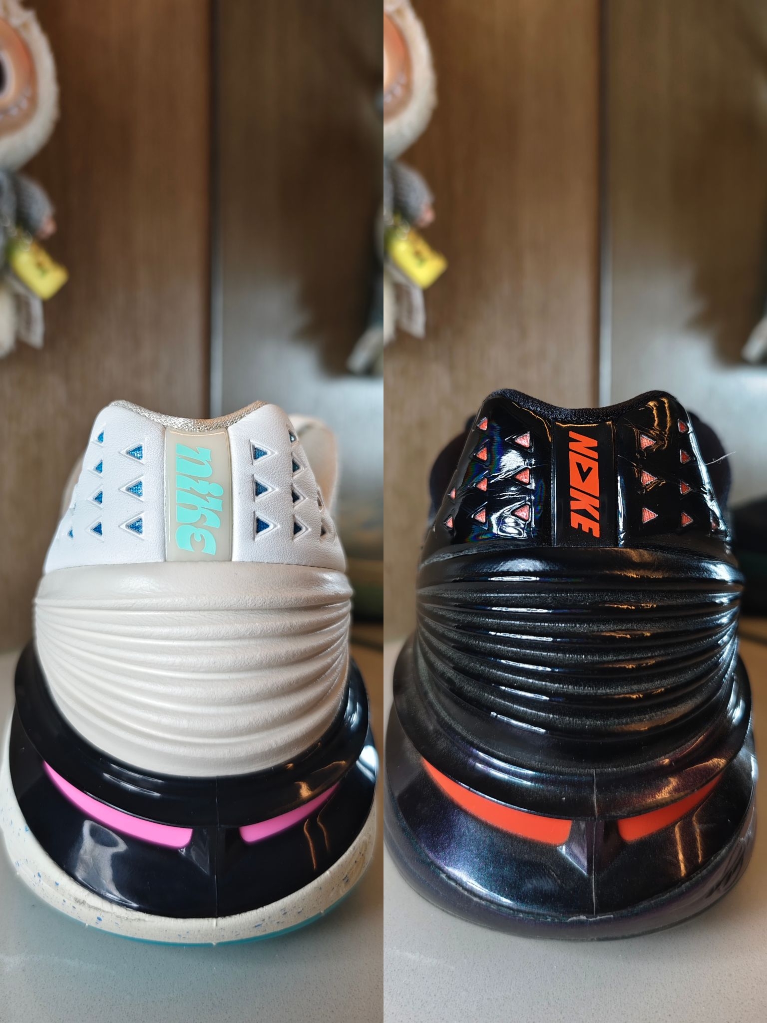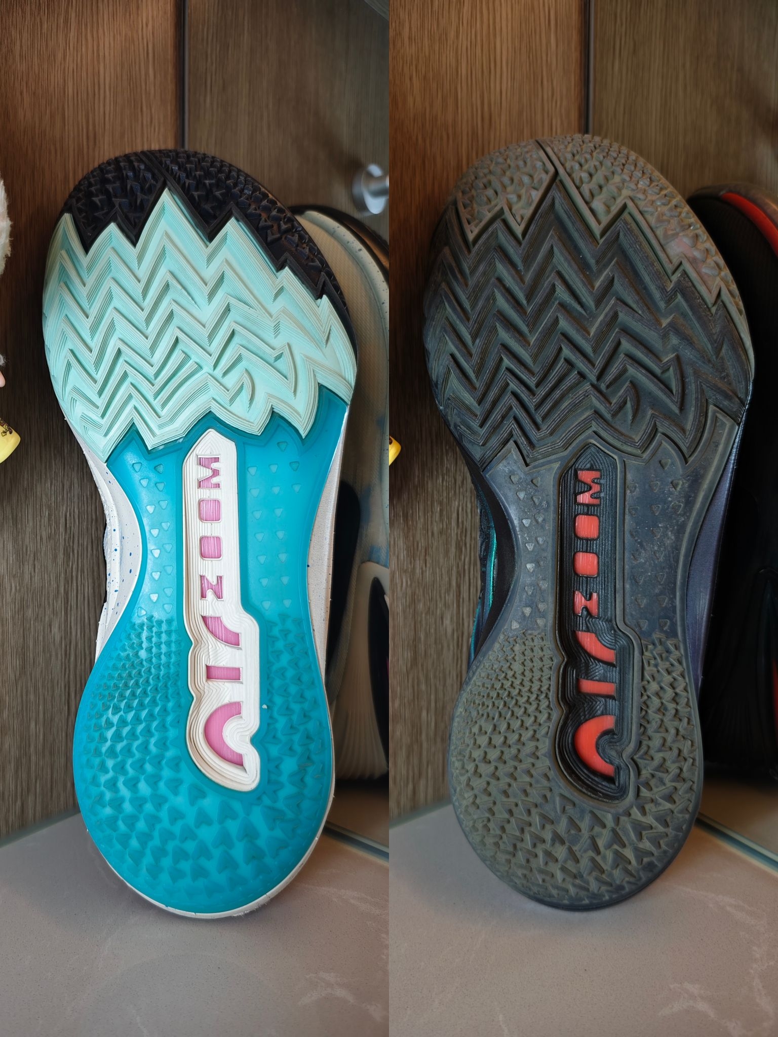 👉相同点:配置方面两双鞋都是全掌Zoom Strobel气垫+全掌React鞋垫+后掌六边形Zoom Air气垫,六边形Zoom Air气垫镶嵌在鞋垫上,初上脚就有明显软弹的脚感,我身高186cm体重170斤缓震完全够用,但有一个点需要注意的是这款鞋初上脚重心偏高,可能有崴脚的风险🤔,在实战穿着一段时间后,React鞋垫会被踩出独属于你的脚型,重心会变低,这时候才能发挥出这款鞋最大的性能。我是白蓝...