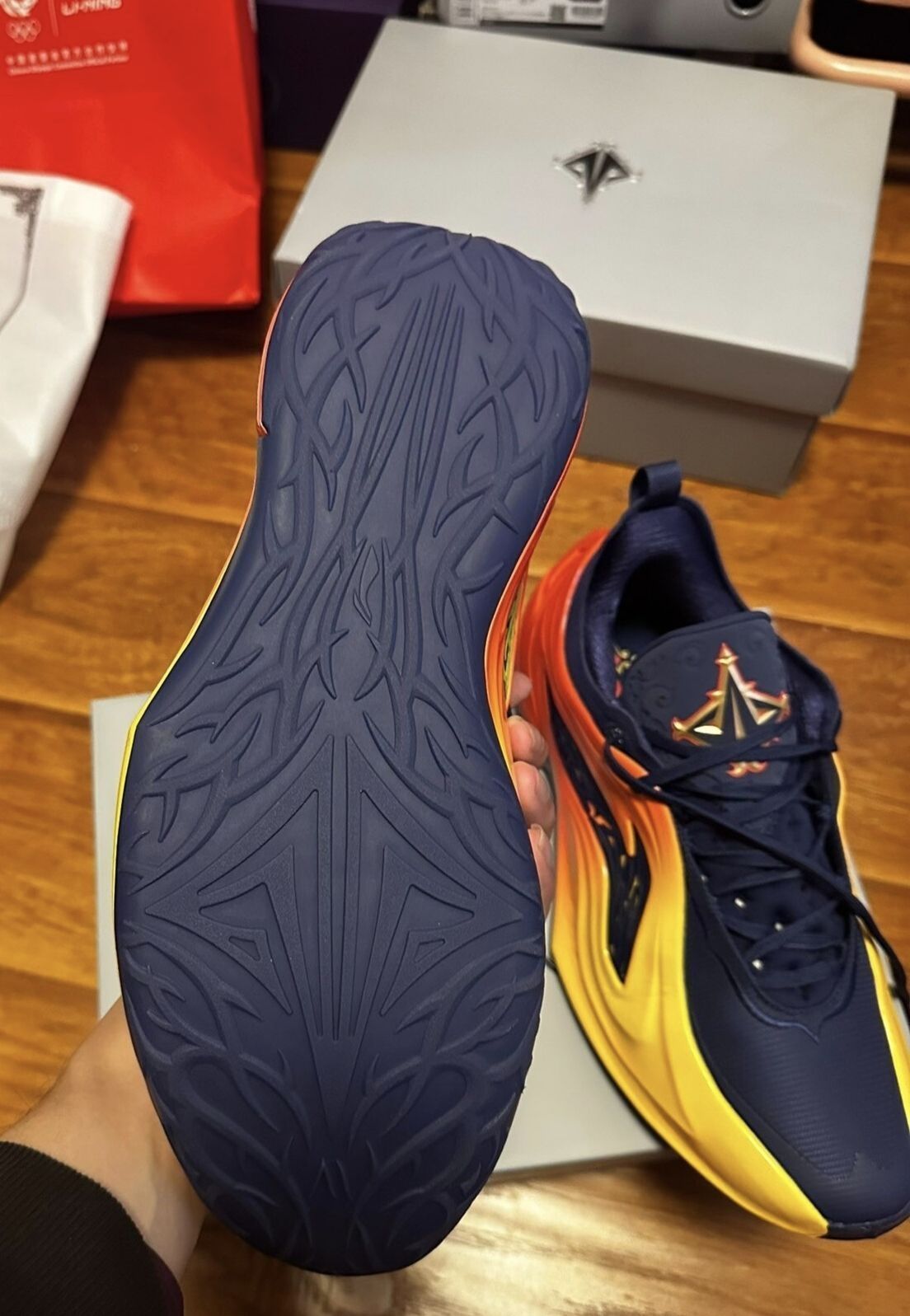 这双鞋是李宁JB4“湾区之刃”,是吉米·巴特勒的第四代签名篮球鞋,主打“冲击型锋线实战”定位,核心信息如下: 1. 设计与配色 - 灵感来自金州经典配色(类似勇士队复古色调),采用橙黄渐变+藏蓝的撞色设计,搭配精油喷漆亮面,视觉上有“烈焰”质感,辨识度极高; - 鞋身融入“荆棘”元素(鞋侧纹理、鞋舌巴特勒标识),呼应巴特勒“硬核、坚韧”的赛场风格。 2. 核心配置 - 鞋面:用IBR立体...