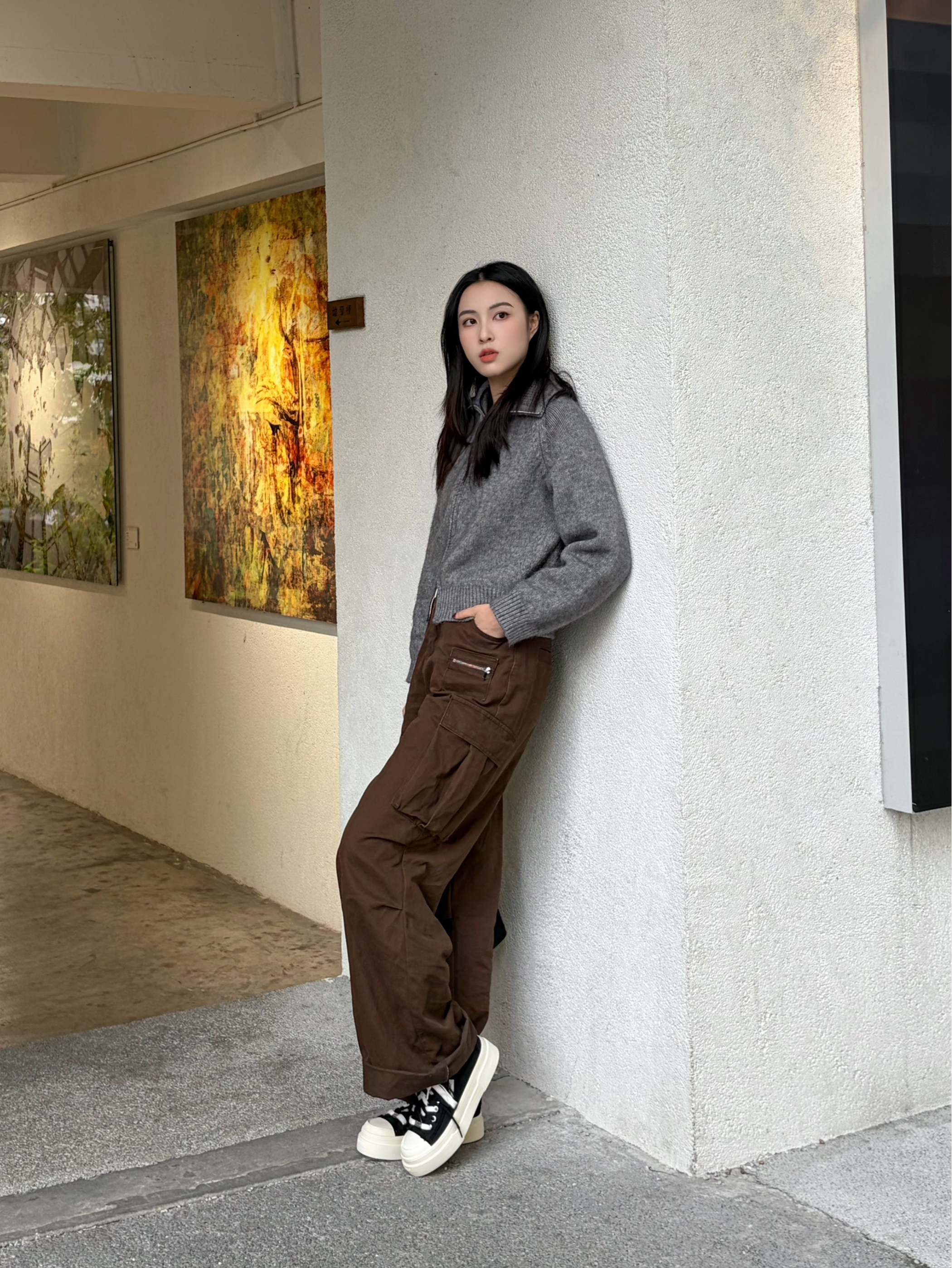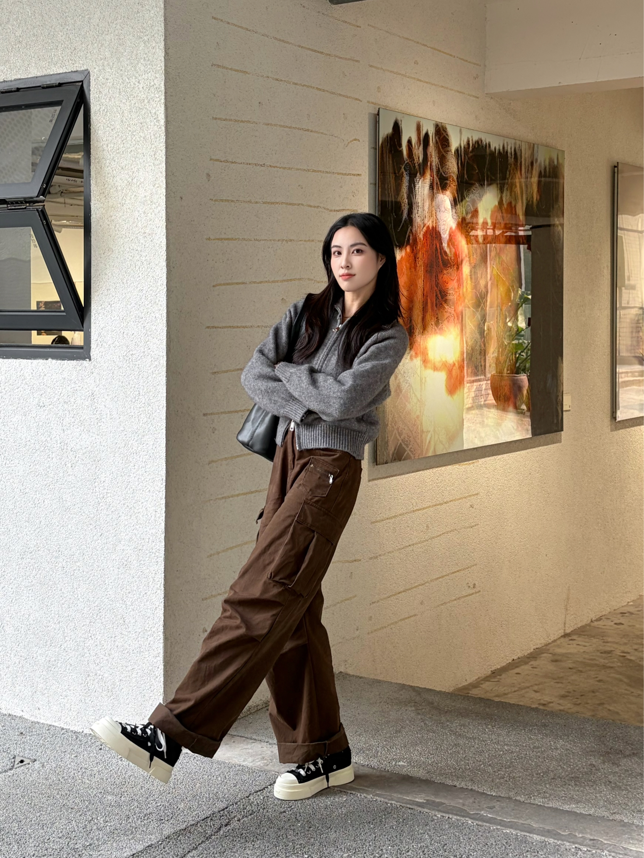 浅灰短款针织开衫「精准掐腰」,软糯亲肤还显身材,随手一搭就很有腔调~ 深棕工装阔腿裤垂坠感拉满,卷边露脚踝+厚底鞋buff叠满,腿长直接“作弊”式延伸! 背只极简黑包平衡色彩,日常出街/看展都自带松弛高级感,艺术生DNA狠狠动了✨ 慵懒不邋遢,随性更有品咖~