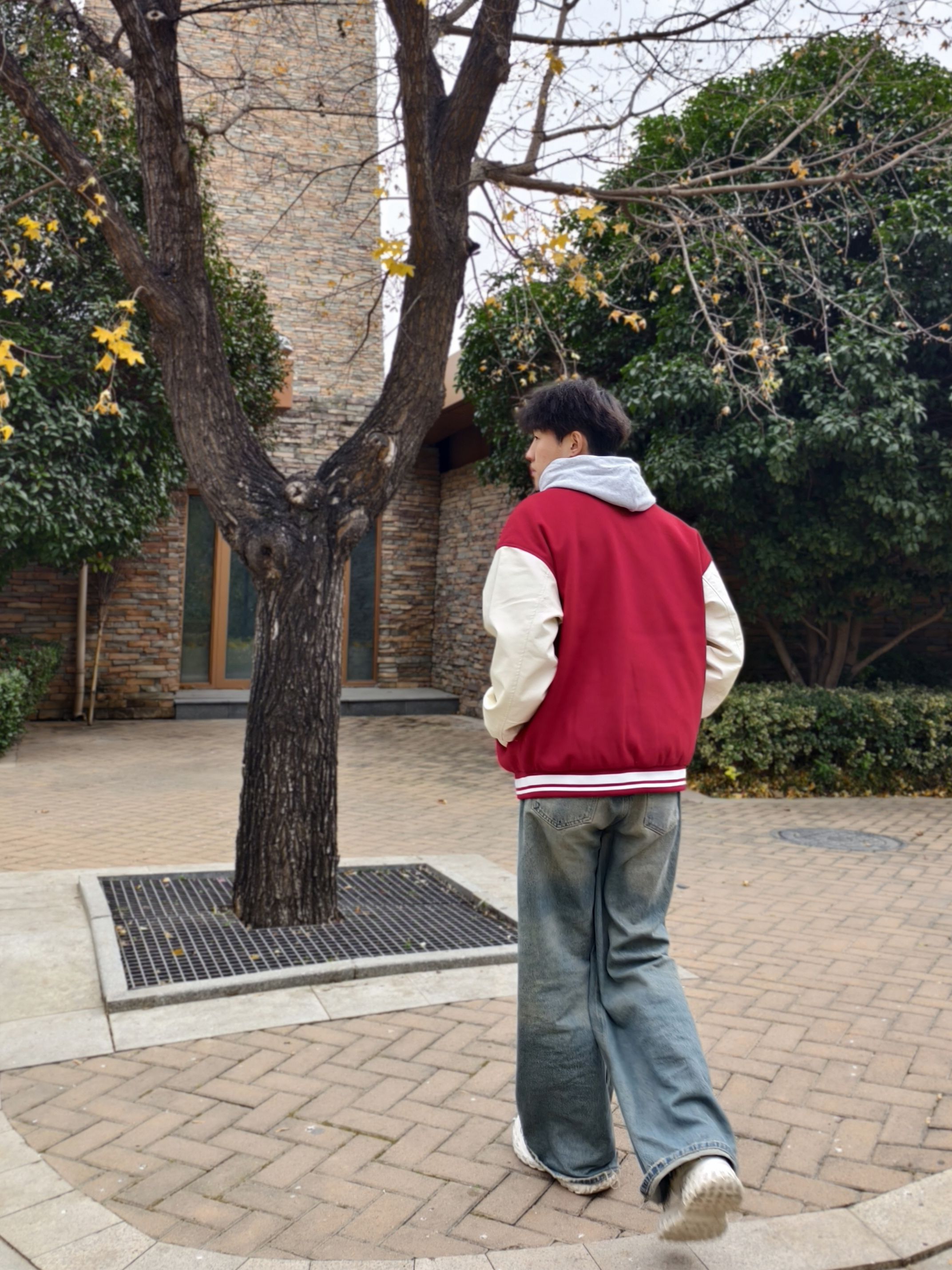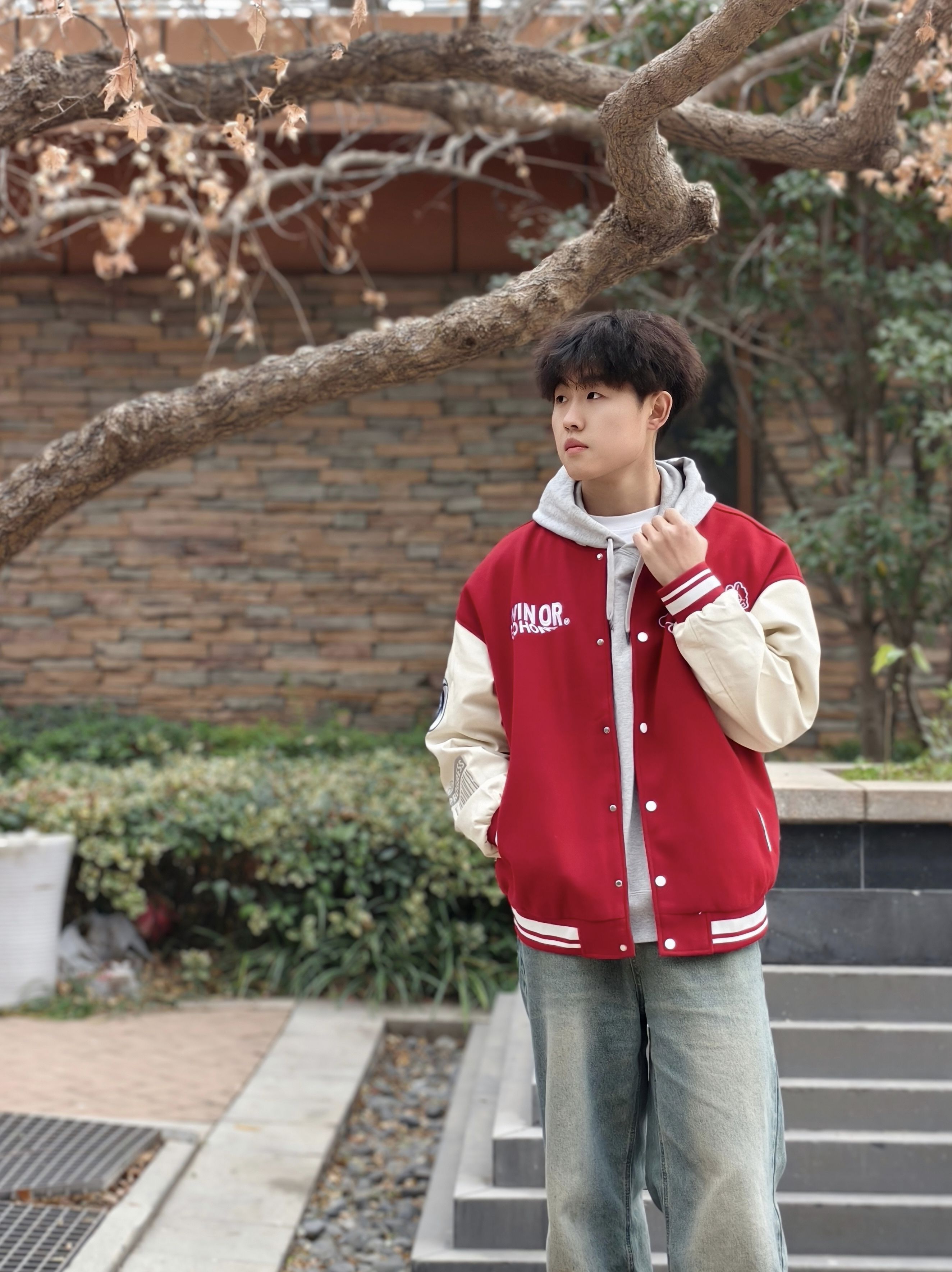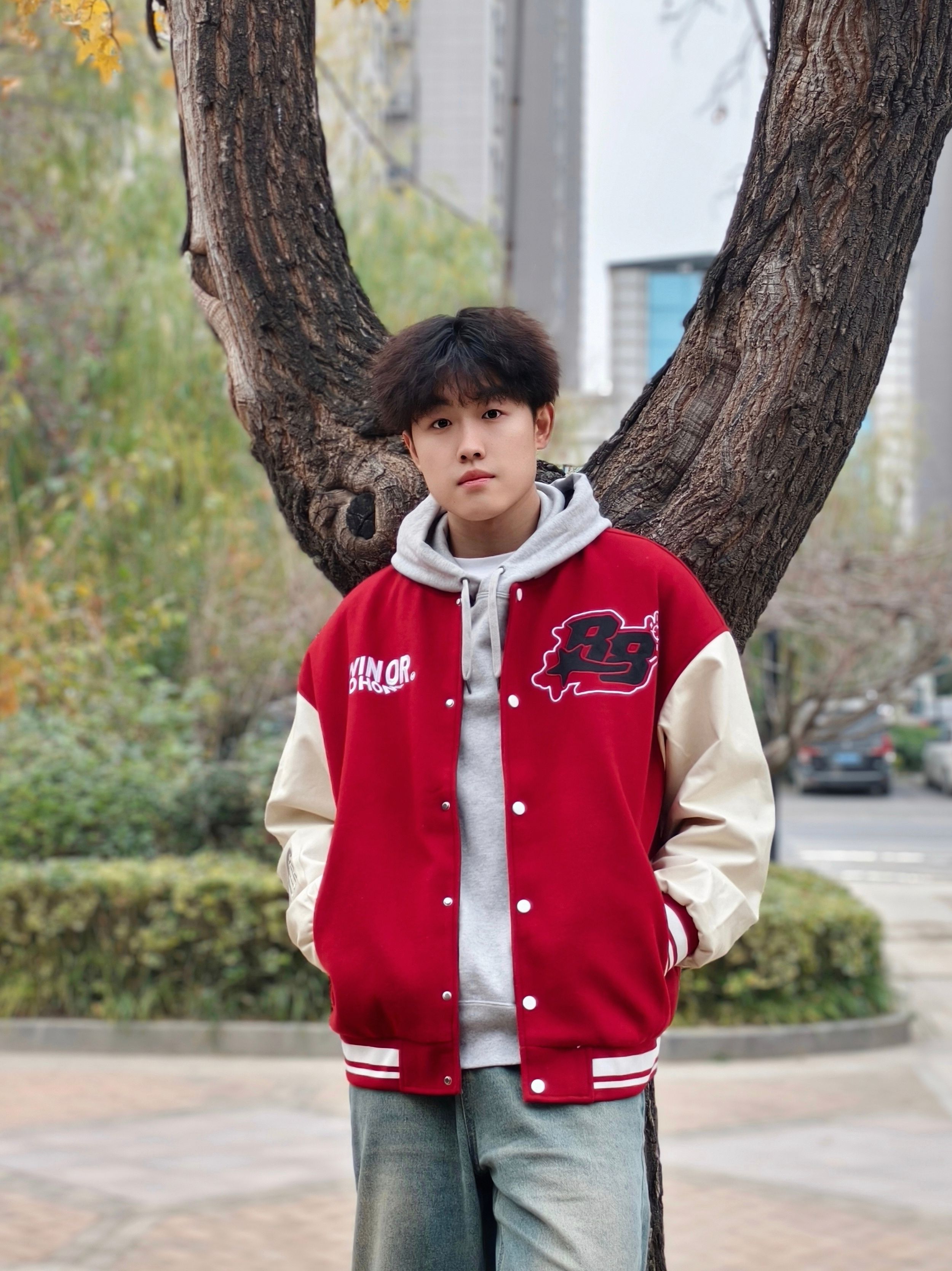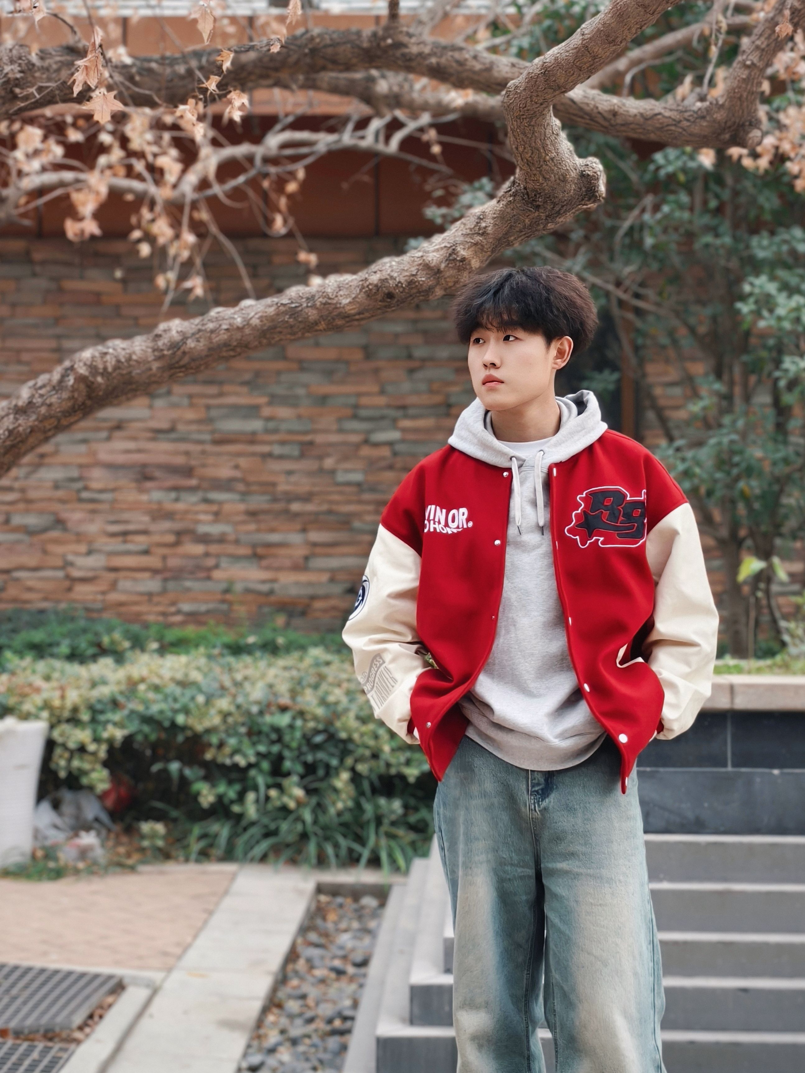 红棕拼色棒球服叠灰卫衣也太绝了! 宽松版型藏肉又随性,搭水洗阔腿牛仔 随手往树下一站,青春氛围感直接拉满 不用费脑的松弛感穿搭,谁穿谁帅
