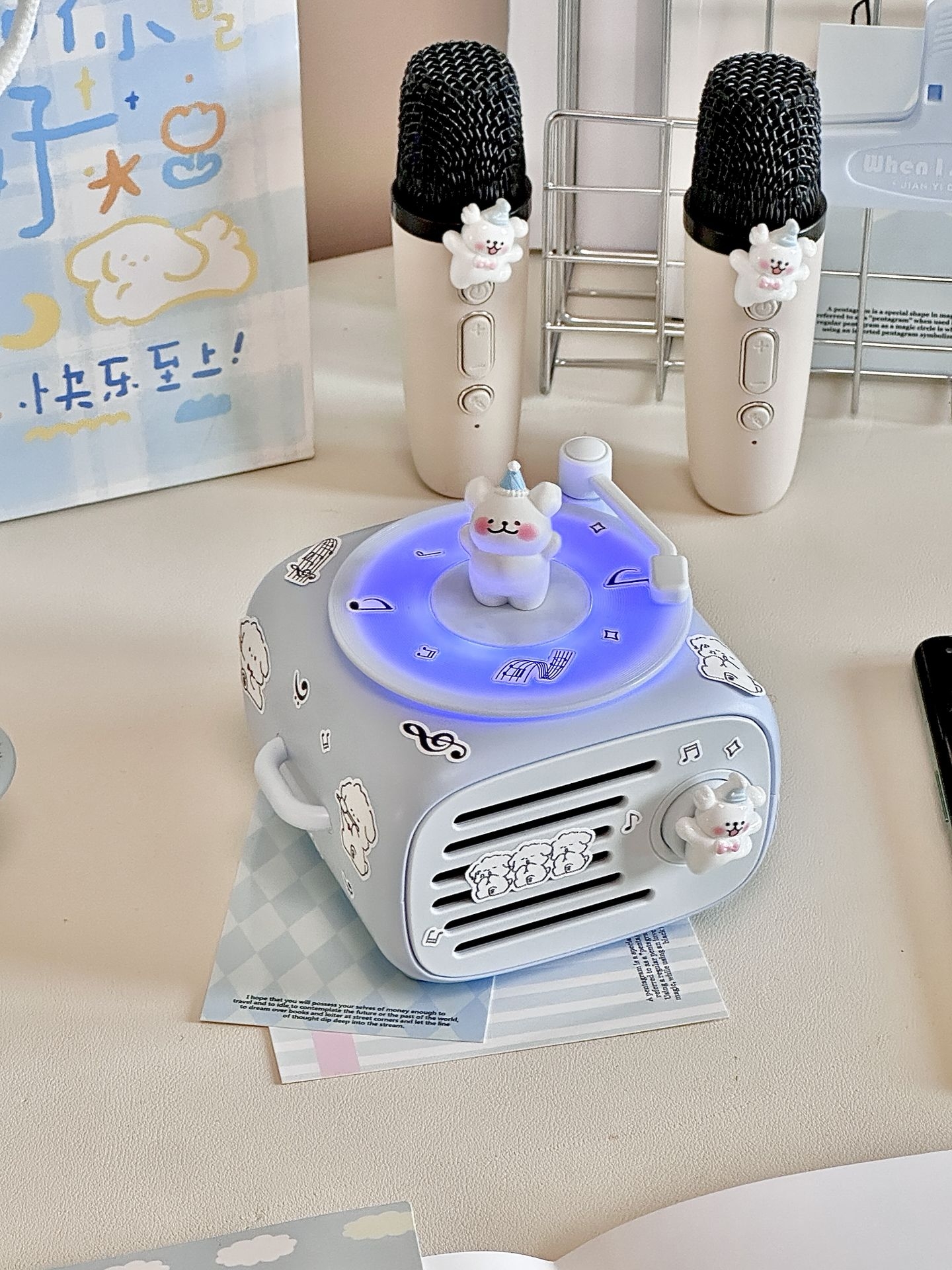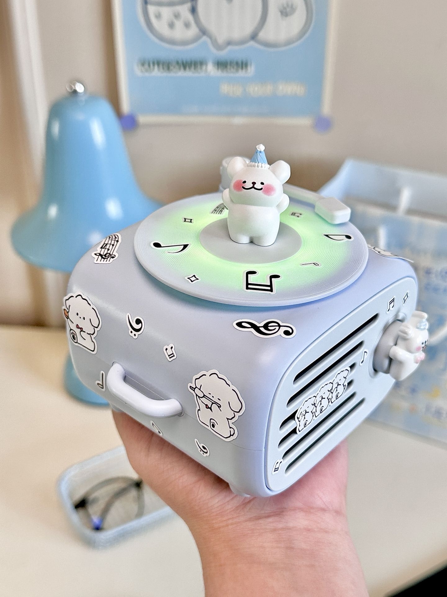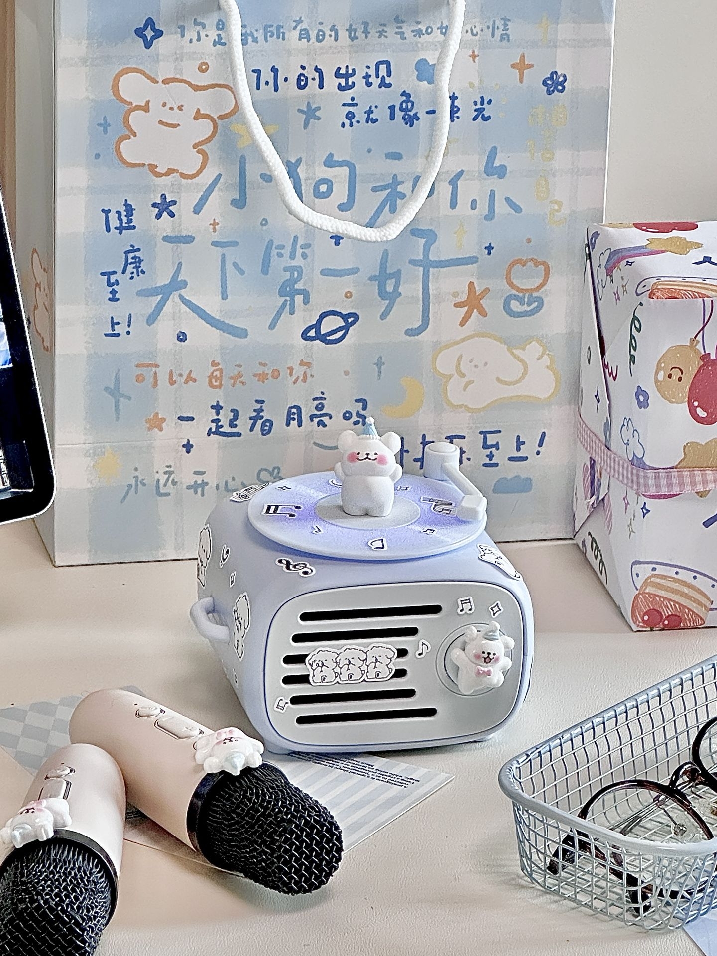 #拯救日常的数码 “小配件” 我永远不会拒绝蓝色!更何况还有小狗诶! 奶呼呼的蓝色🫧真的拿捏住了我的少女心 到手是已经用漂亮的纸打包好了 真的是让我从拆快递的那一刻就开始心动 让我惊喜的是连接蓝牙,转盘还会跟着音乐转动🎵 我用自带的配件浅咕了一下 一个奶蓝色的迷你桌面音响Get 还搭配2支🎤!爱k歌星人狂喜! 已经气成丹田的唱了一下午啦~~~ #高颜值桌面蓝牙音响 #520送礼新灵感 ...