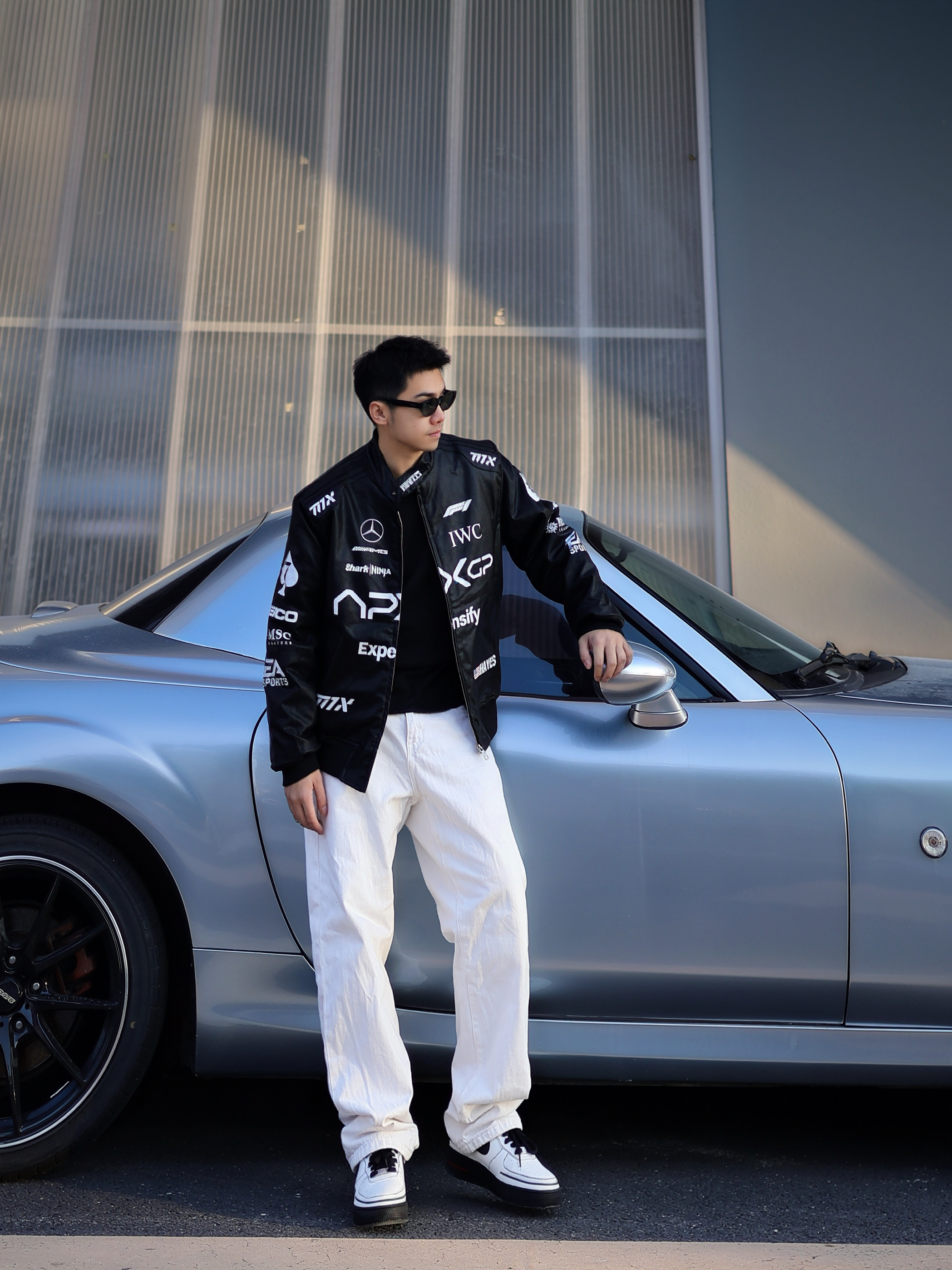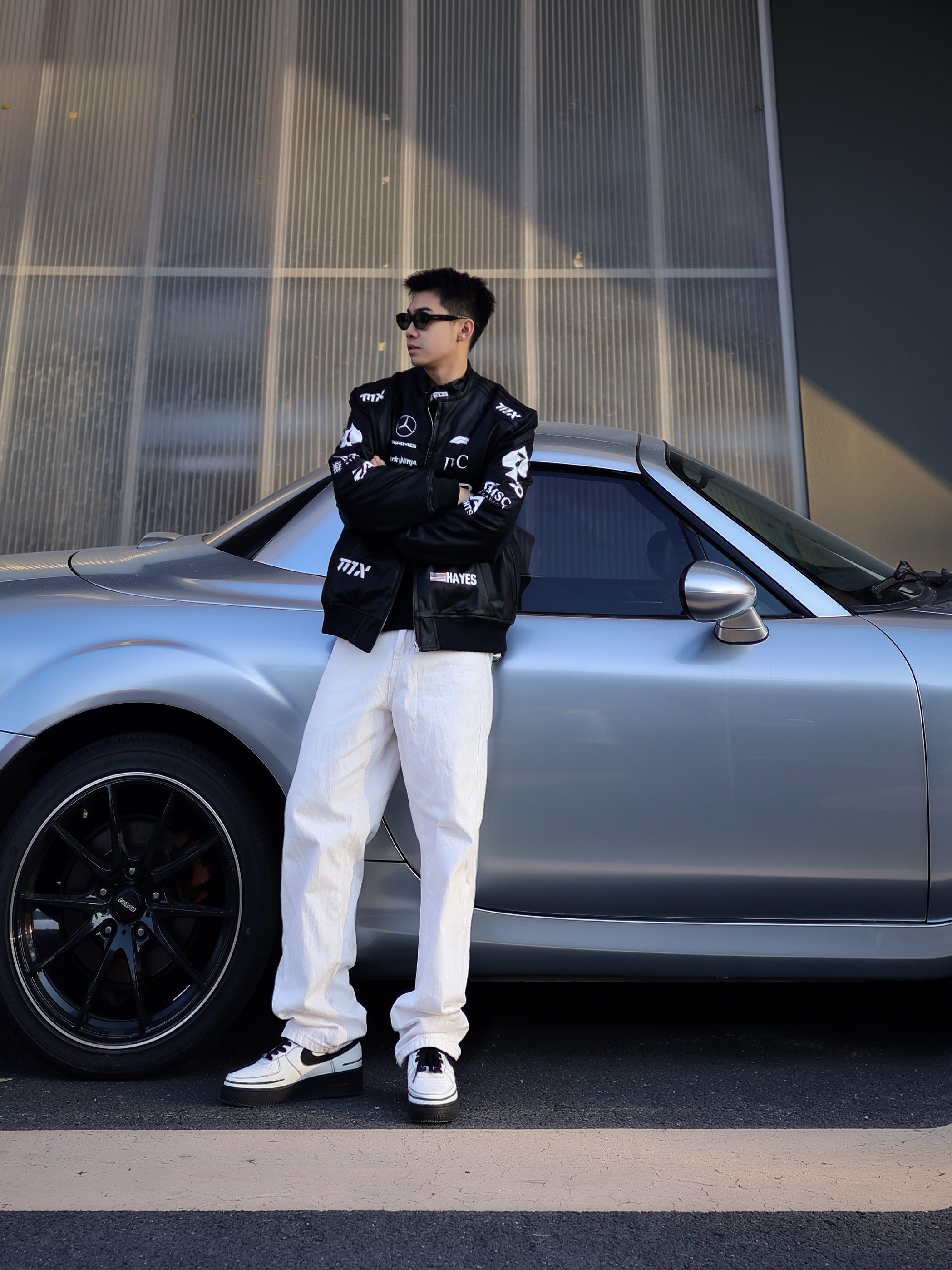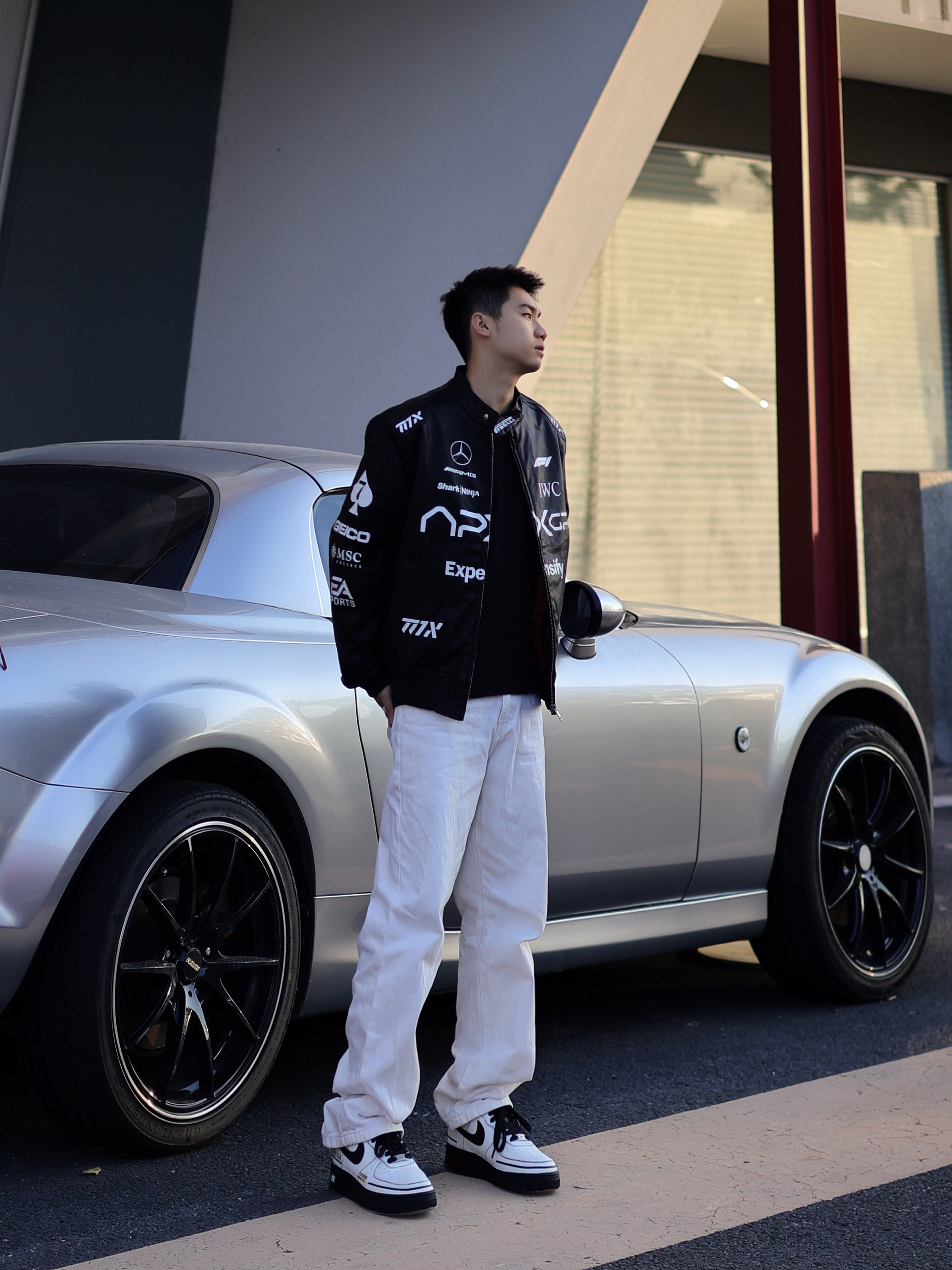冬天机车服潮酷出街! ⬇️⬇️⬇️ootd 上身一件xx机车服 美式赛车字母满印 硬朗中自带复古感 下搭一条白色牛仔裤 更显简约干净 鞋子选择了nike空军一号 手绘设计暗藏小心机 最后再搭配一幅墨镜呼应起来 黑白搭配 出门轻松炸街💥