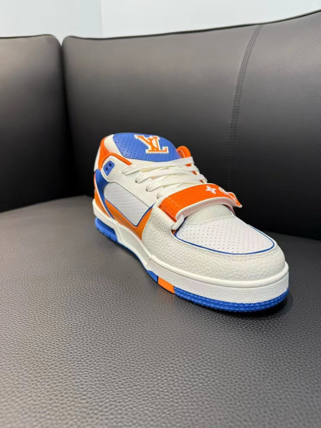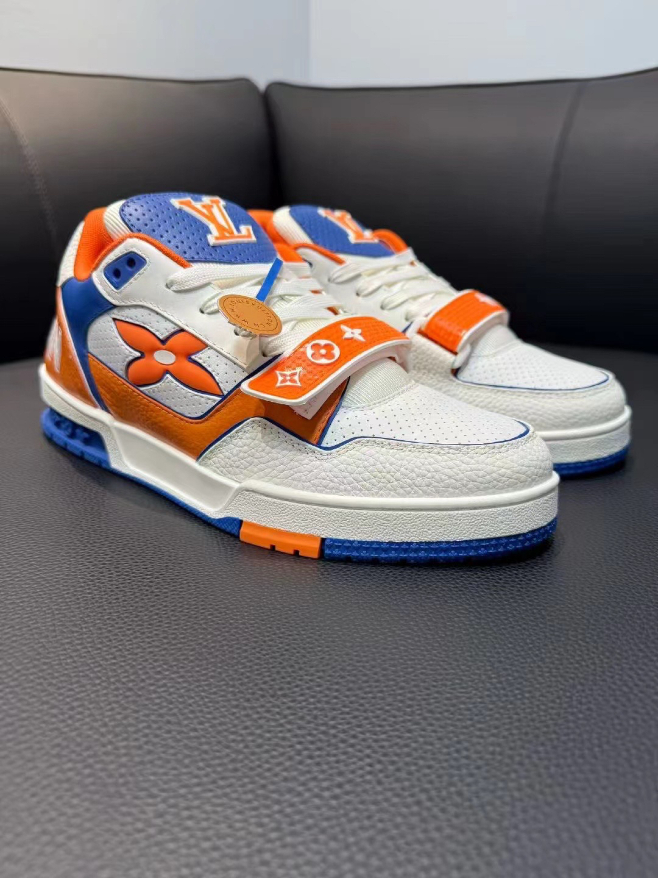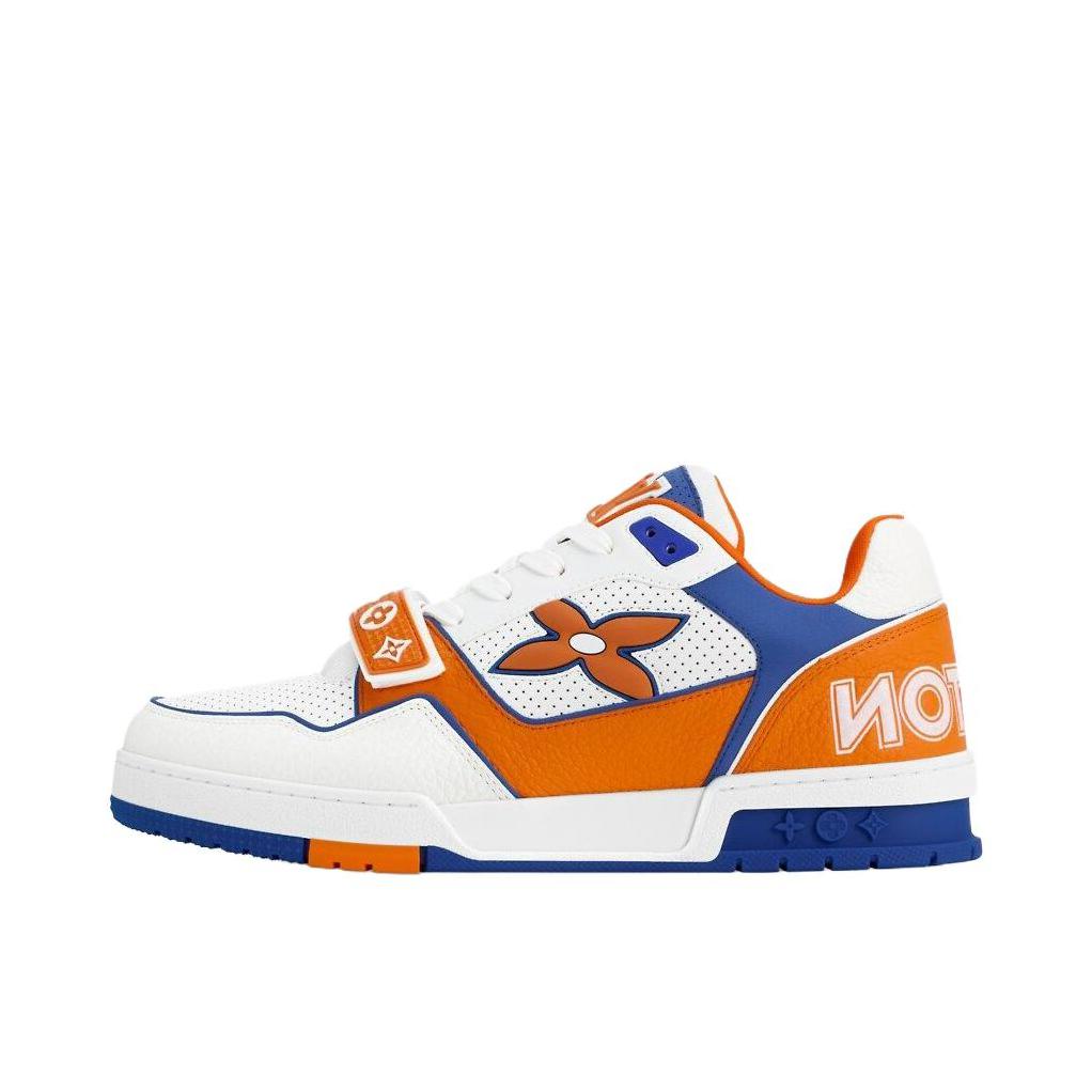 路易威登(Louis Vuitton)运动鞋色彩鲜艳,橙、蓝、白搭配很有活力,以下是一些穿搭思路: • 休闲街头风:可以搭配黑色束脚工装裤,上衣选橙色连帽卫衣,外搭一件蓝色牛仔外套,整体色彩相互呼应,既休闲又有街头潮流感,鞋子的亮眼设计能成为造型的点睛之笔。 • 运动潮流风:搭配白色运动短裤,上衣穿蓝色运动背心,再套一件白色防晒运动外套,打造出清爽的运动造型,适合日常运动或者出街,展现青春活力...