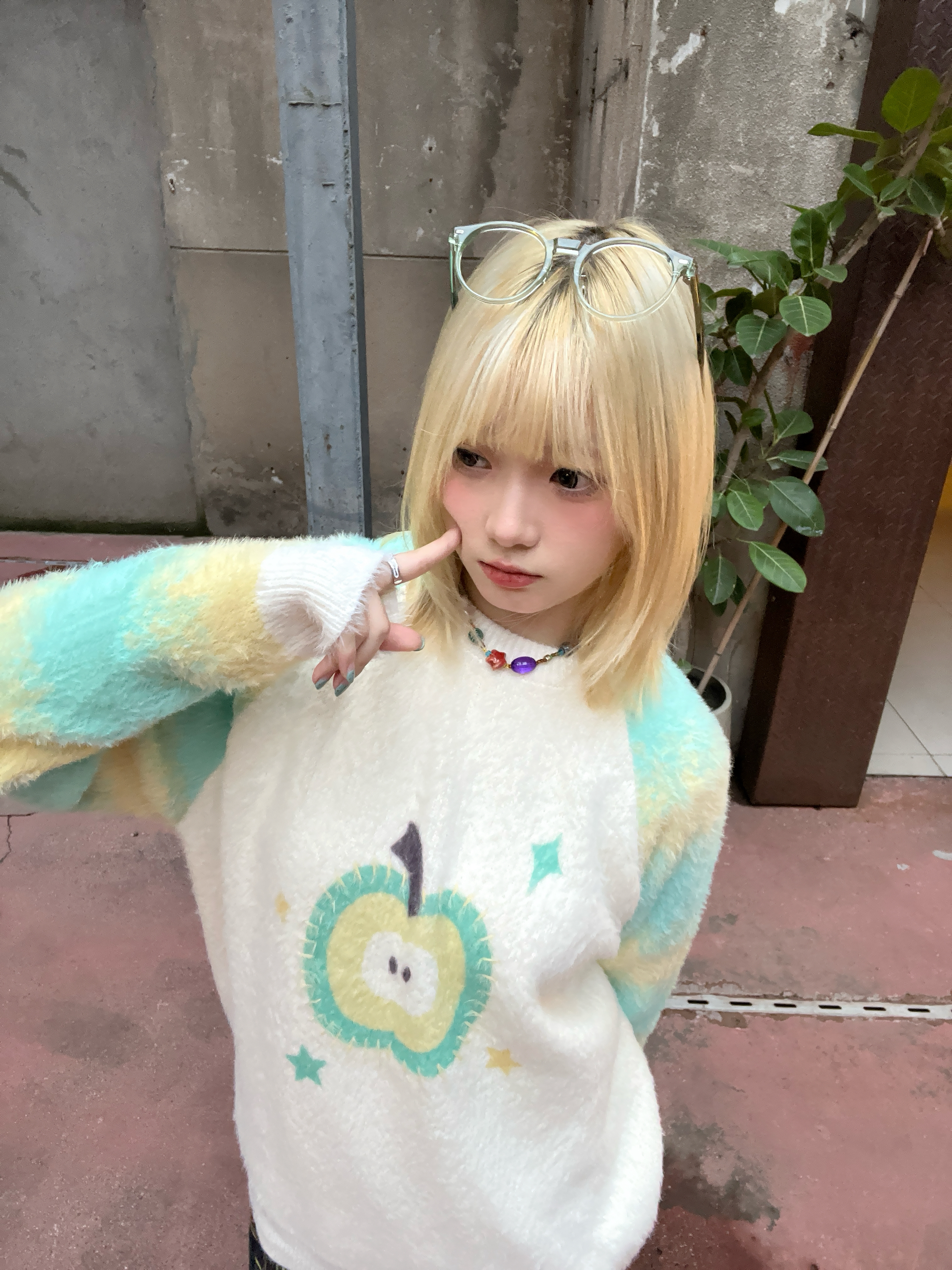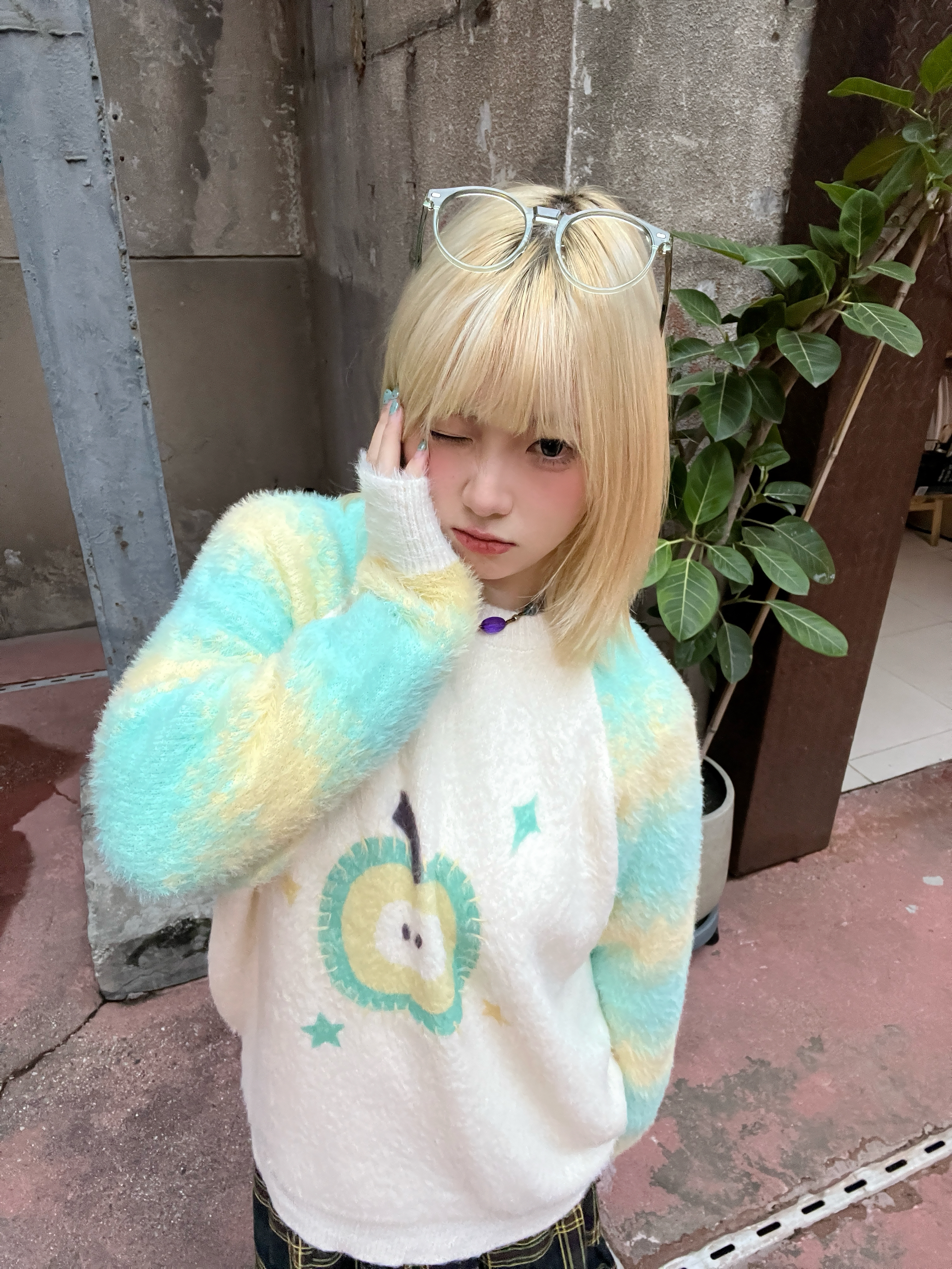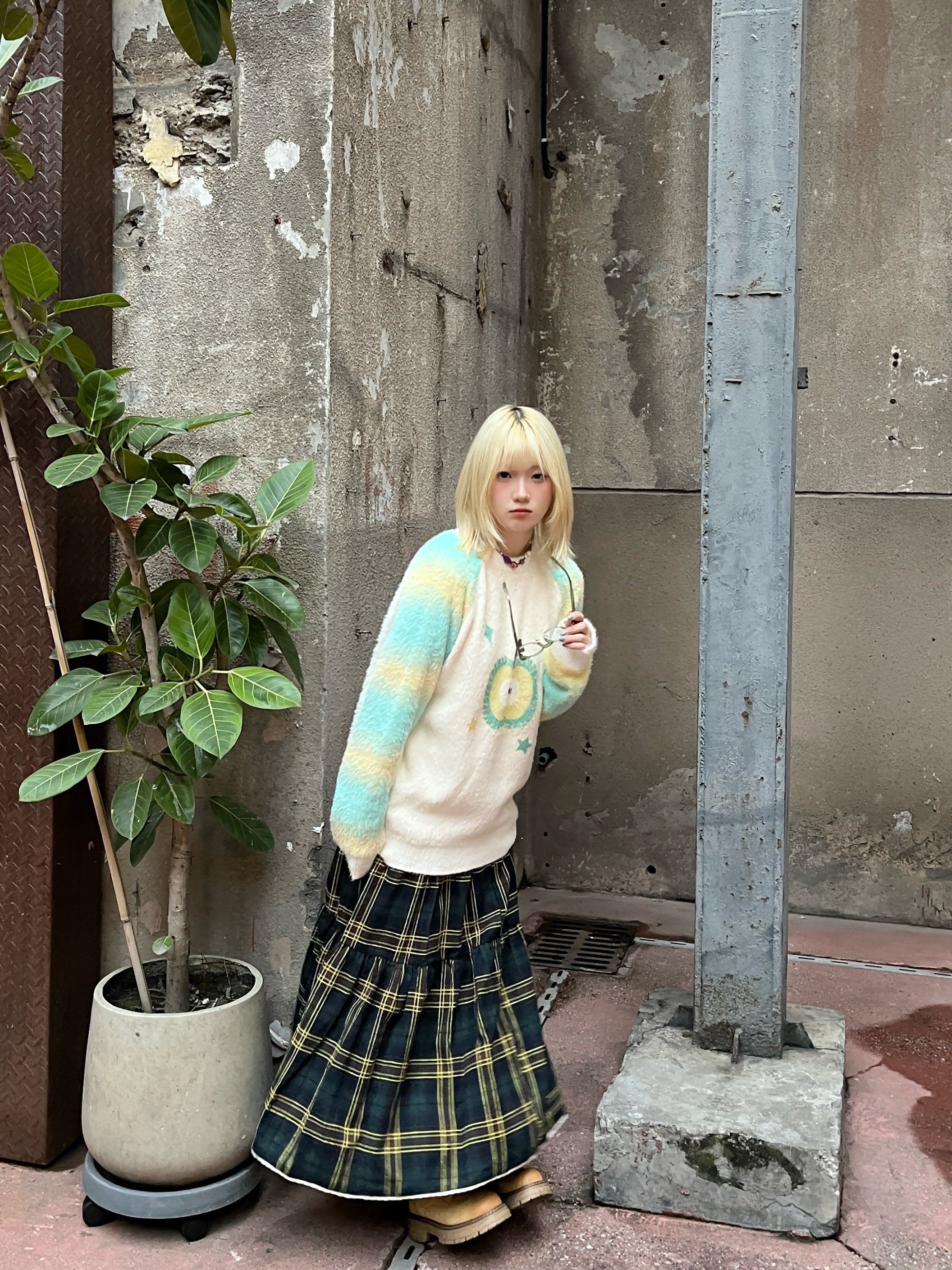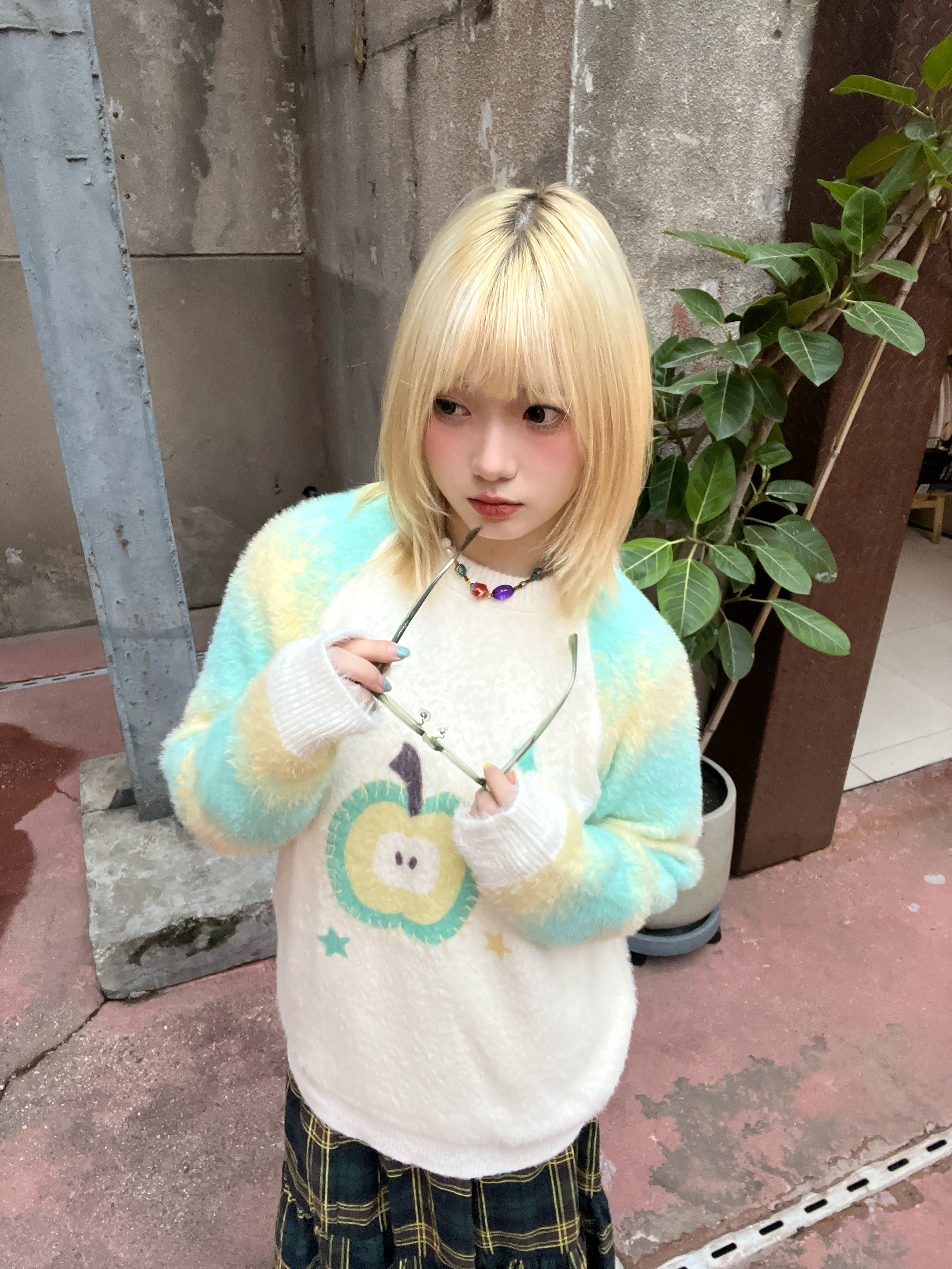 染了金发和这种青绿色的适配度不要太高了!! 软软的毛衣和同色系格纹长裙 青苹果日系少女就是我了
