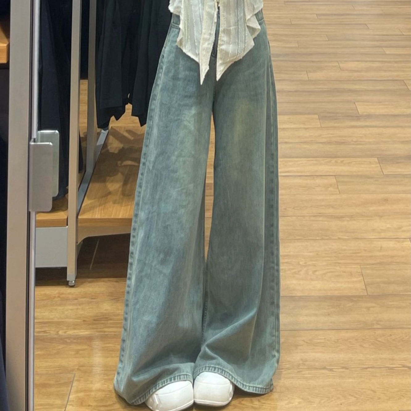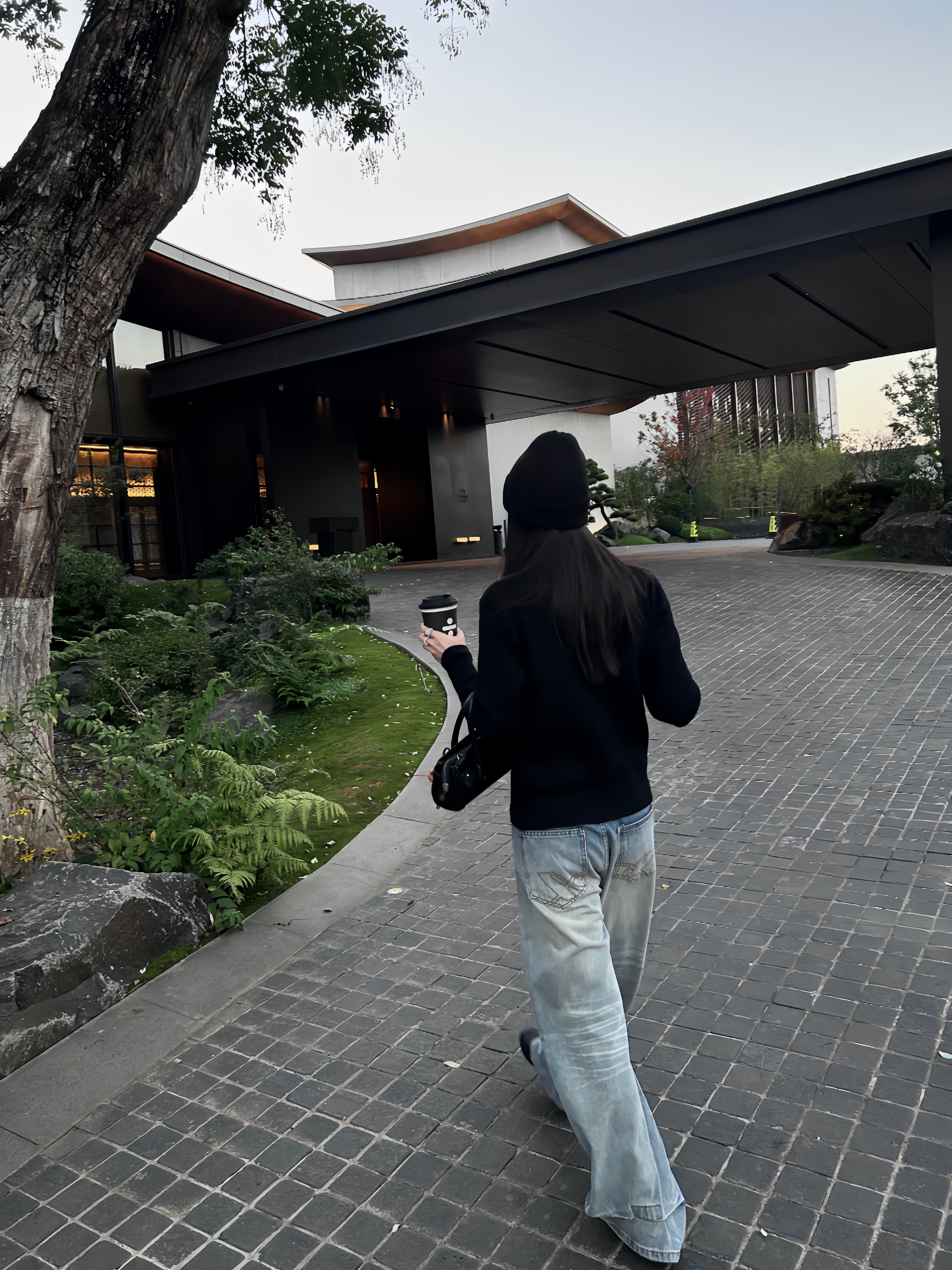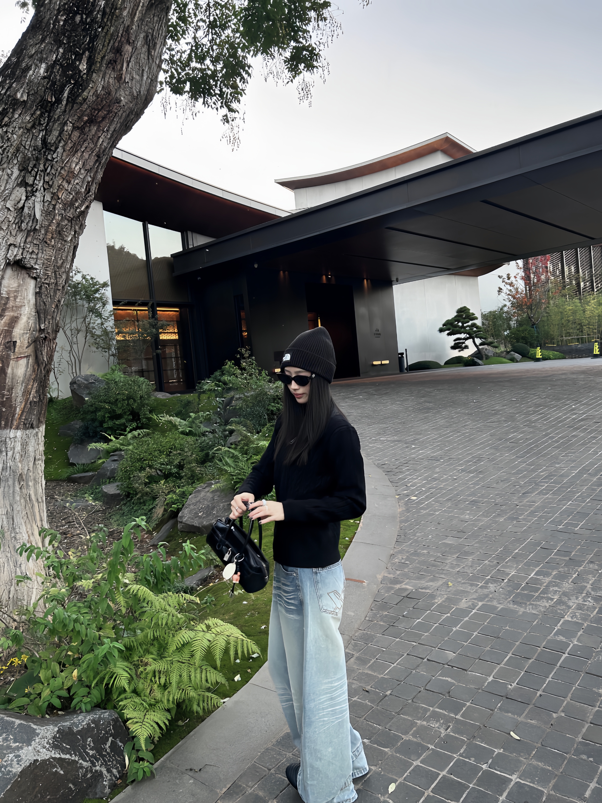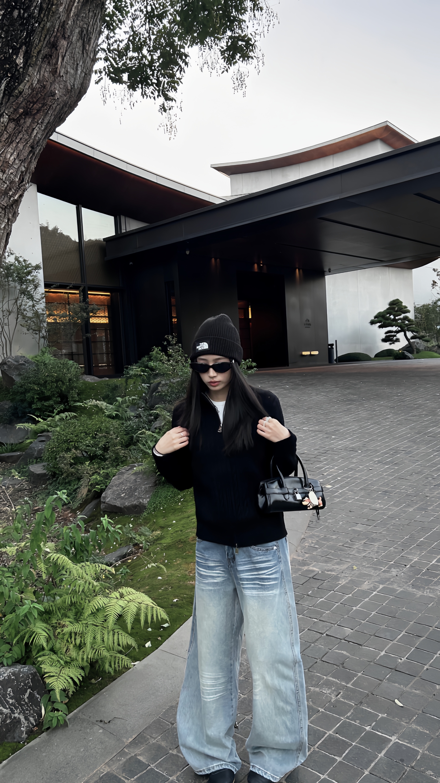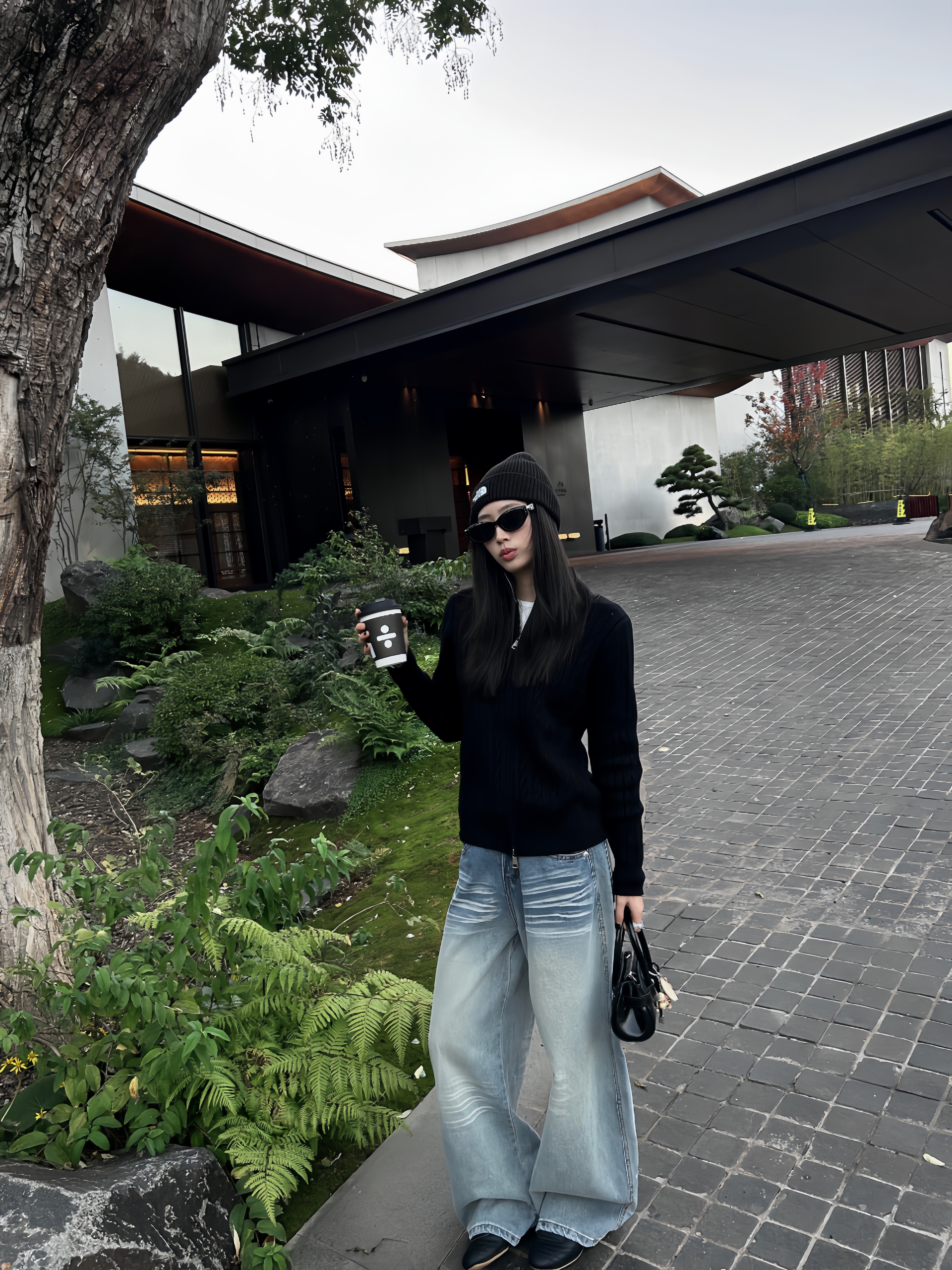 上衣是一件含羊毛的开衫 双拉链的设计更有层次感 下半身搭配的是一条阔腿牛仔裤 浅色下装和上衣的深色搭配 颜色分明更显比例 帽子一如既往是我最爱的单品