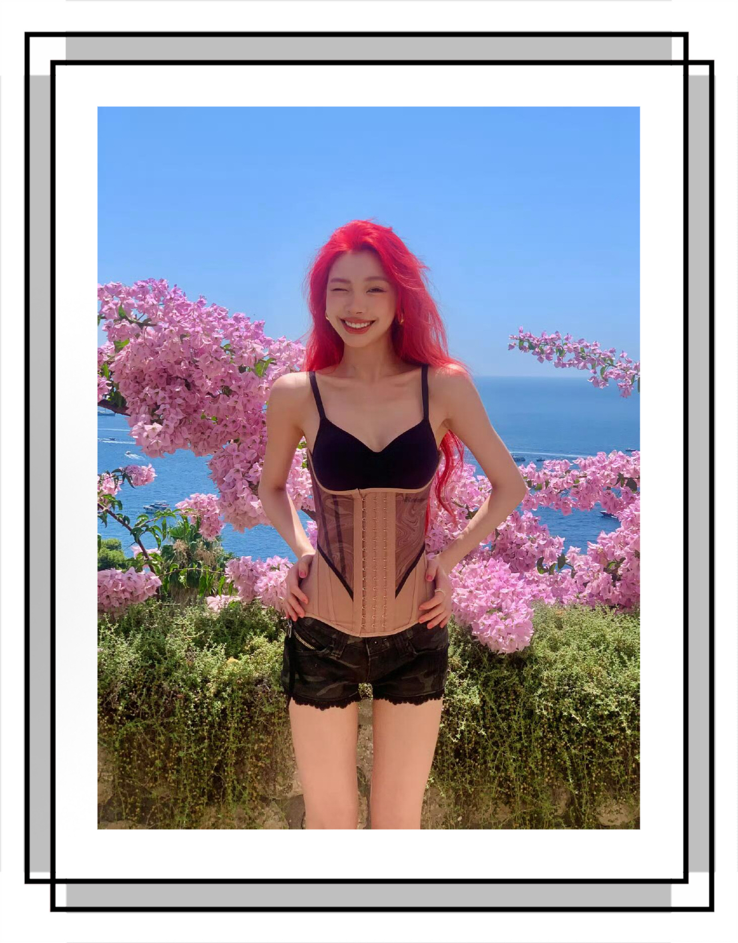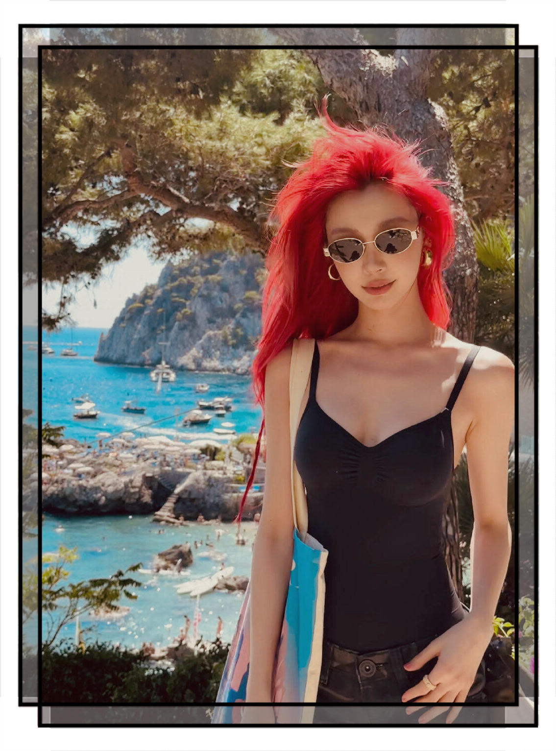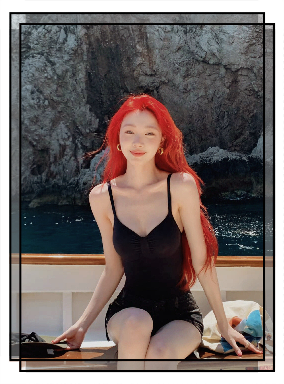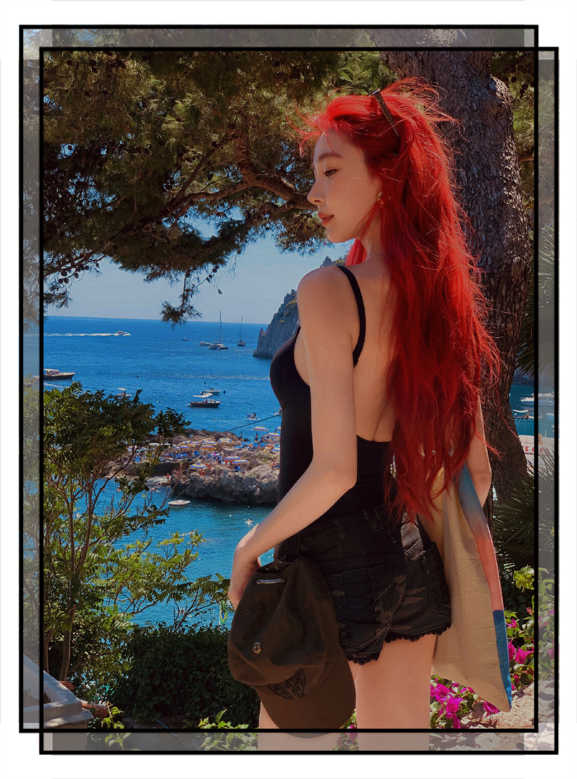 易梦玲这套度假造型太戳夏日氛围!SKIMD黑色吊带打底,叠穿复古束腰勾勒曲线,搭克罗心军帽中和性感,Buccellati金戒添精致细节,红发配碧海蓝天,明艳又松弛~