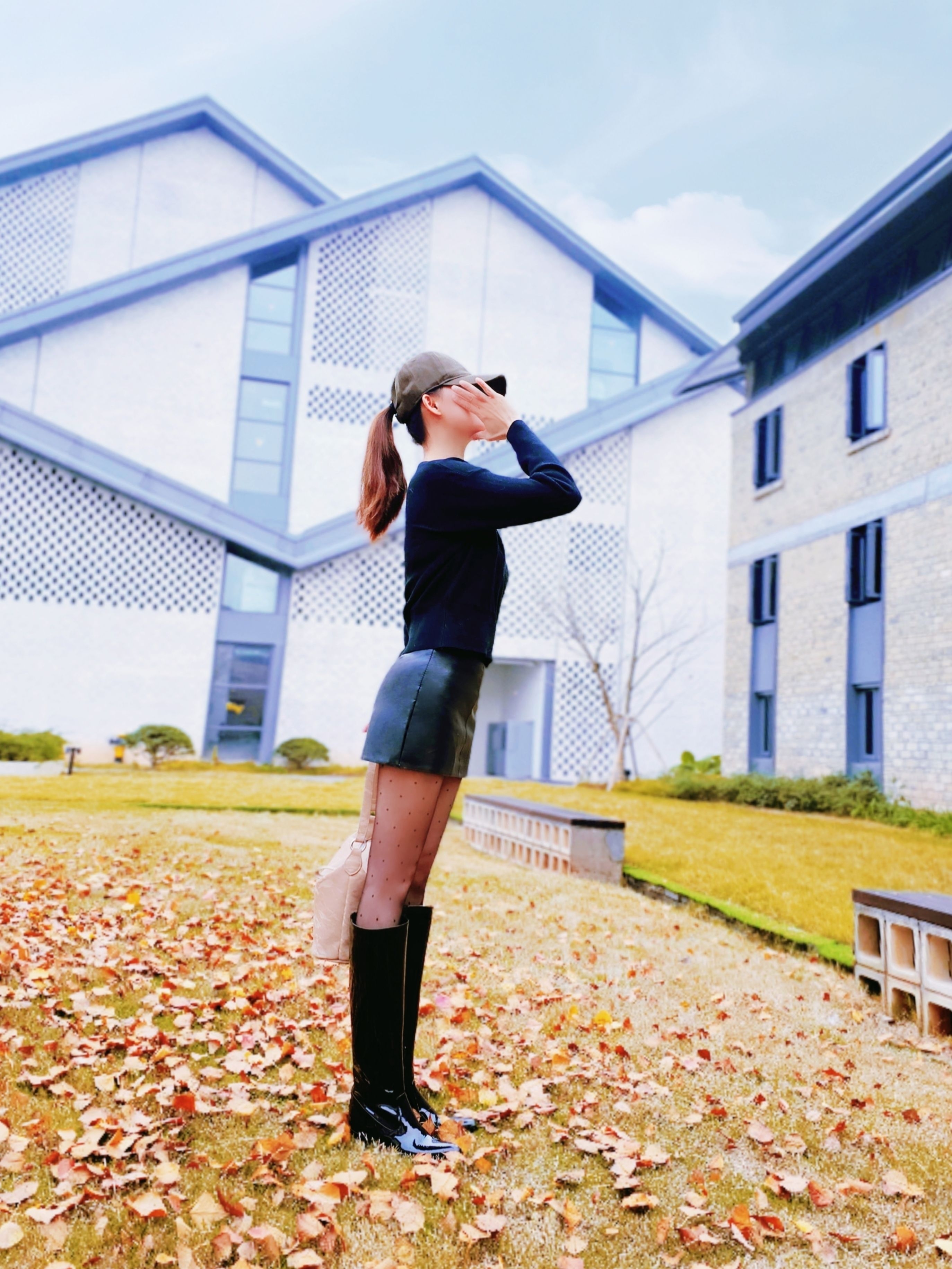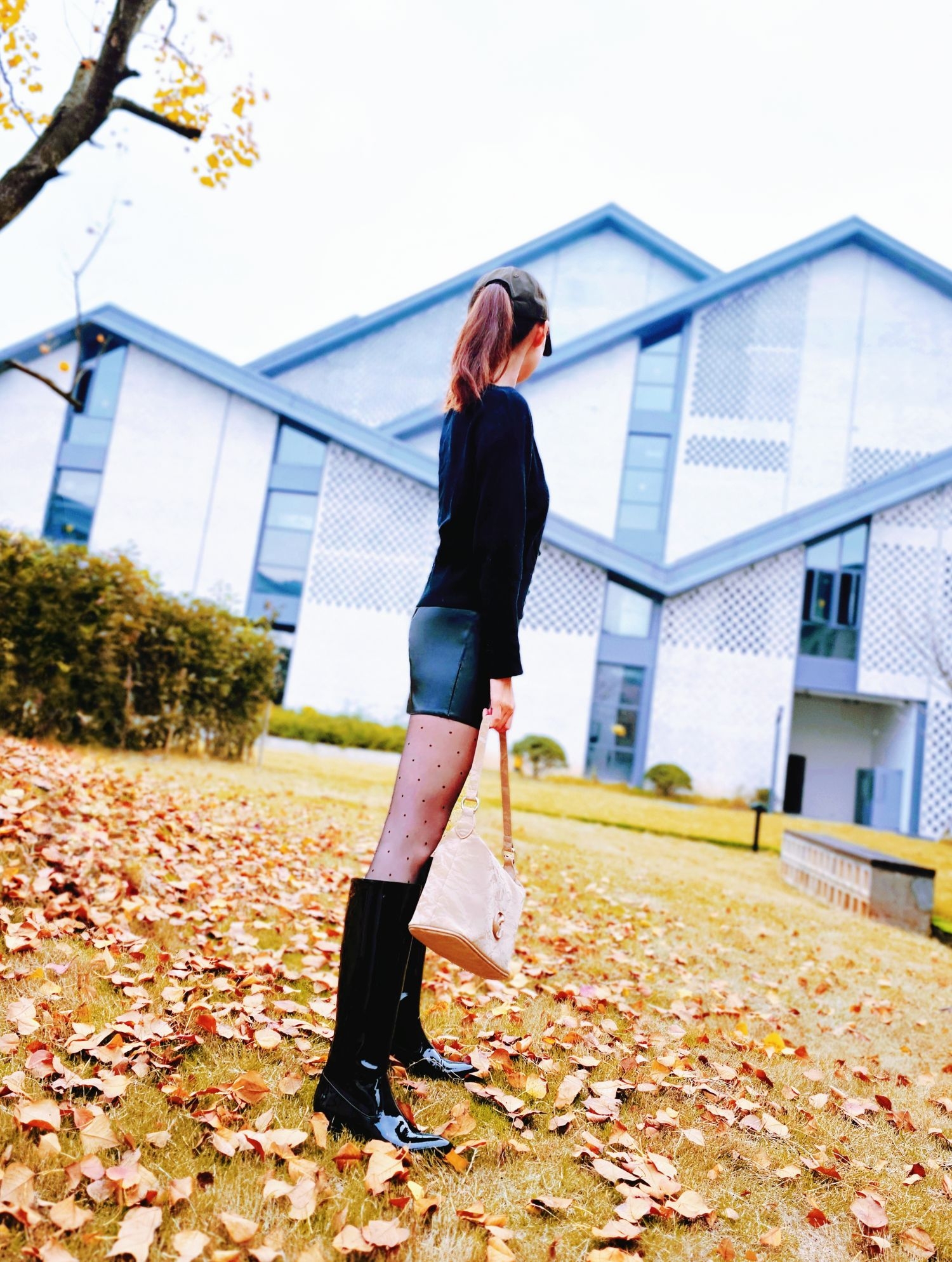 以建筑线条裁切冬日光影~ 皮质短裙与波点丝袜在枯叶堆叠处对话~ 黑色是永不妥协的浪漫宣言~ 用长靴踏出冷冽与柔美的平衡术~ 几何感廓形中,暗色系成为最浓郁的暖意!