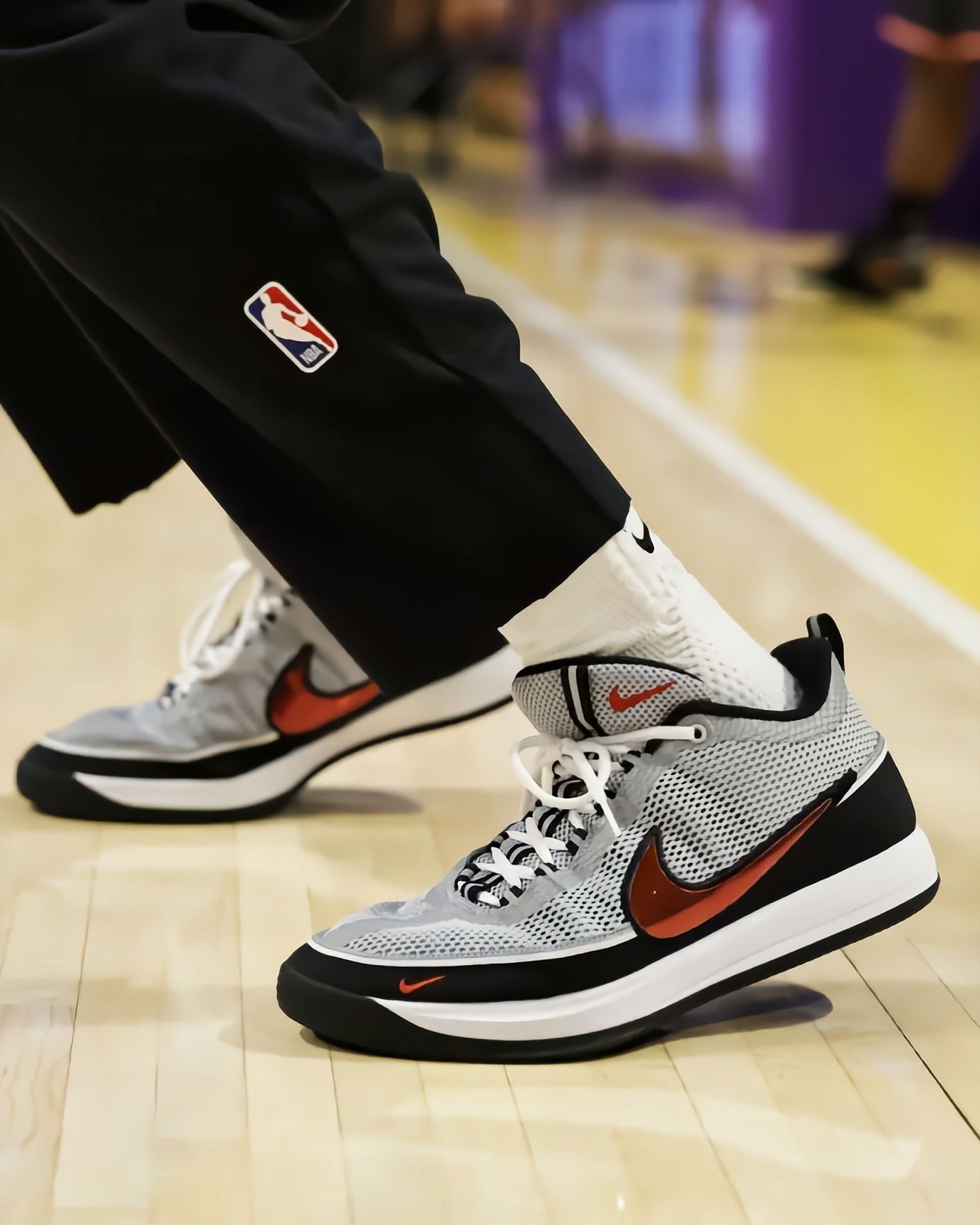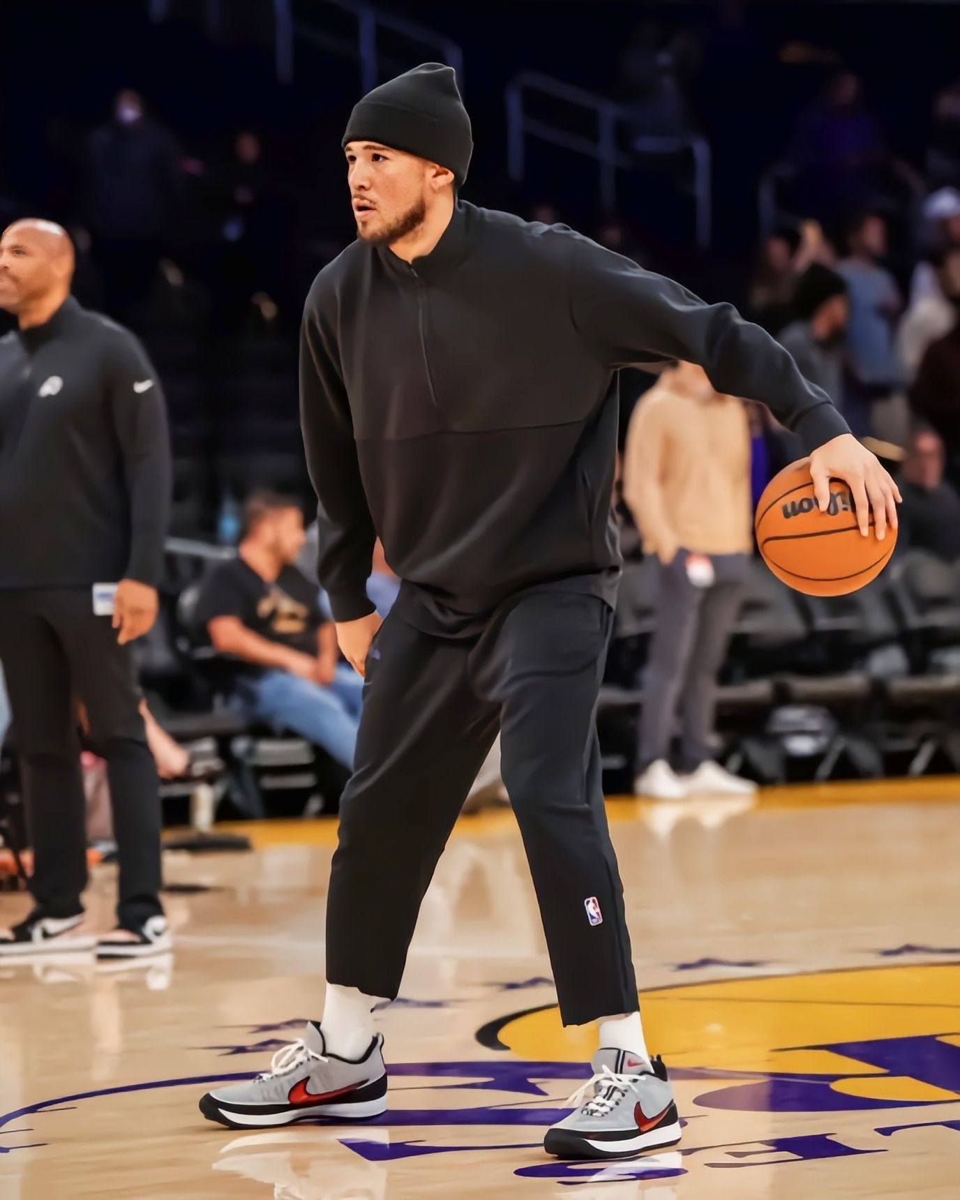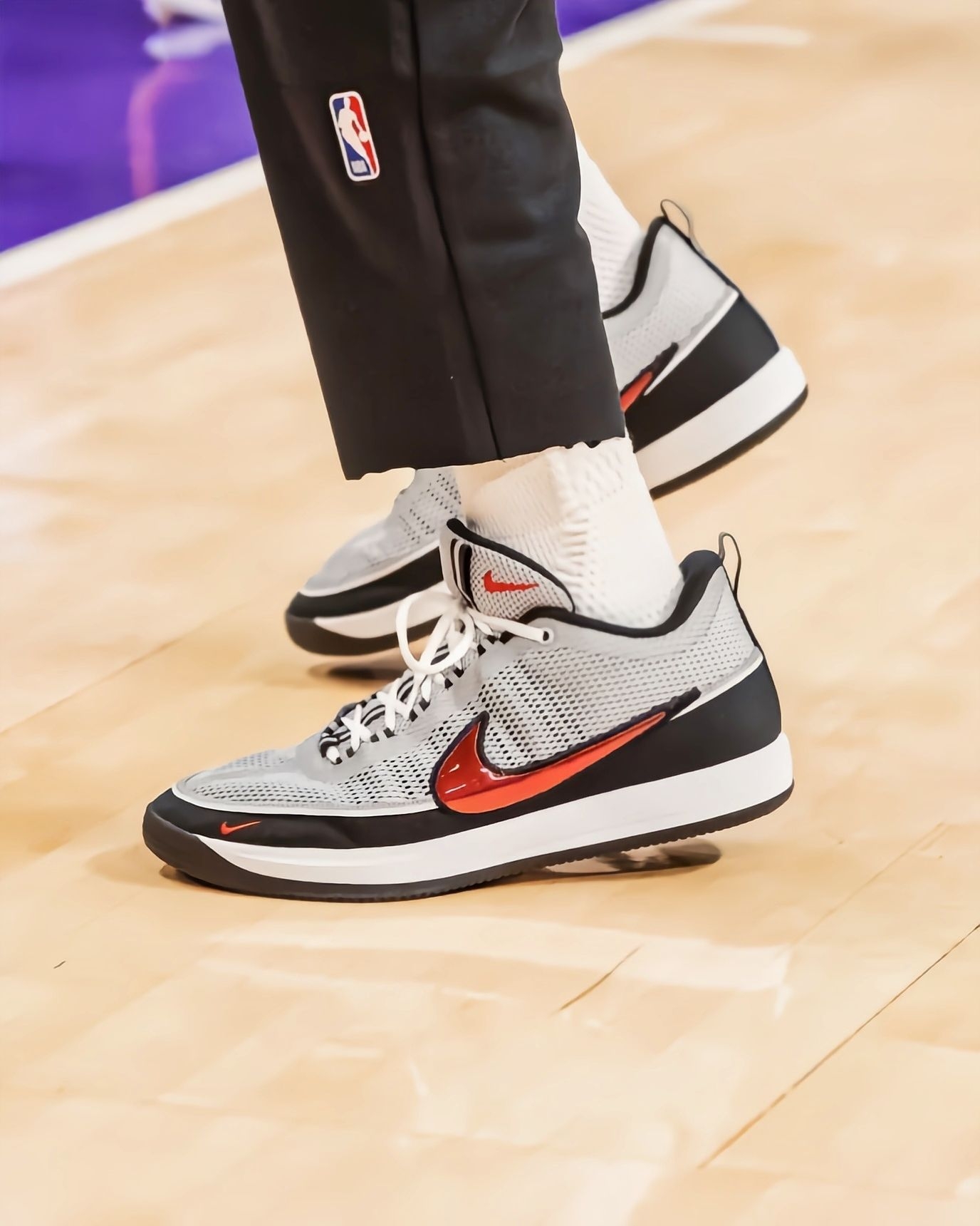 看湖人主场赛前训练,布克这双灰黑红配色的Nike Air Zoom Spiridon联名BOOK2太抢镜了——鞋身的大网眼+亮面红勾,镜头扫到的时候连场边球迷都举手机拍,和他的黑色训练服搭得特别利落。 先聊观赏性:灰黑底色+金属红勾的撞色不浮夸但很有辨识度,鞋舌的“CHAPTER TWO”标识、后跟的“ZOOM SPIRIDON”织带都是细节,尤其是大网眼鞋面的通透感,看着就比普通实战鞋更有“...