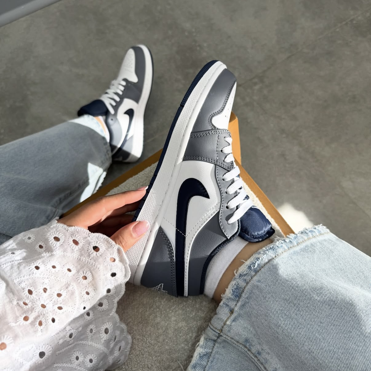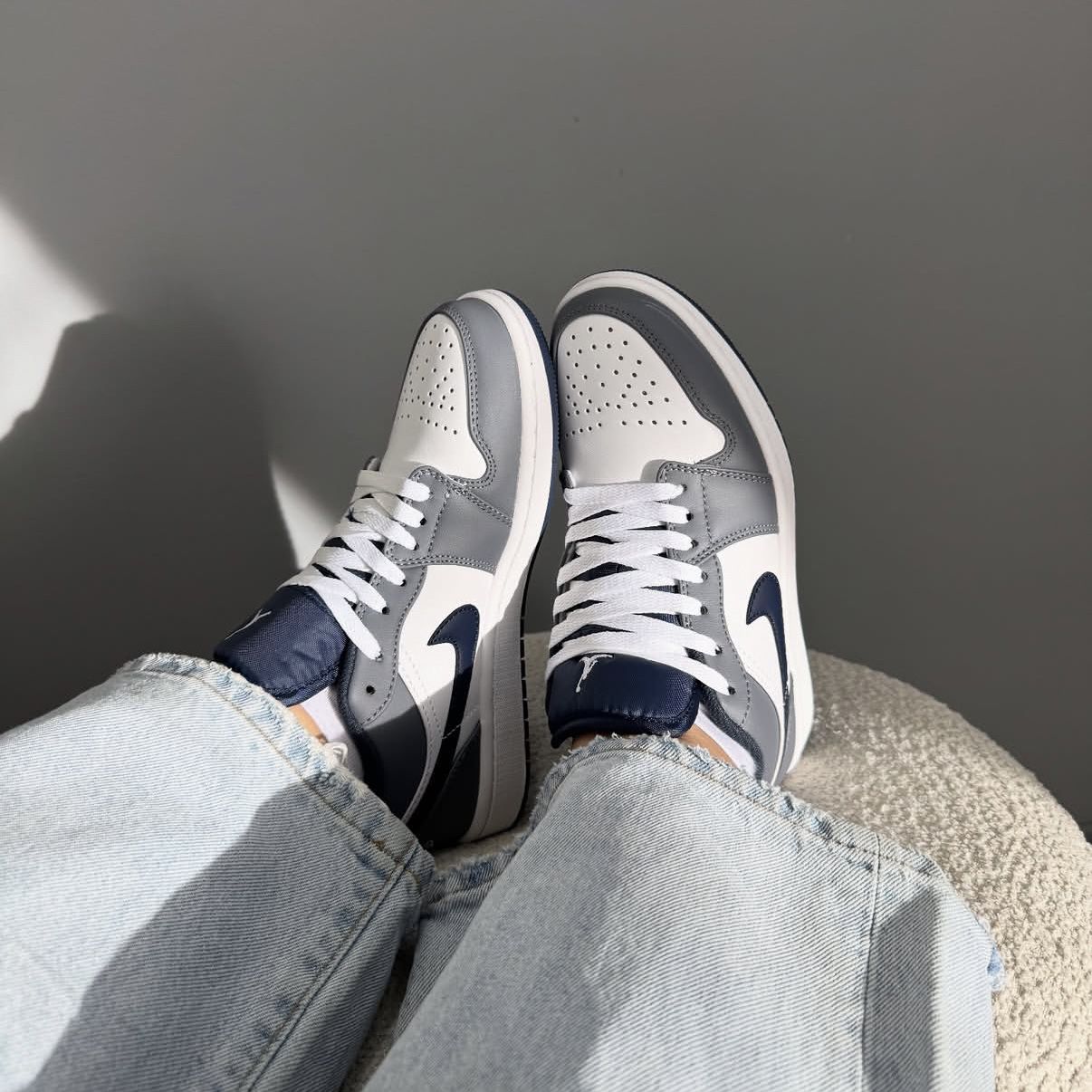 裹着圣诞限定包装纸拆开这双鞋时,灰调皮革像落了薄雪的杉枝,藏蓝勾边又撞出壁炉旁的绒袜配色——连鞋舌的飞人标都像系在礼物盒上的银丝带,踩进雪地靴堆里反而成了最“轻”的圣诞感。灰白金又成了圣诞树旁的“安静背景板”,连鞋边的白边都像沾了糖霜的姜饼边。