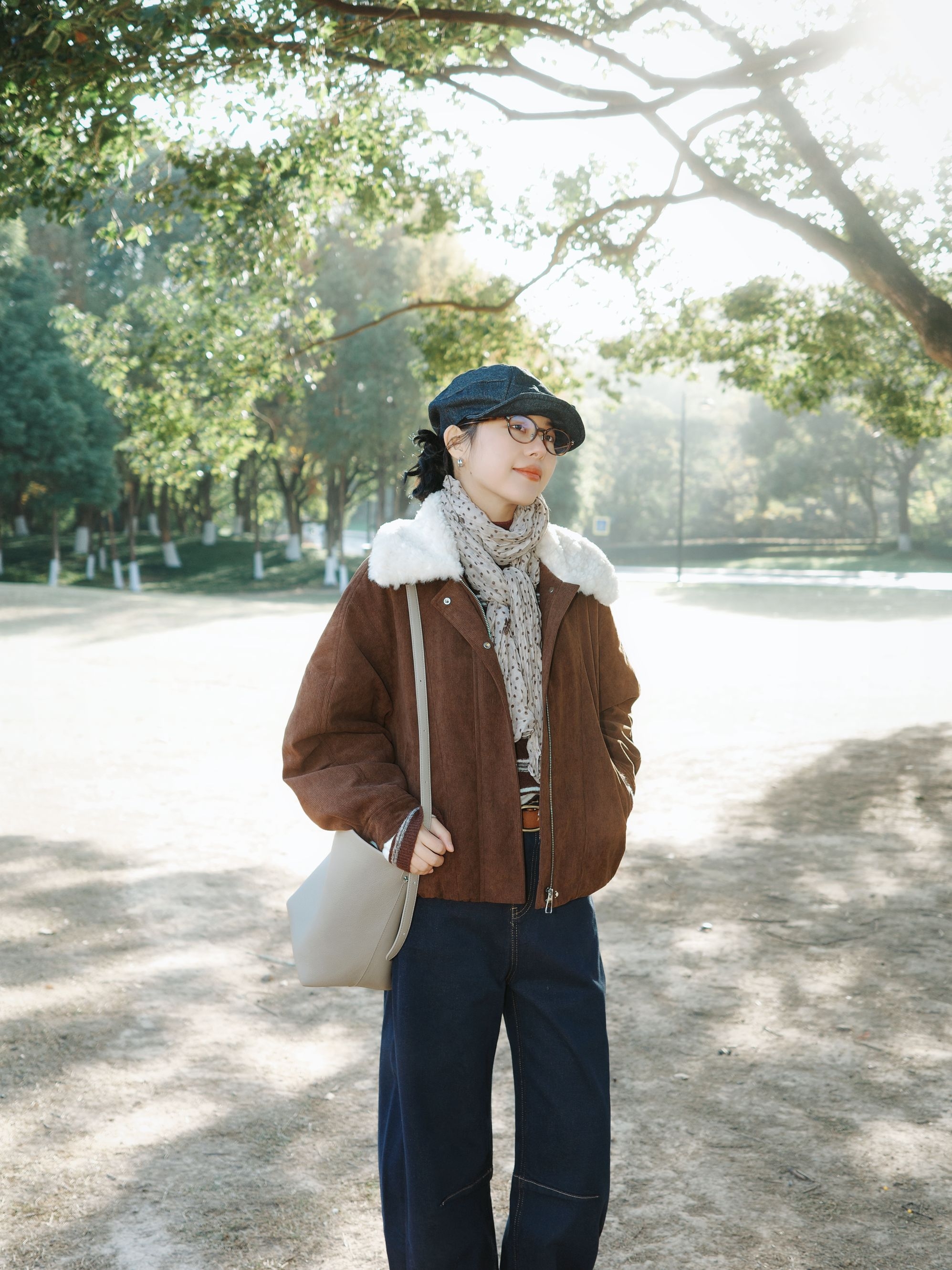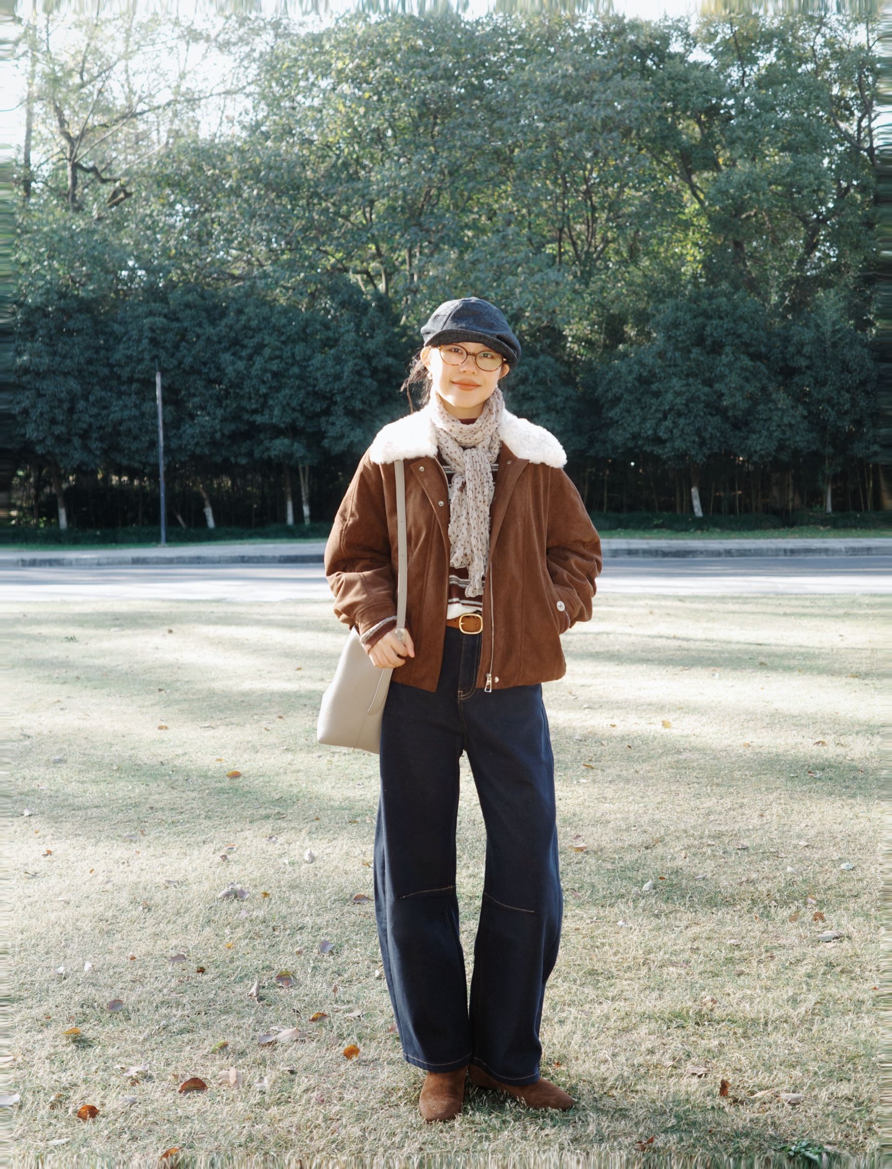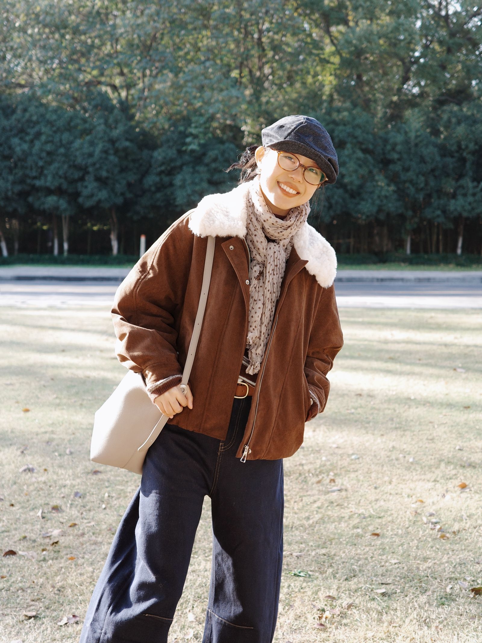 深秋公园闲逛,复古棕调穿搭拿捏慵懒氛围感。 棕色带毛领的夹克也太有复古味道了,内搭条纹针织衫加花纹小围巾,温柔又有层次~ 藏青弯刀牛仔裤配上棕色皮带、复古小皮鞋,再搭上报童帽和浅色单肩包,暖棕调搭配藏青色在深秋里特别和谐,复古休闲风穿起来随性又有氛围感~