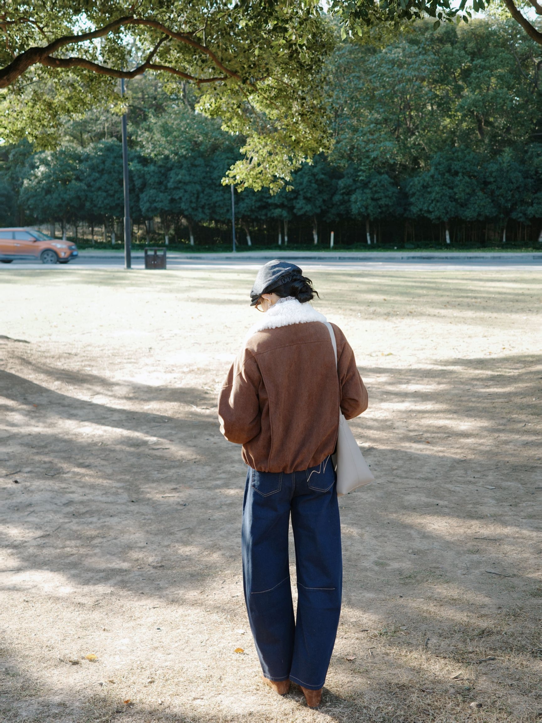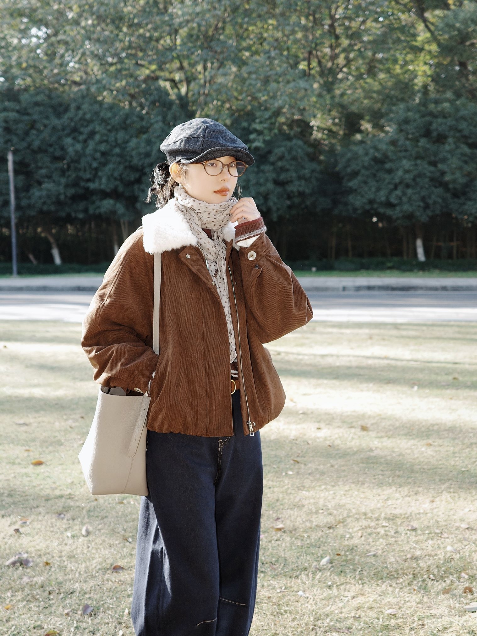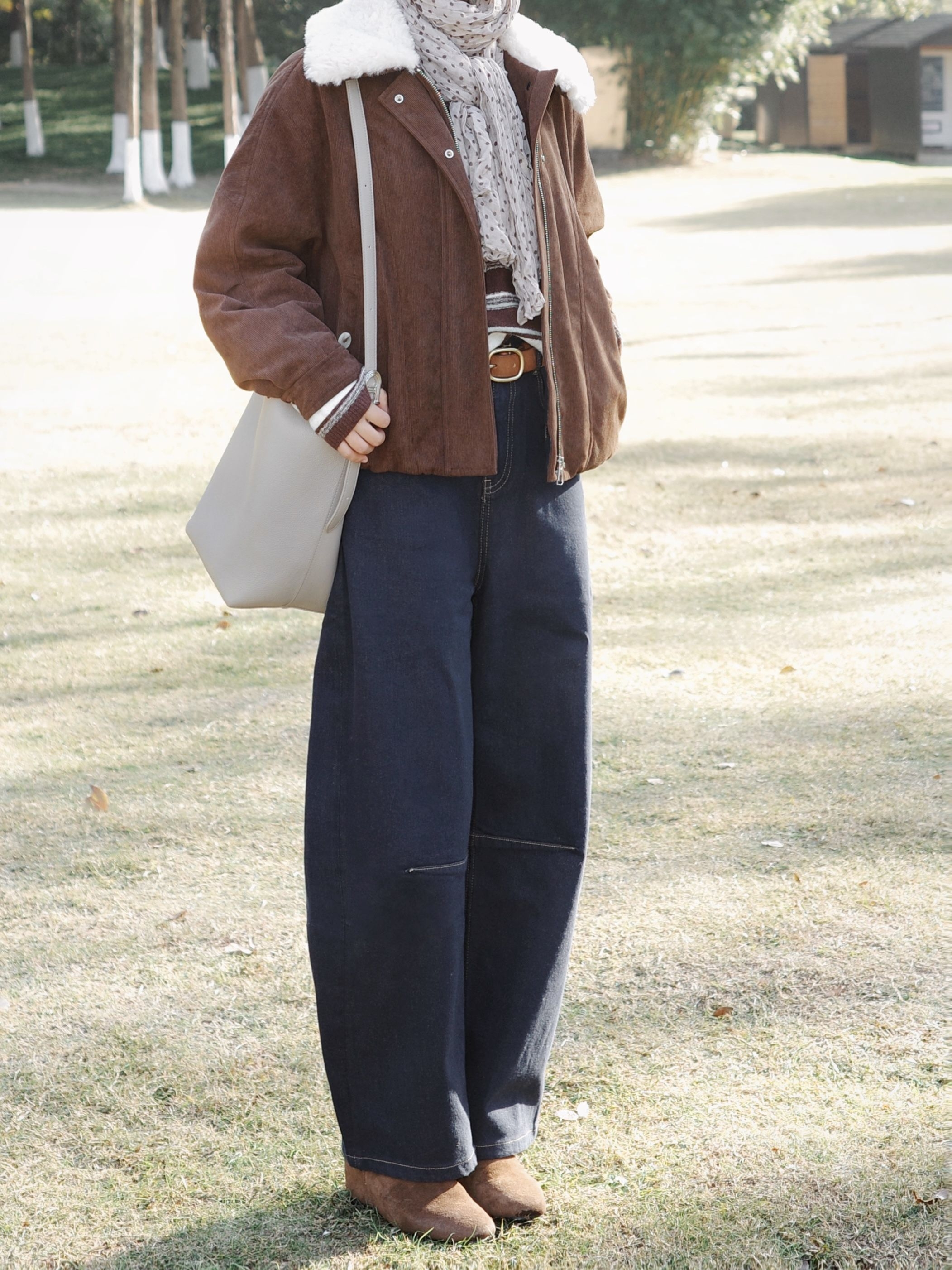 深秋公园闲逛,复古棕调穿搭拿捏慵懒氛围感。 棕色带毛领的夹克也太有复古味道了,内搭条纹针织衫加花纹小围巾,温柔又有层次~ 藏青弯刀牛仔裤配上棕色皮带、复古小皮鞋,再搭上报童帽和浅色单肩包,暖棕调搭配藏青色在深秋里特别和谐,复古休闲风穿起来随性又有氛围感~