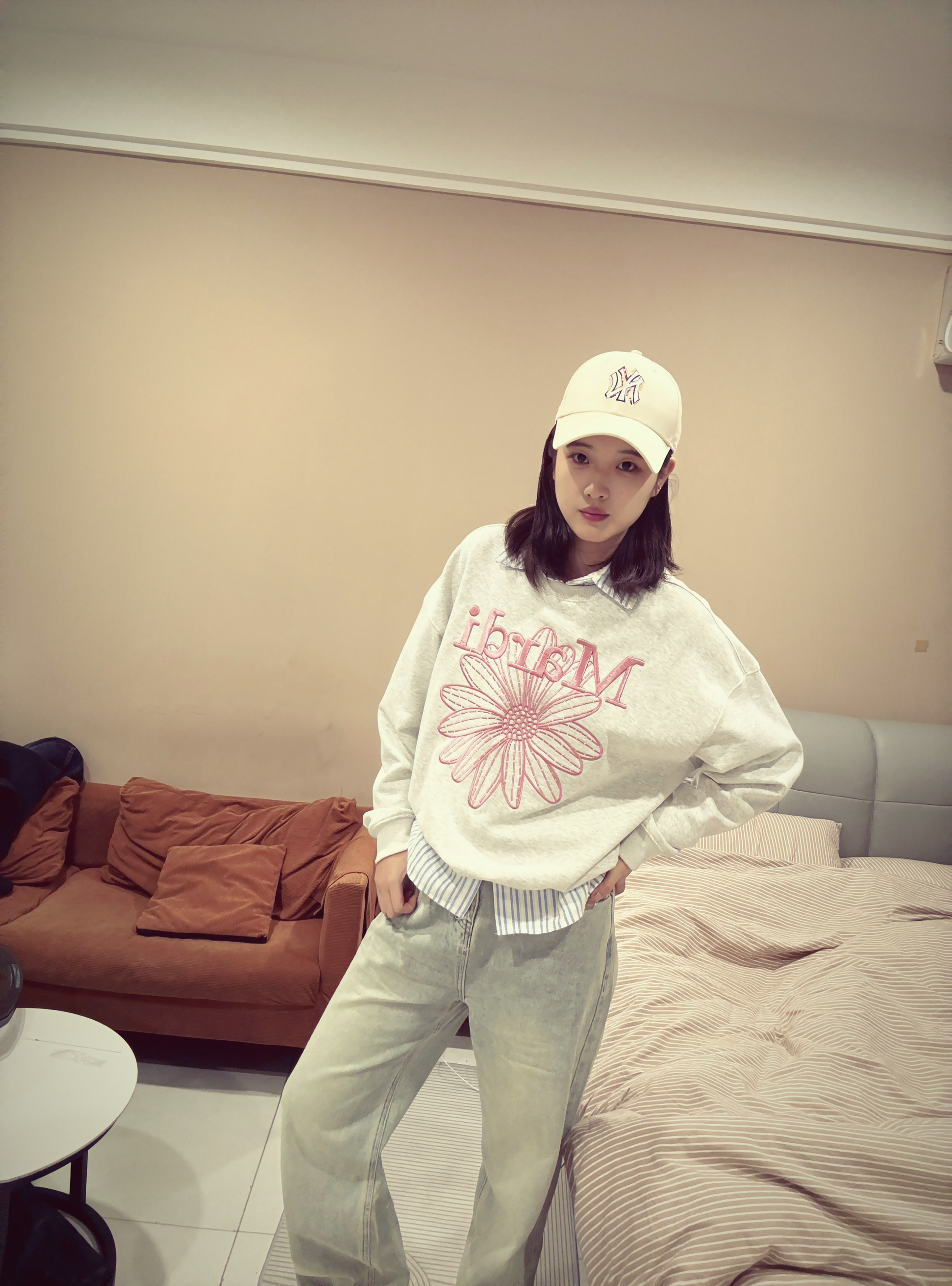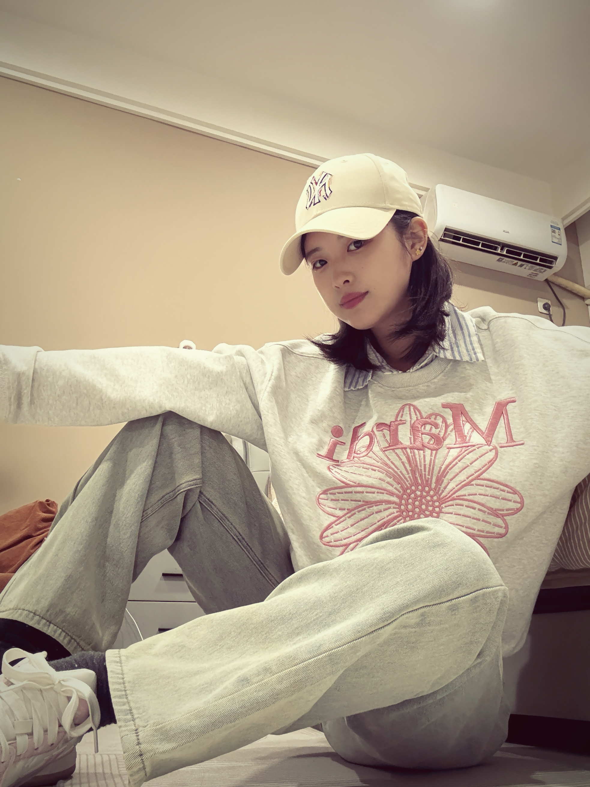 浅灰卫衣搭条纹衬衫,重点夸这条浅蓝阔腿牛仔裤——版型宽松不拖沓,颜色清爽还显腿直,日常随便搭都好看,近期出门基本靠它撑场面~
