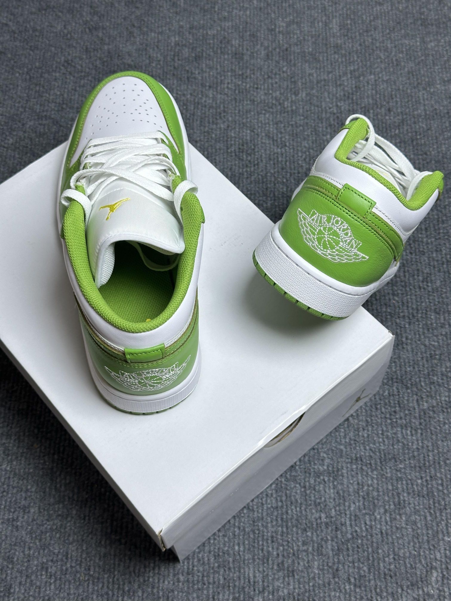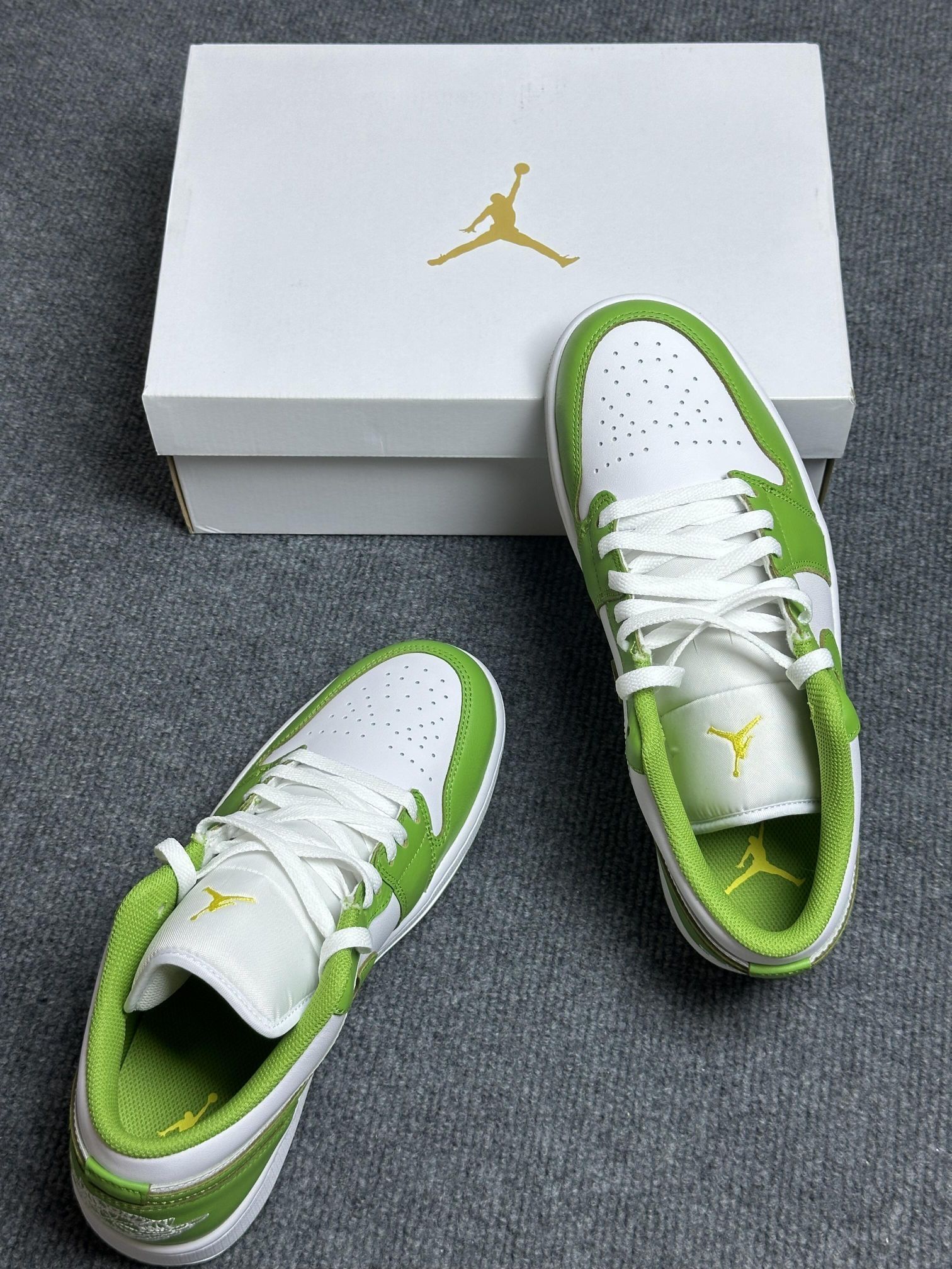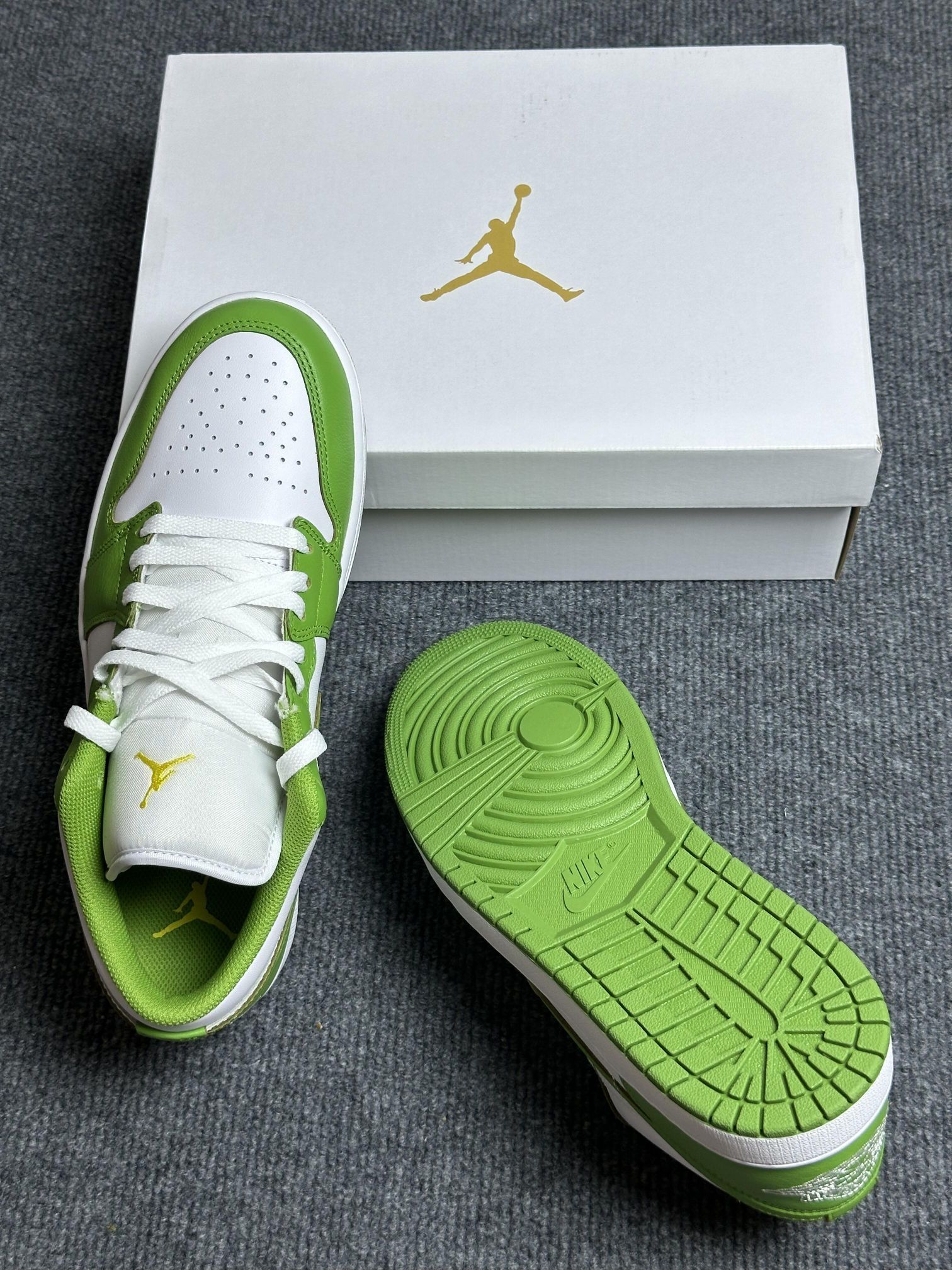✅ 核心亮点 1. 清新配色:青苹果色鞋面搭配纯白中底,注入秋冬清爽活力 2. 舒适脚感:鞋底偏硬但回弹良好,提供稳定包裹与适度缓震 3. 百搭属性:经典AJ1鞋型适配工装裤、直筒牛仔裤等多种裤型 🔥 穿着体验 ・短帮设计优化脚踝灵活性,通勤行走轻松自如 ・硬挺皮革鞋面易于打理,应对秋冬天气变化 ・亮眼配色在深色系穿搭中成为视觉焦点