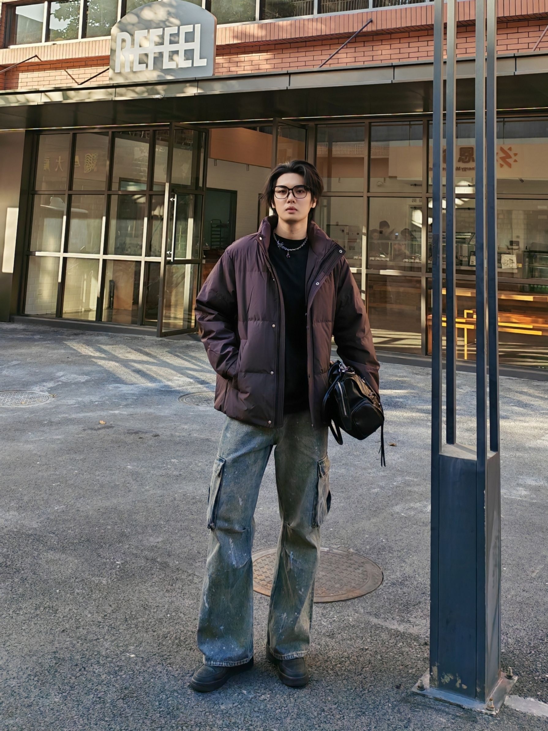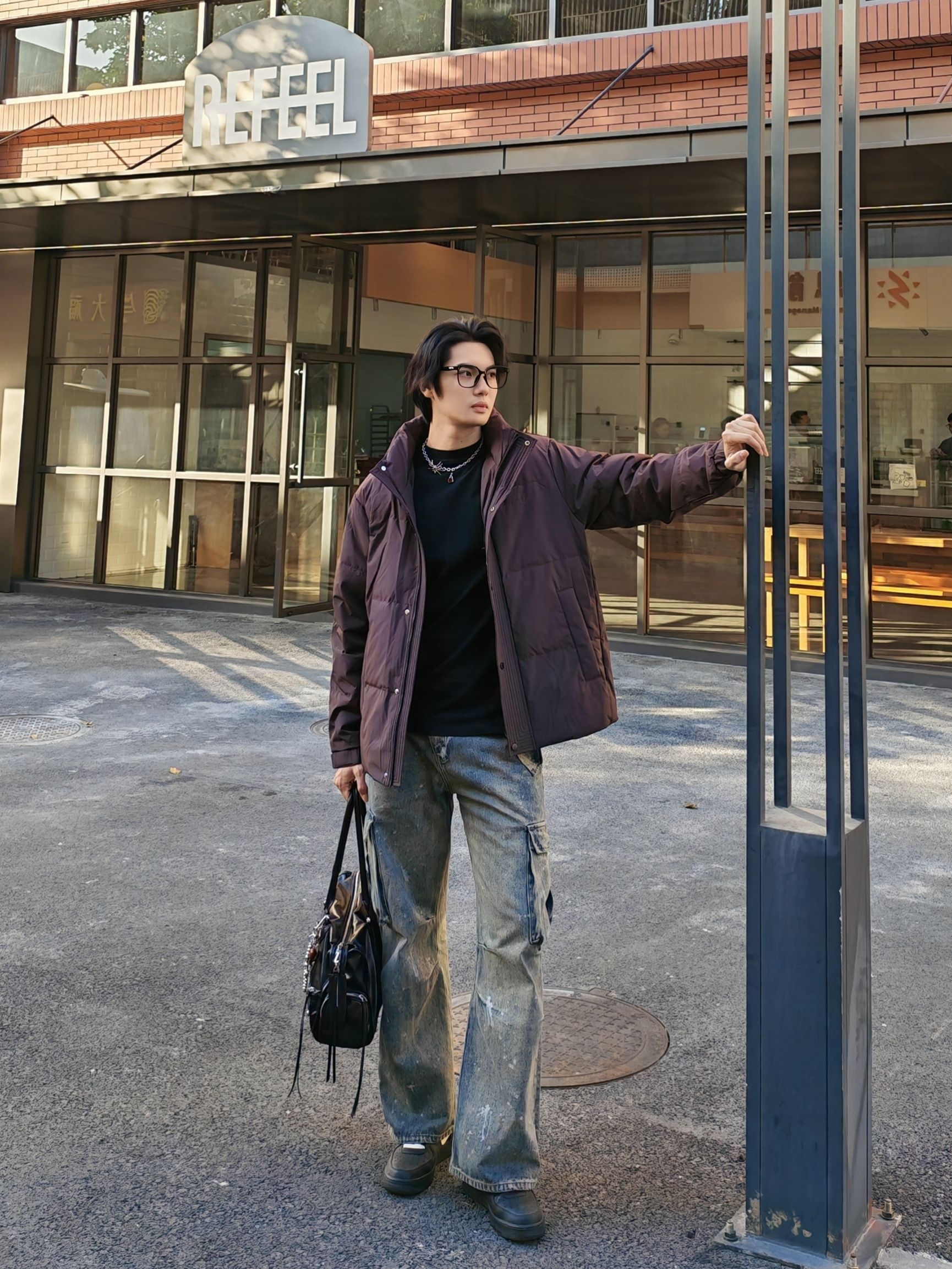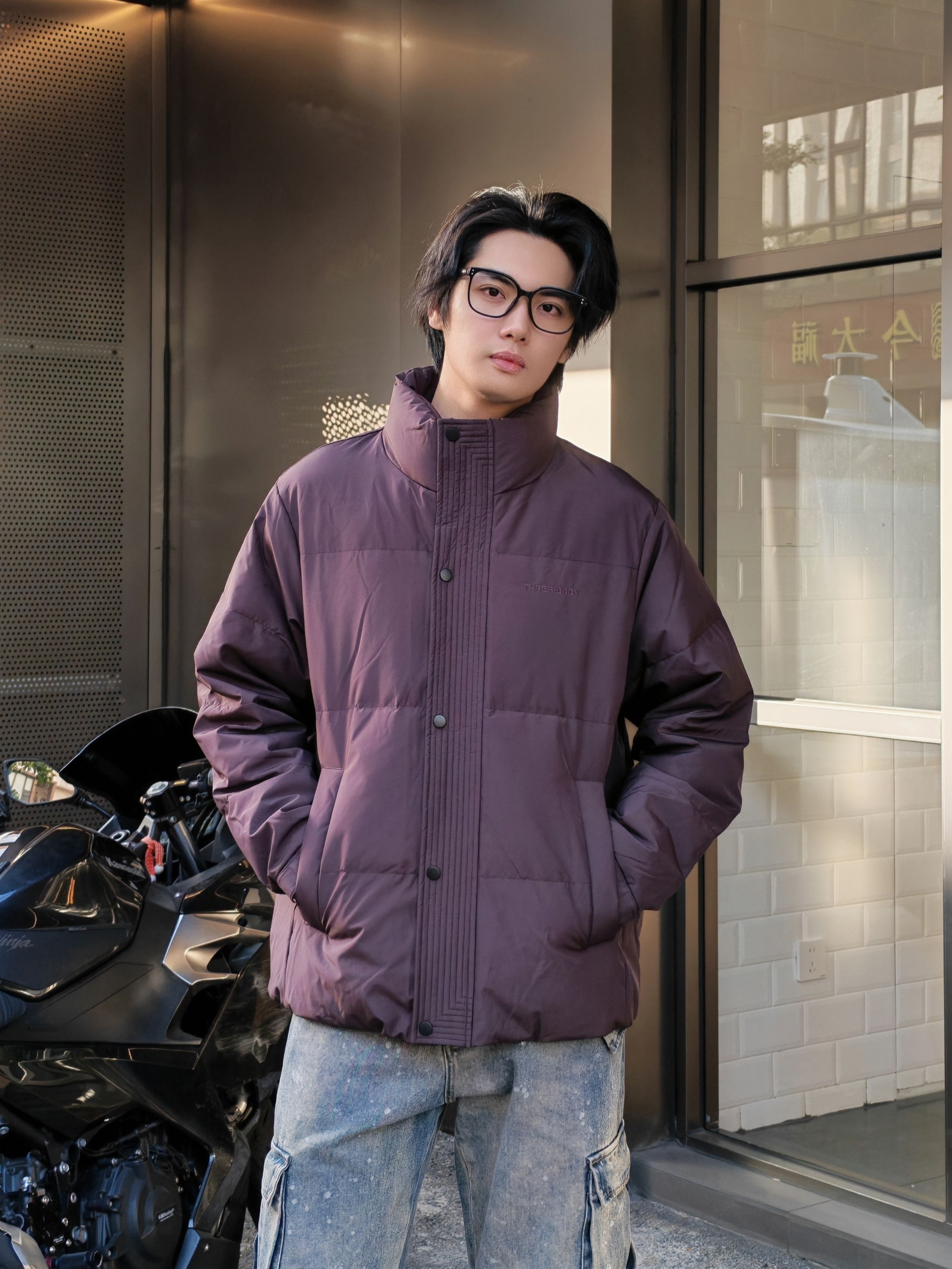 hello呀 这里是酷爱穿搭分享的镭子 海澜之家 HLA 三体联名系列,立领羽绒服,深酒红配色,自带高级感,90绒超轻蓬松面料,穿上暖呼呼,短款版型简约利落。 搭配做旧工装牛仔,泼墨水洗+大口袋,痞帅感直接拉满~ 踩双厚底鞋,背个机能小包,随便往咖啡厅门口一靠,松弛感氛围照秒出片📸