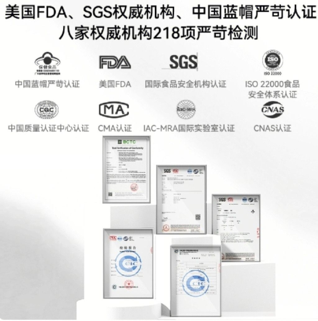 除了自身品质过硬,它还手握多项权威认证,不仅有国家“蓝帽”保健食品认证,还通过了美国FDA、SGS、ISO 22000等八家权威机构认证,完整的检测报告涵盖重金属、微生物等多个维度,多重认证层层把关,进一步印证了其金标品质,性价比与安全性双在线。