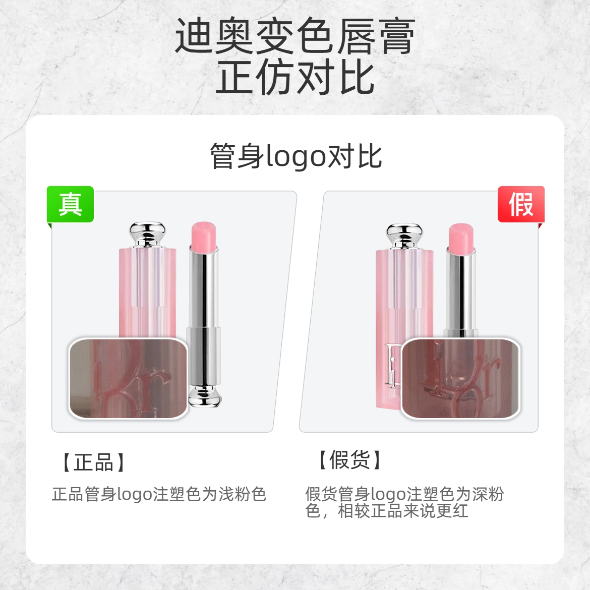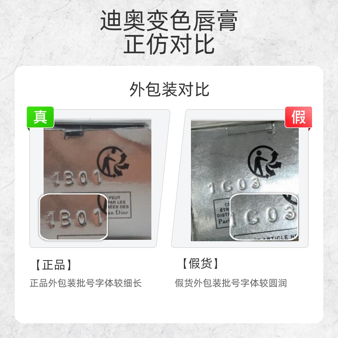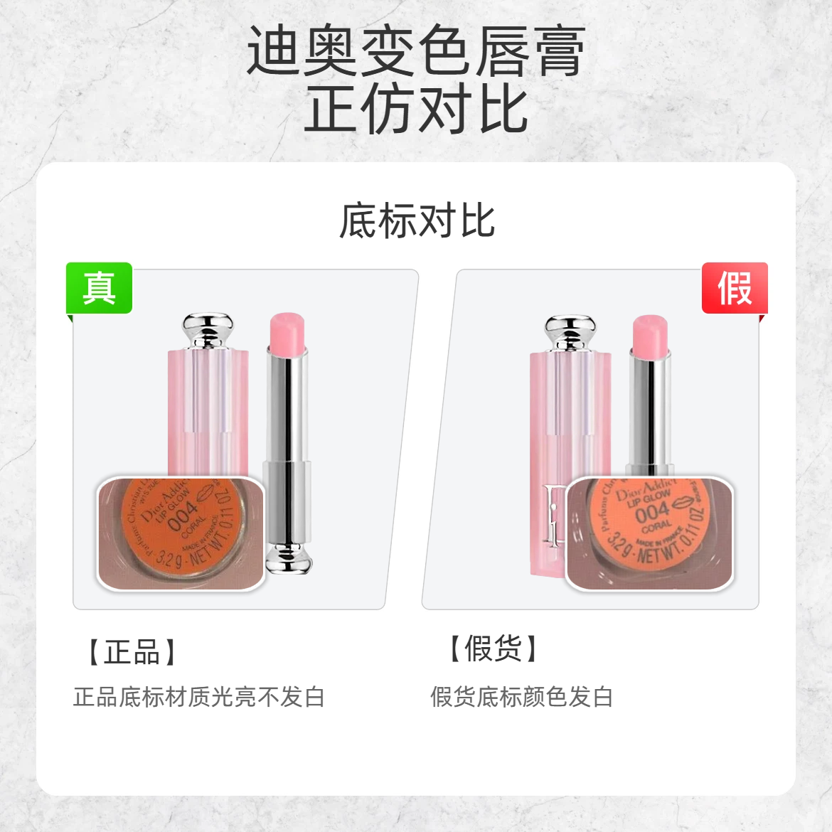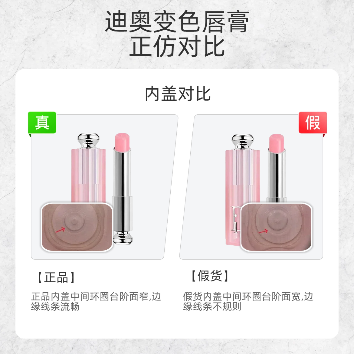 火了 N 年的迪奥变色唇膏,假货也是泛滥成灾!今天扒品牌藏死的鉴别细节,看完直接避坑👇 🔨细节 1:外包装批号 - 真货:外包装批号字体是纤细修长的 - 假货:外包装批号字体是圆胖臃肿的 🔨细节 2:管身logo - 真货:管身 Dior logo 是浅粉透亮的,和管身颜色融为一体 - 假货:管身 Dior logo 是深粉偏红的 🔨细节 3:内盖 - 真货:内盖中间环圈台阶窄且流畅,边缘是...