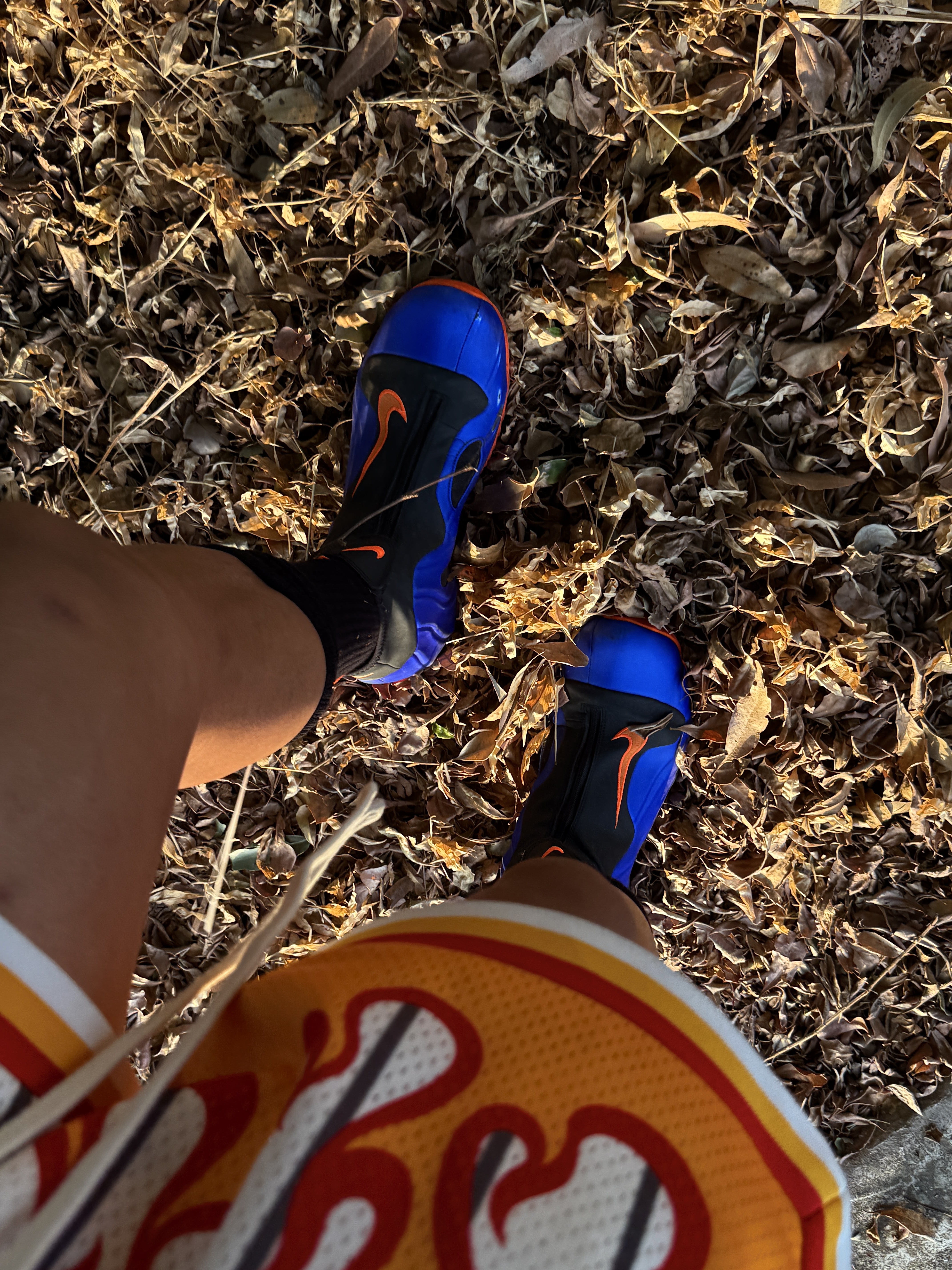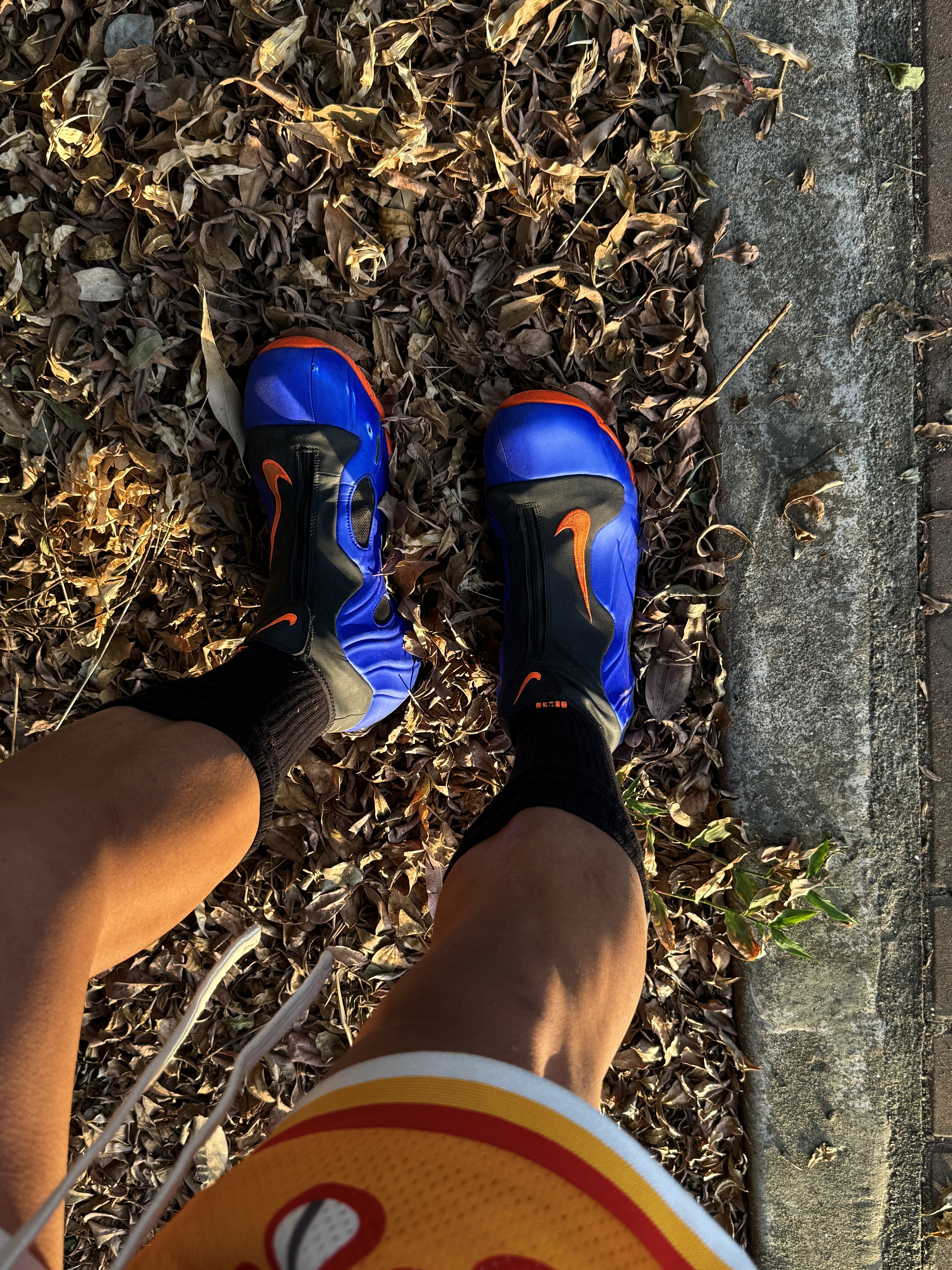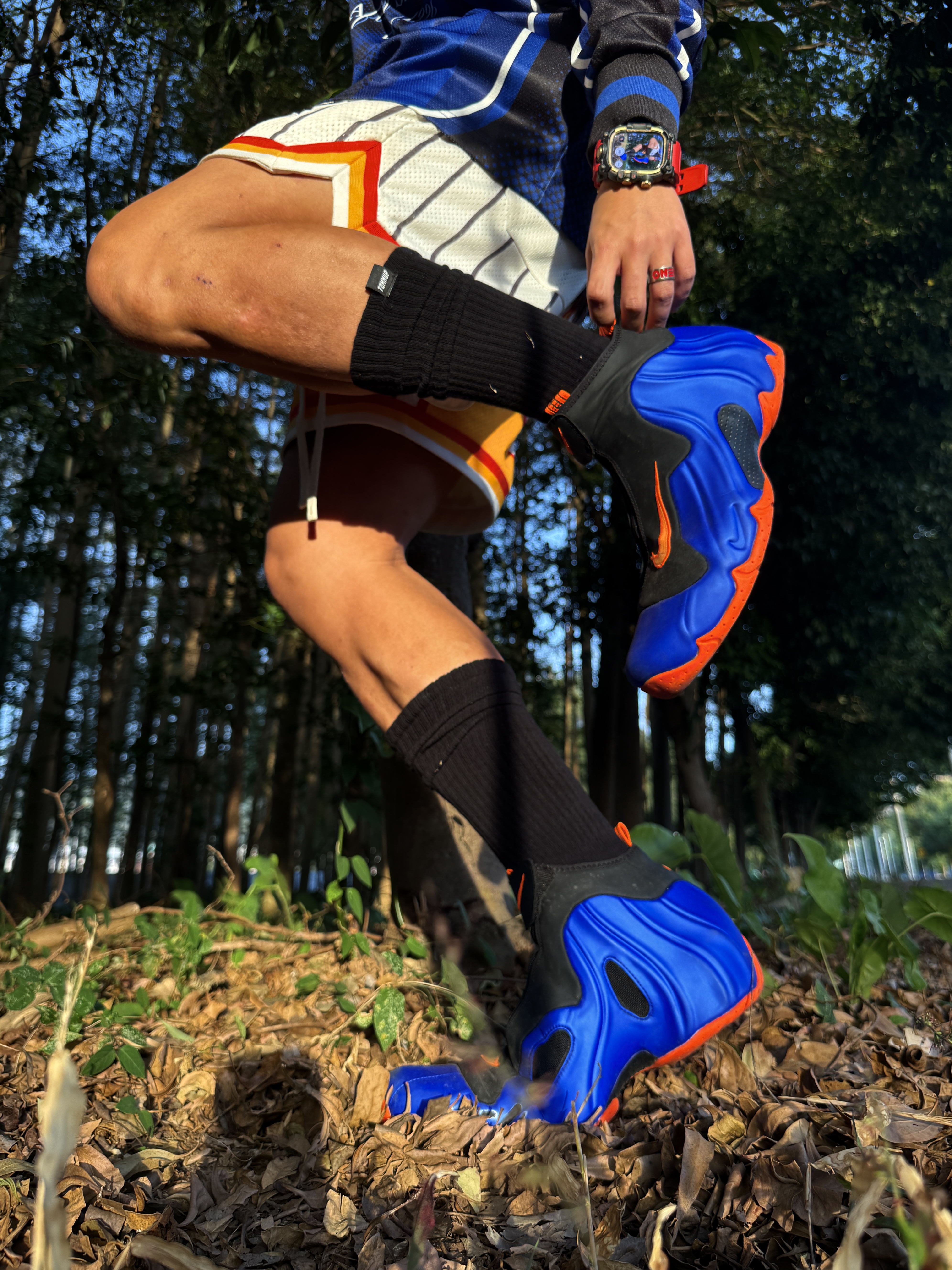 Hey bro‼️这里是小熊的球鞋日记 ▪️蓝黑球衣➕火焰纹短裤,千禧篮球复古感快要溢出屏幕,配上黑袜,版型上复古运动不拖沓,落叶树林户外场景和街头穿搭形成mix混搭感,可以称之为“城市野球风”吗❓ ▪️上脚我超爱的尼克斯风一👟蓝橙尼克斯球队撞色让这双视觉冲击力超强,这也是我超爱它的原因;拉链+内靴设计,包裹感拉满的同时拉链细节也是复古科技的标志元素💯 ▪️尺码方面必须得选大一到两码,看着厚...