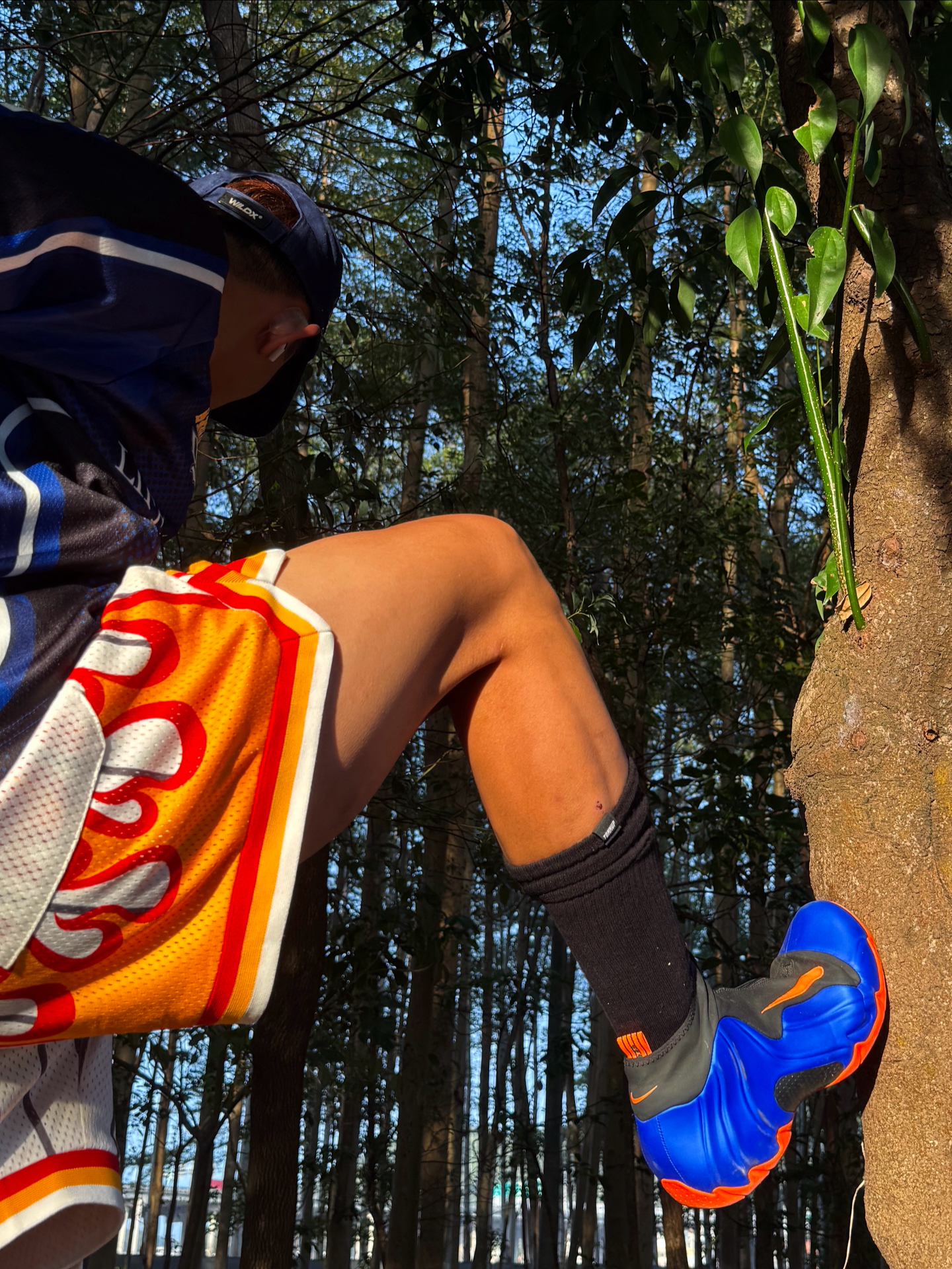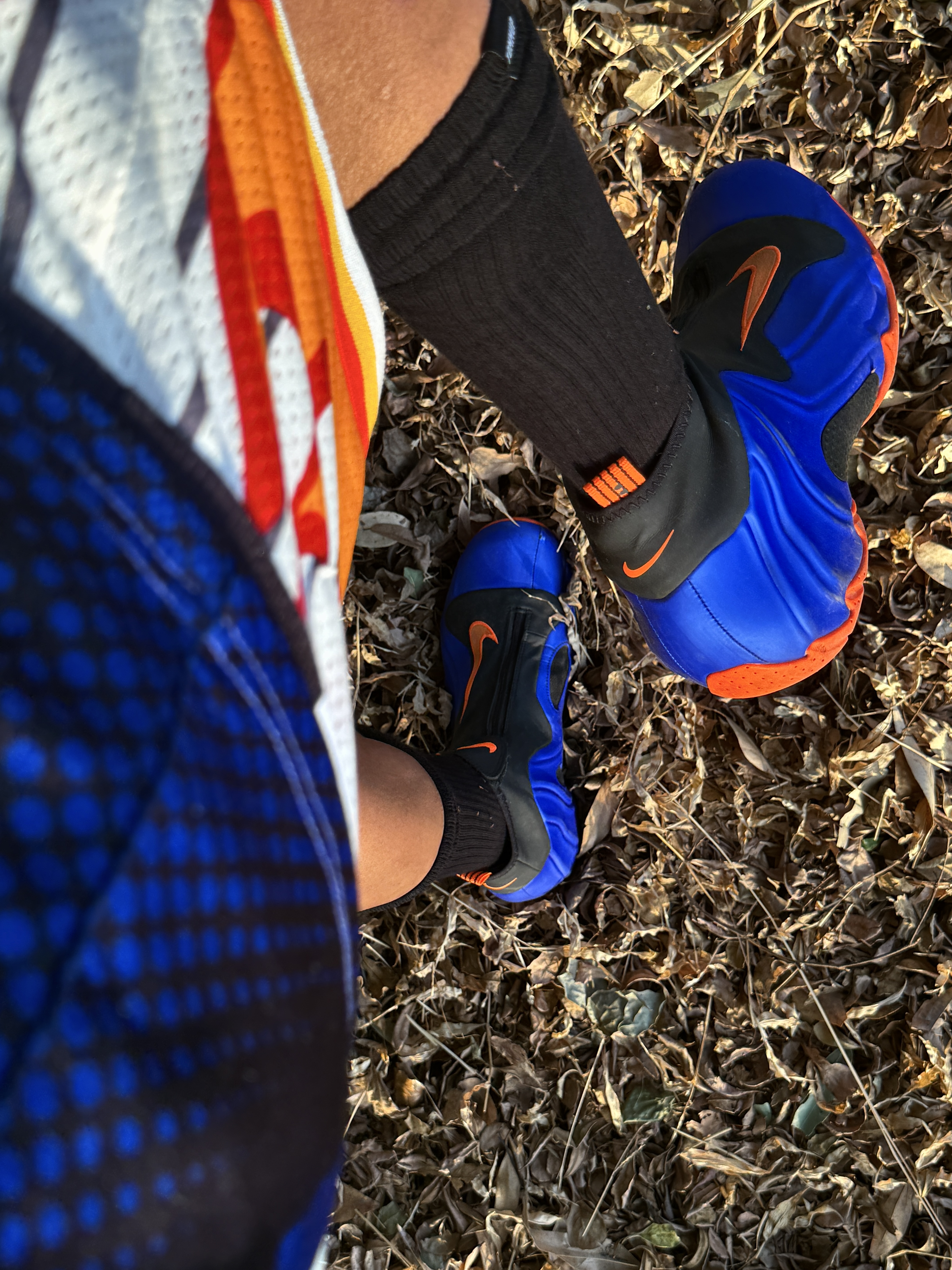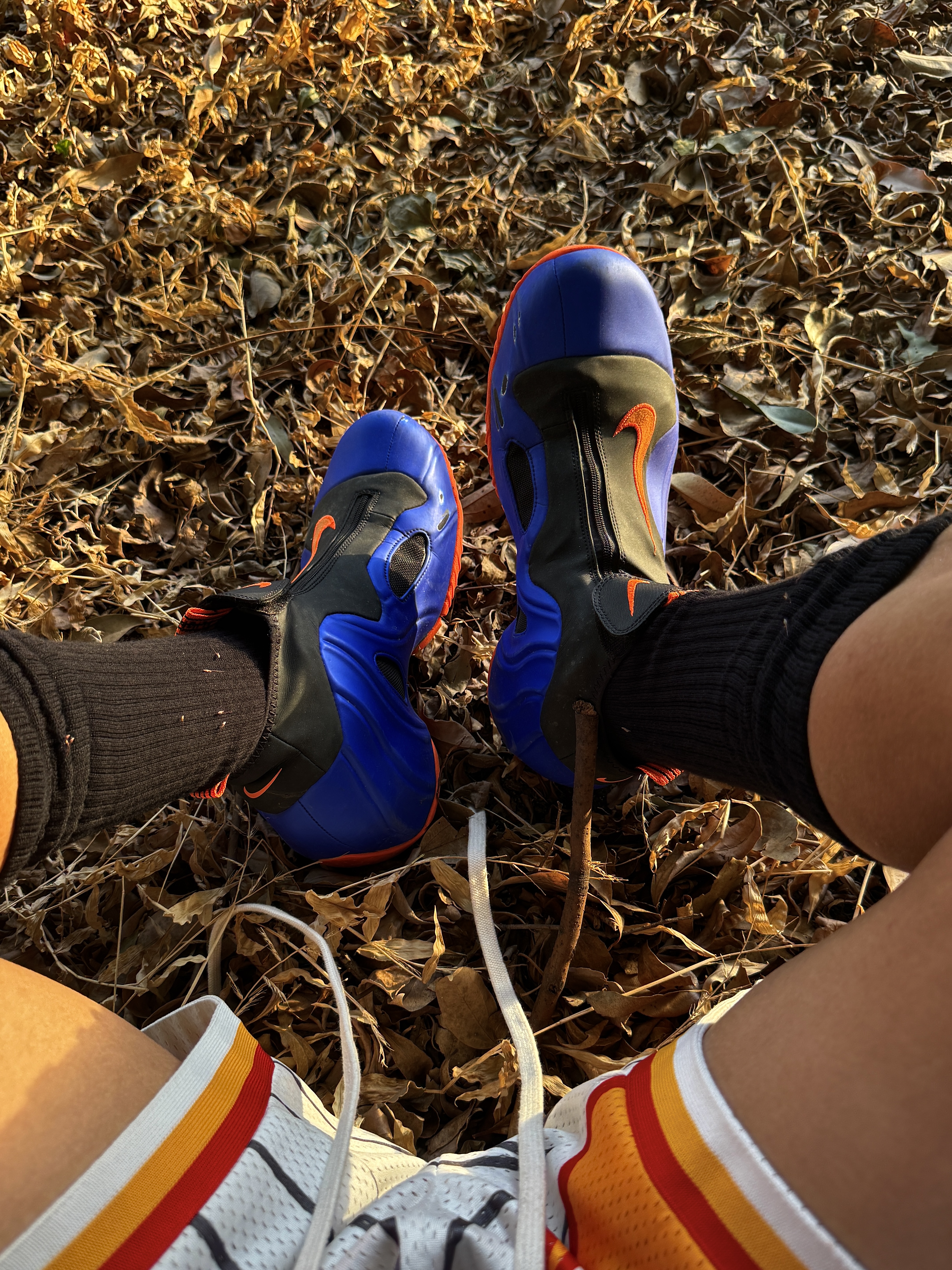Hey bro‼️这里是小熊的球鞋日记 ▪️蓝黑球衣➕火焰纹短裤,千禧篮球复古感快要溢出屏幕,配上黑袜,版型上复古运动不拖沓,落叶树林户外场景和街头穿搭形成mix混搭感,可以称之为“城市野球风”吗❓ ▪️上脚我超爱的尼克斯风一👟蓝橙尼克斯球队撞色让这双视觉冲击力超强,这也是我超爱它的原因;拉链+内靴设计,包裹感拉满的同时拉链细节也是复古科技的标志元素💯 ▪️尺码方面必须得选大一到两码,看着厚...