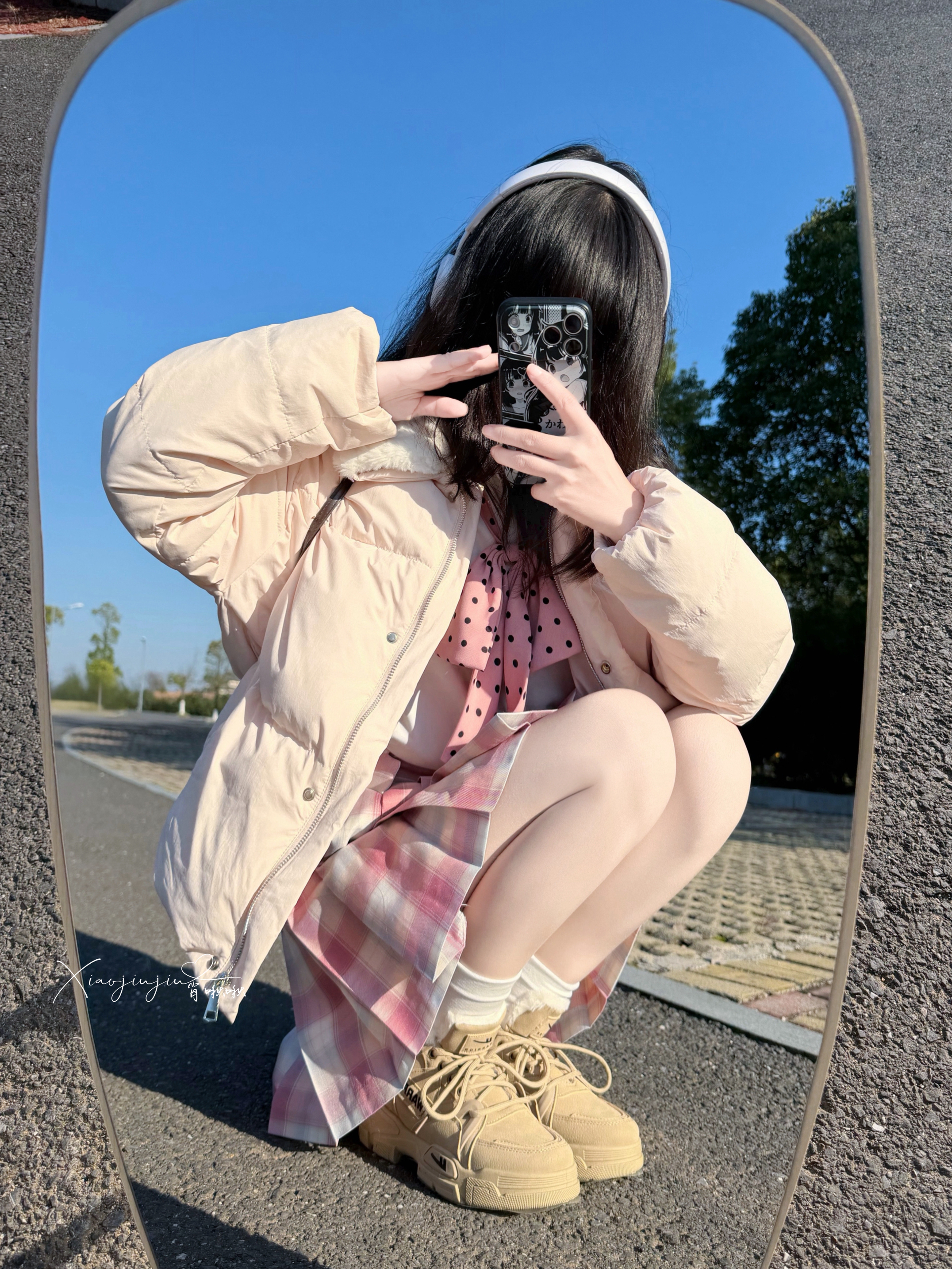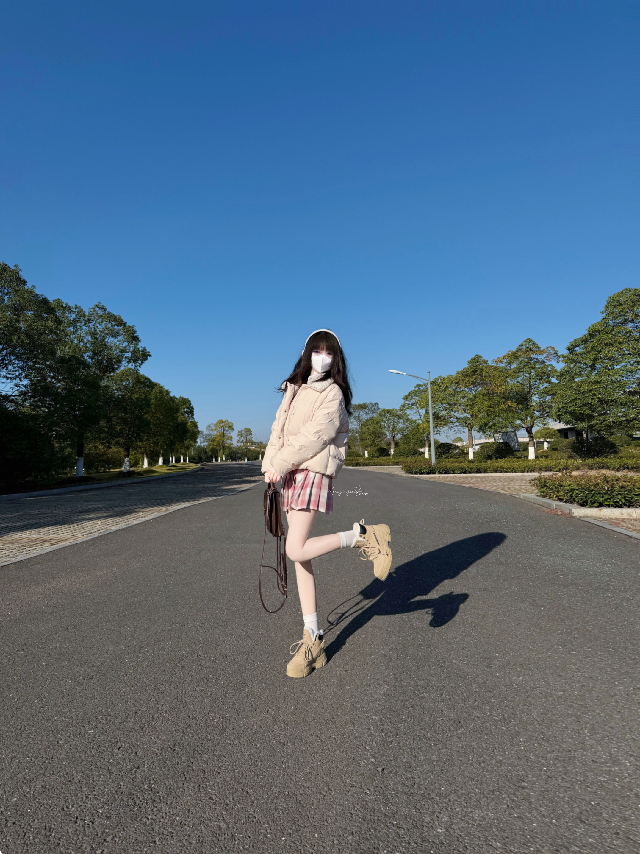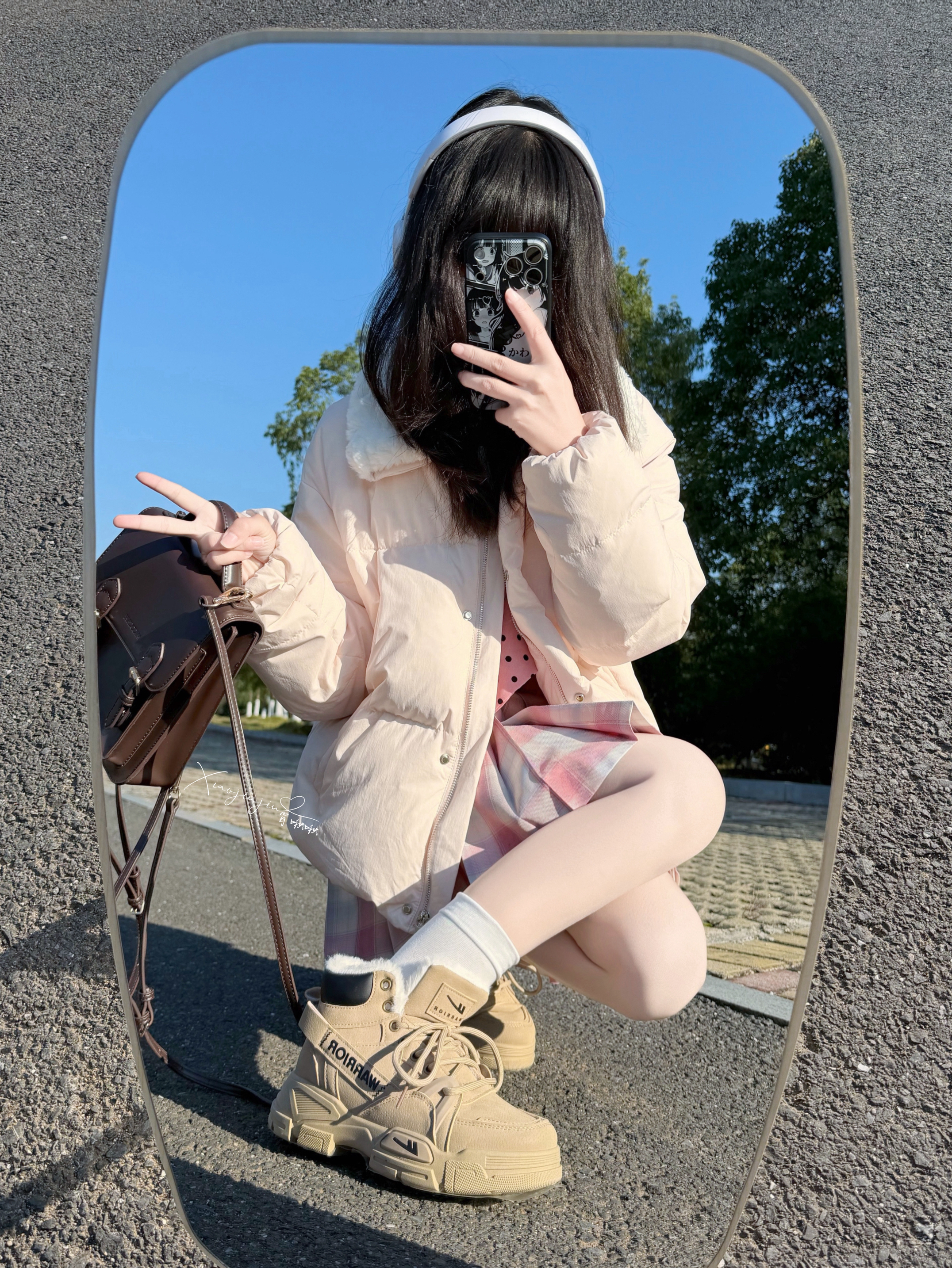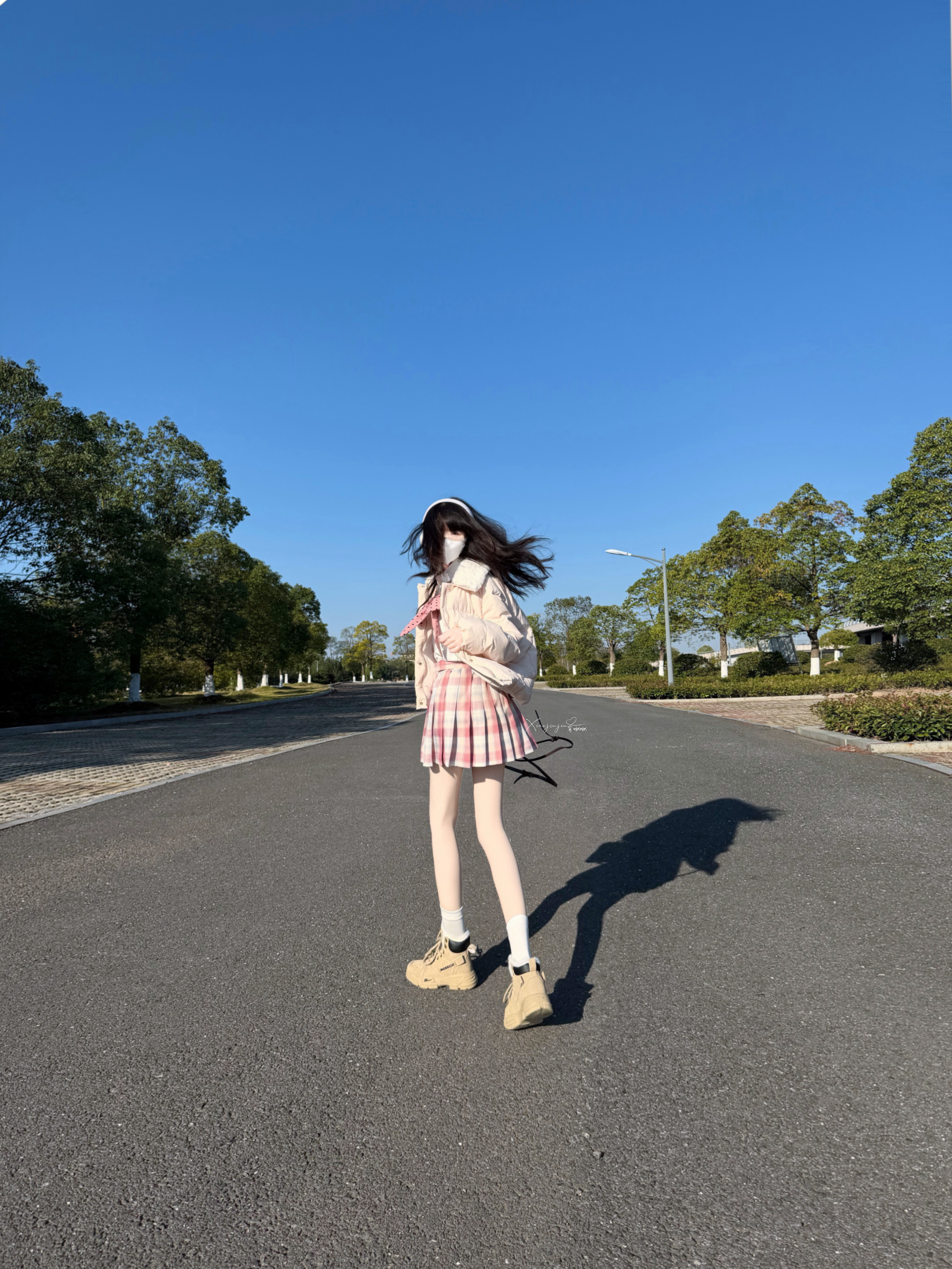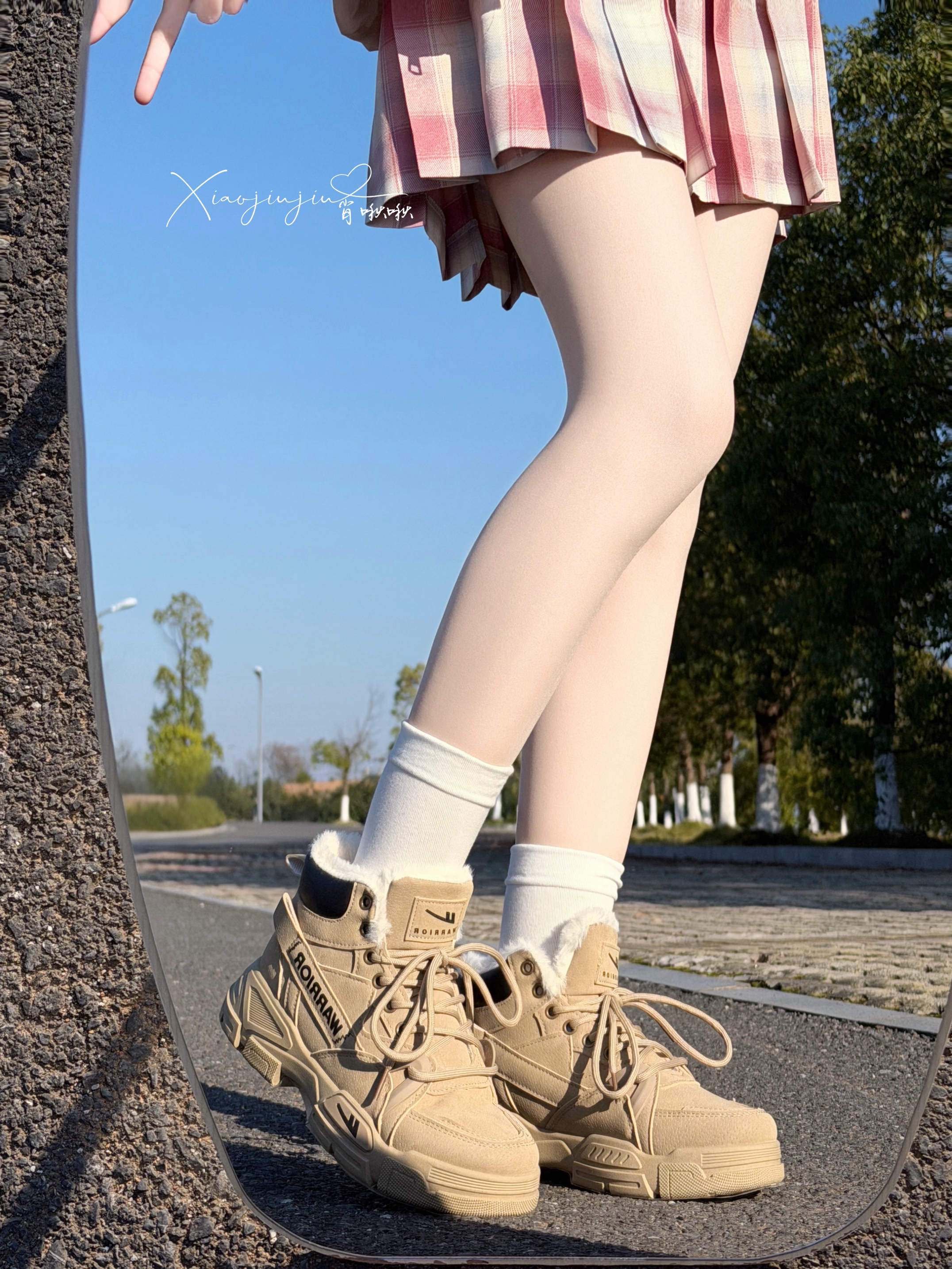 今天好冷呀 啾啾今天准备出门慢跑🏃♀️ 搭配了卡其毛绒靴和粉色格子裙👗 是青春活力女生👧 鞋子里头带绒毛,穿起来柔软 跑了一下身体发热 去上课啦拜拜
