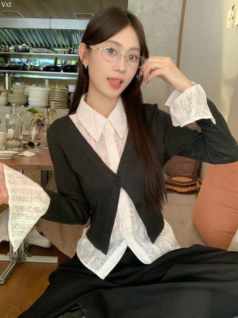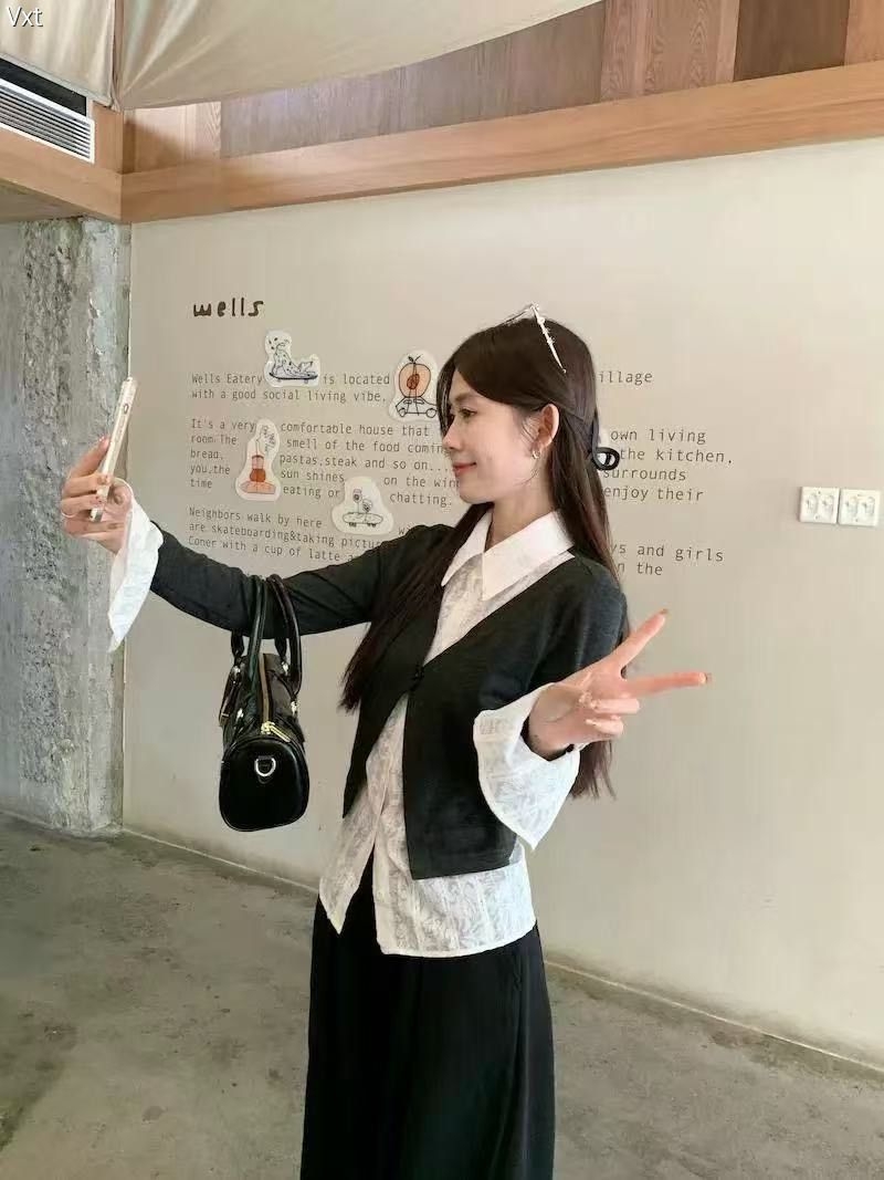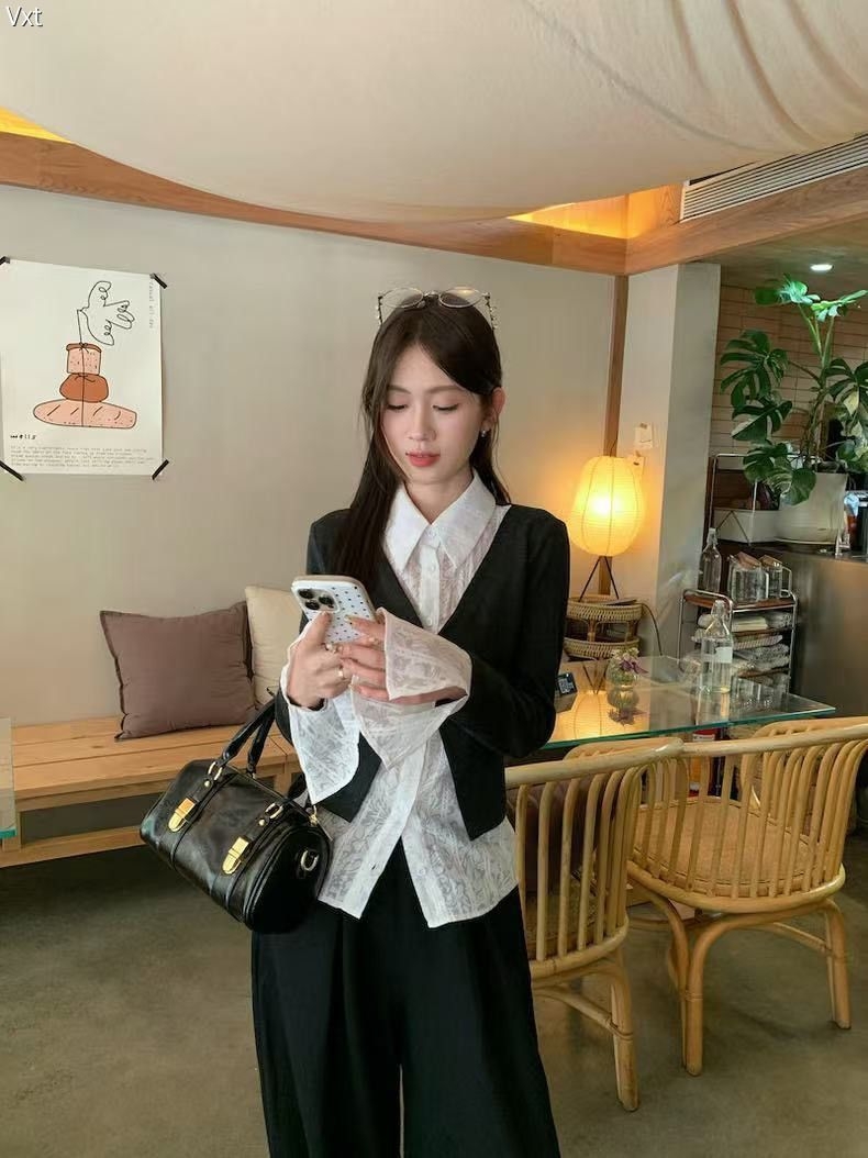 谁能拒绝这件“纯欲大小姐”上衣! 内搭是自带蕾丝暗纹的白衬衫,娃娃领+喇叭袖直接甜到心巴,外搭短款V领小坎肩,掐腰显比例还能藏肉~ 黑+白经典配色,搭裙装是温柔学姐,配裤子秒变清冷大小姐,通勤约会都能穿! 软乎乎的面料贴肤不扎,开春穿正合适,这波不冲真的亏!