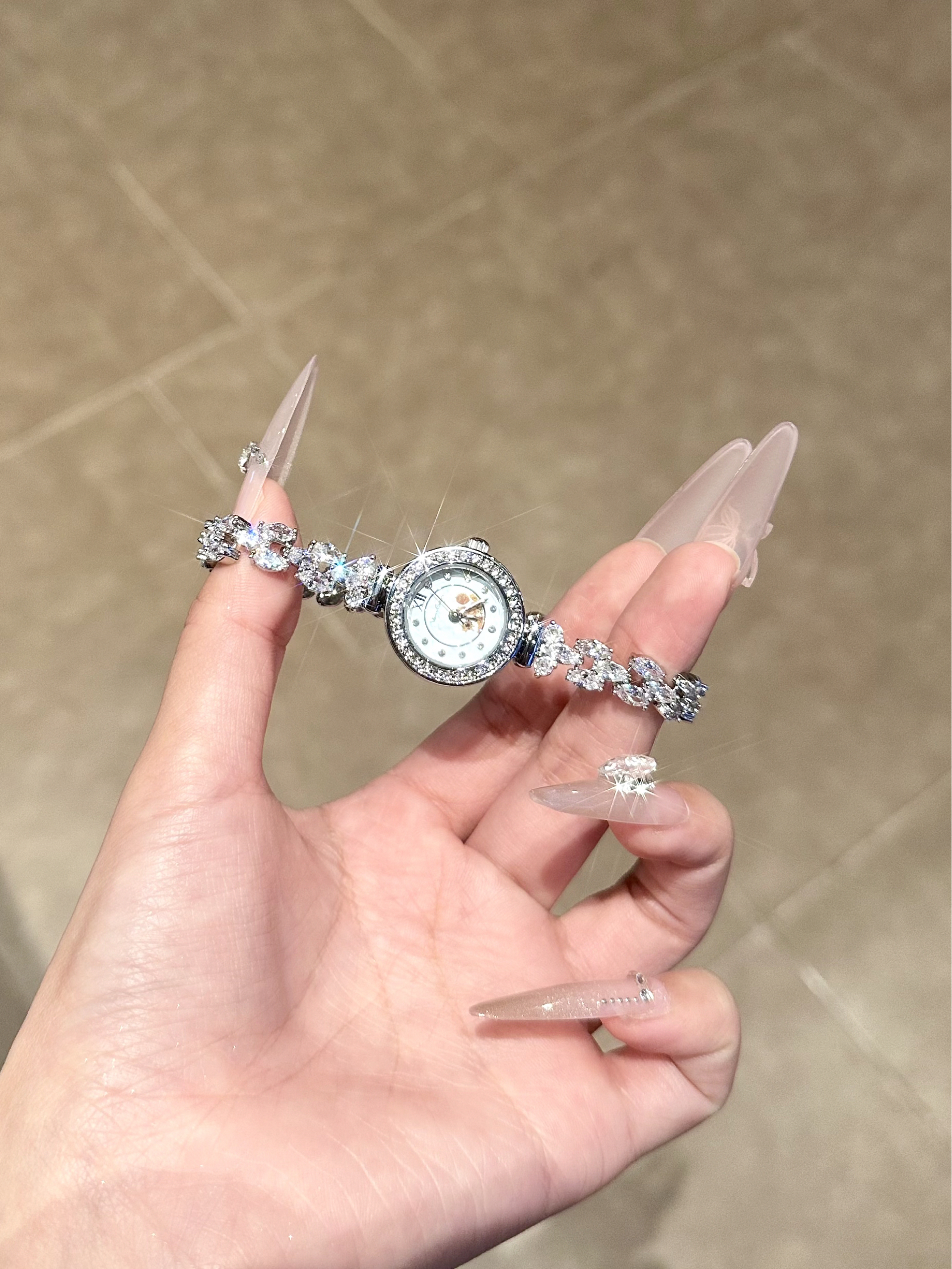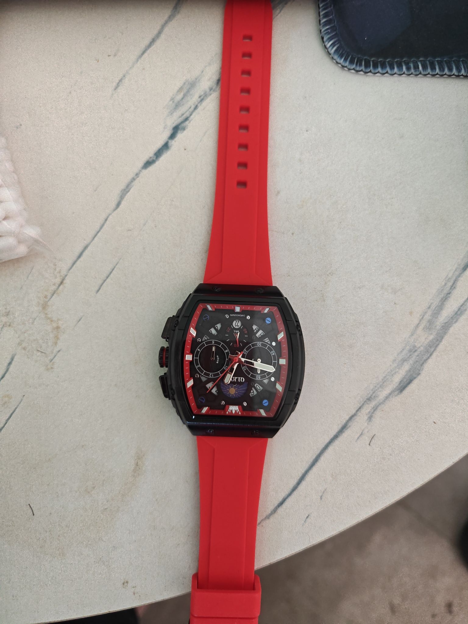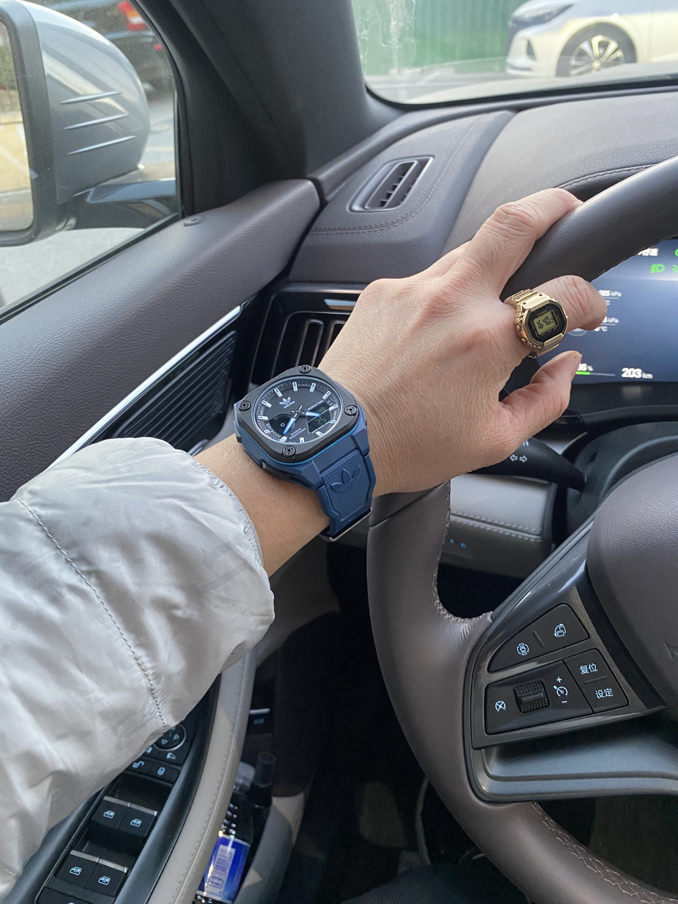 蓝色表带配黑灰表盘,加上Adidas的标志,运动风直接拉满。旁边那小金表也特精致,一酷一巧的搭配,看着就很有个性。