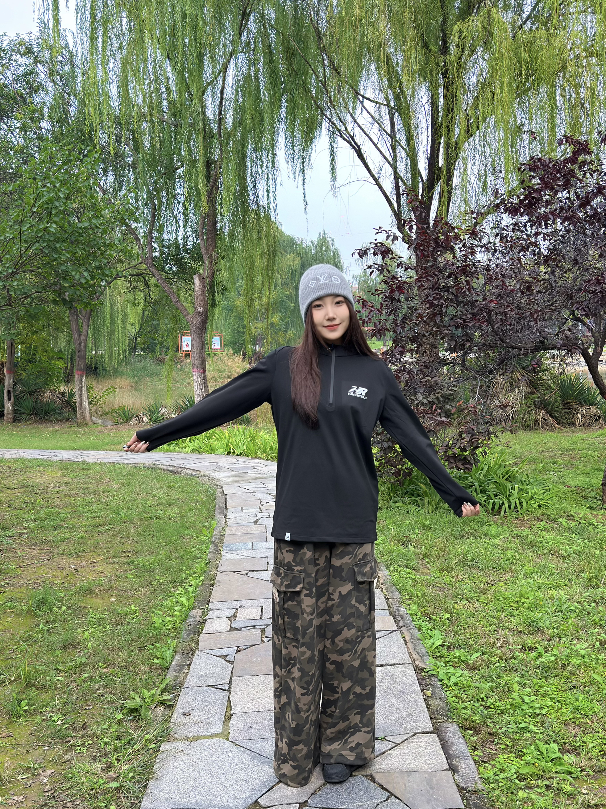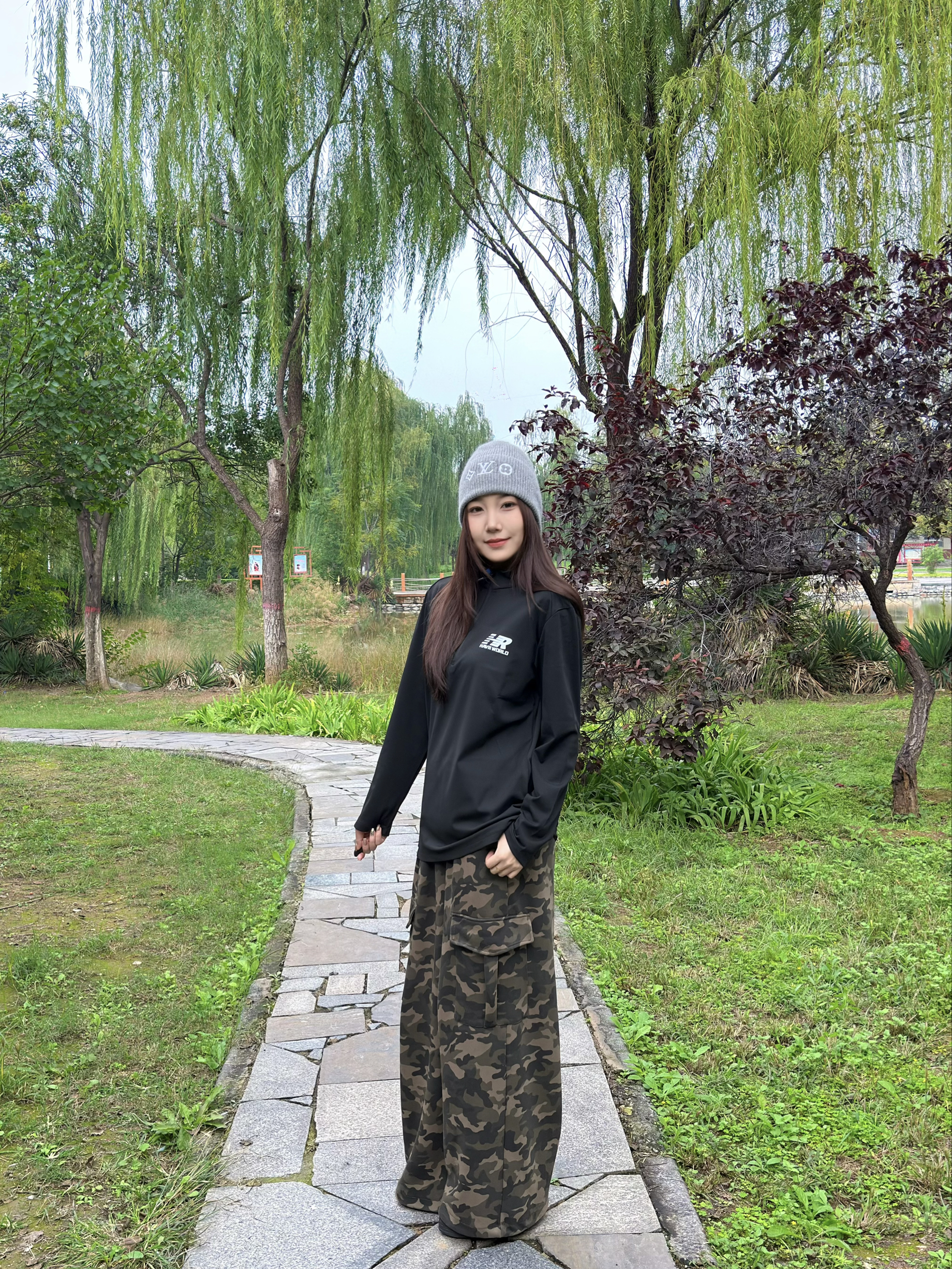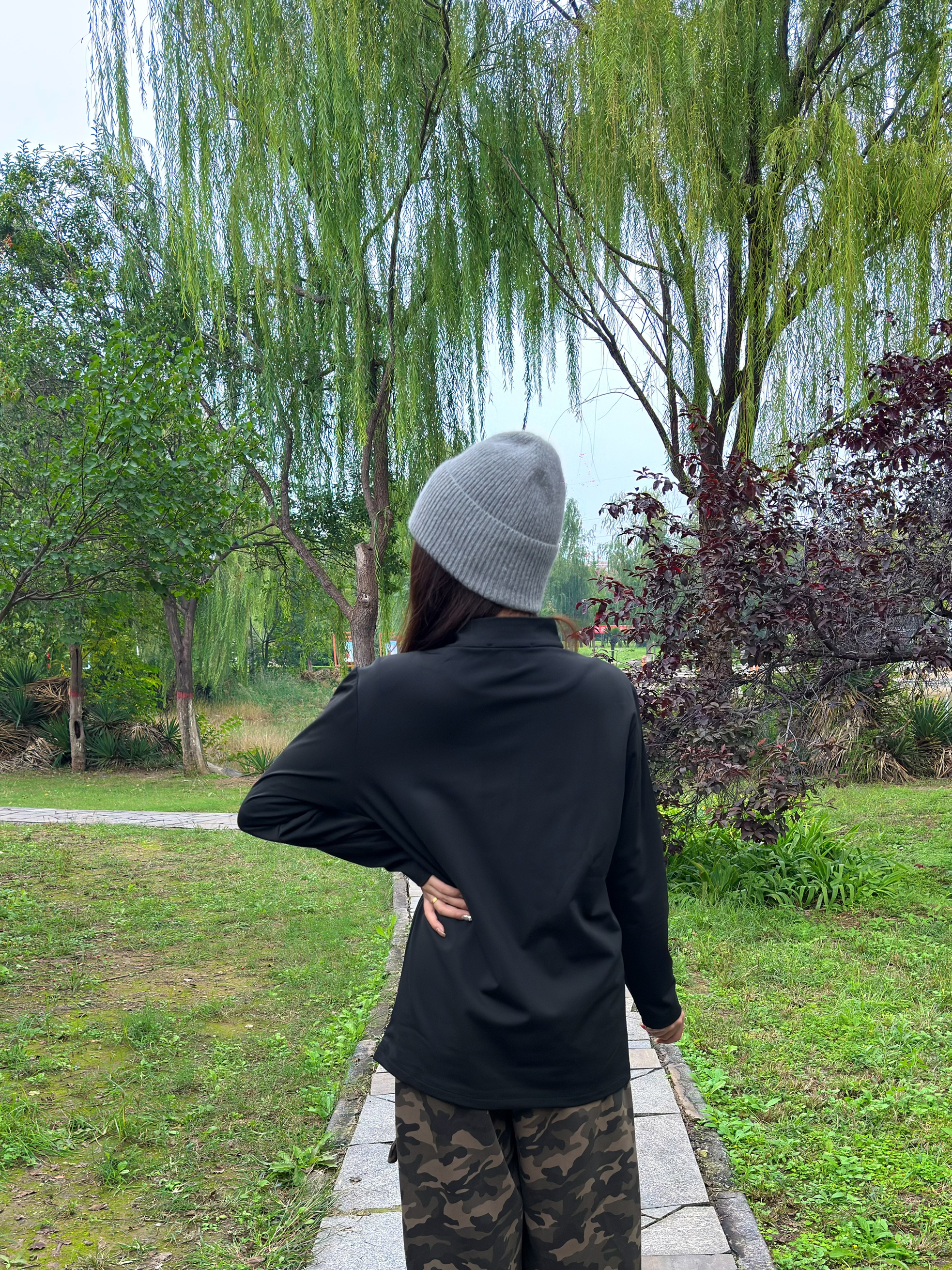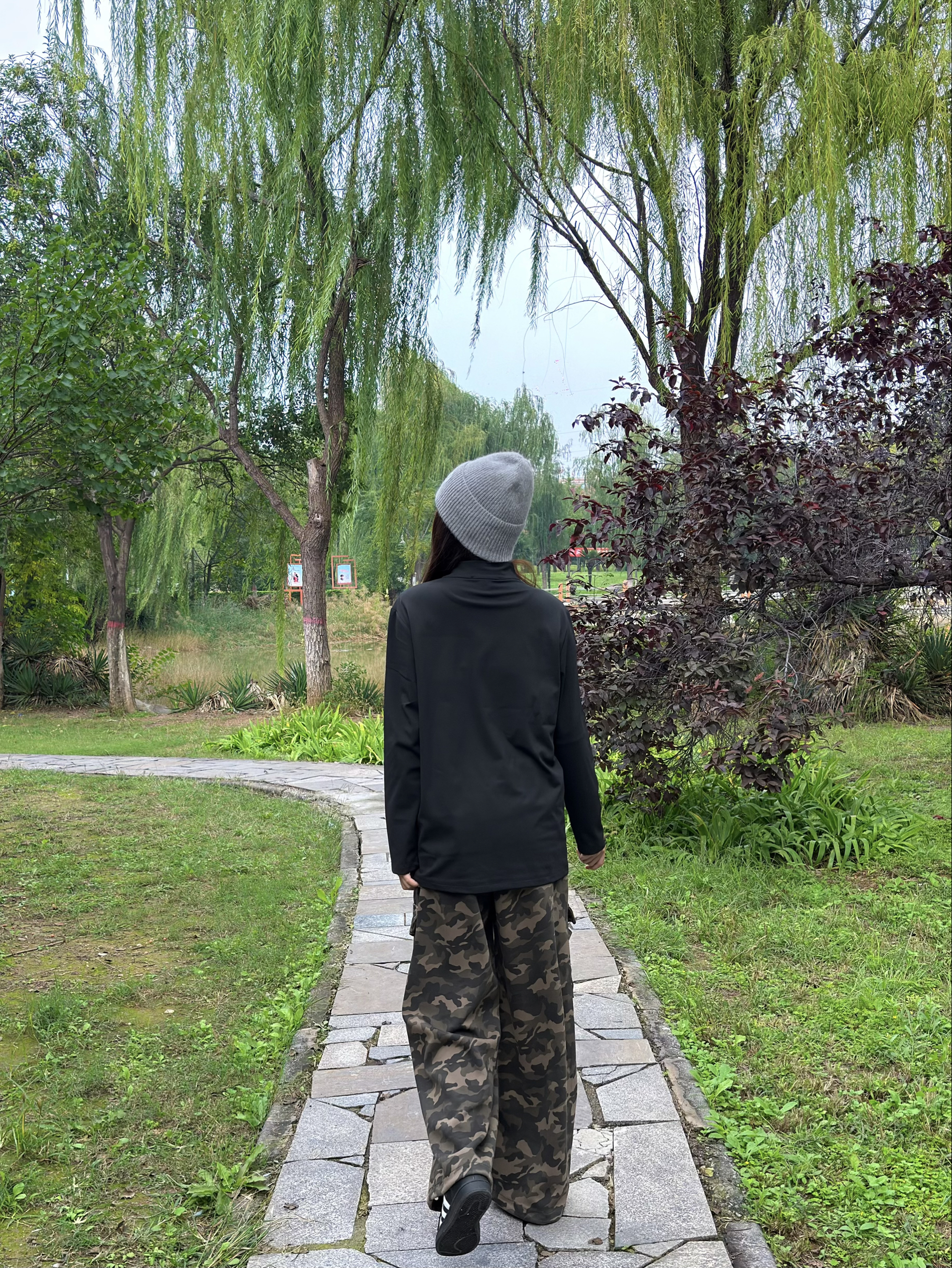 这件黑色高领字母上衣好显精神,面料软软的很亲肤,修身但不紧绷,秋天单穿或者内搭都合适~搭配迷彩工装裤,口袋多又能装,宽松版型藏肉一绝,走路带风超有范儿🌬️ 灰色冷帽一戴,瞬间有了慵懒氛围,往公园石板路上一站,随手插兜都好出片📸 柳树垂下来的枝条衬得整套look更清新,这种舒服又时髦的穿搭,citywalk、逛公园都超适配~