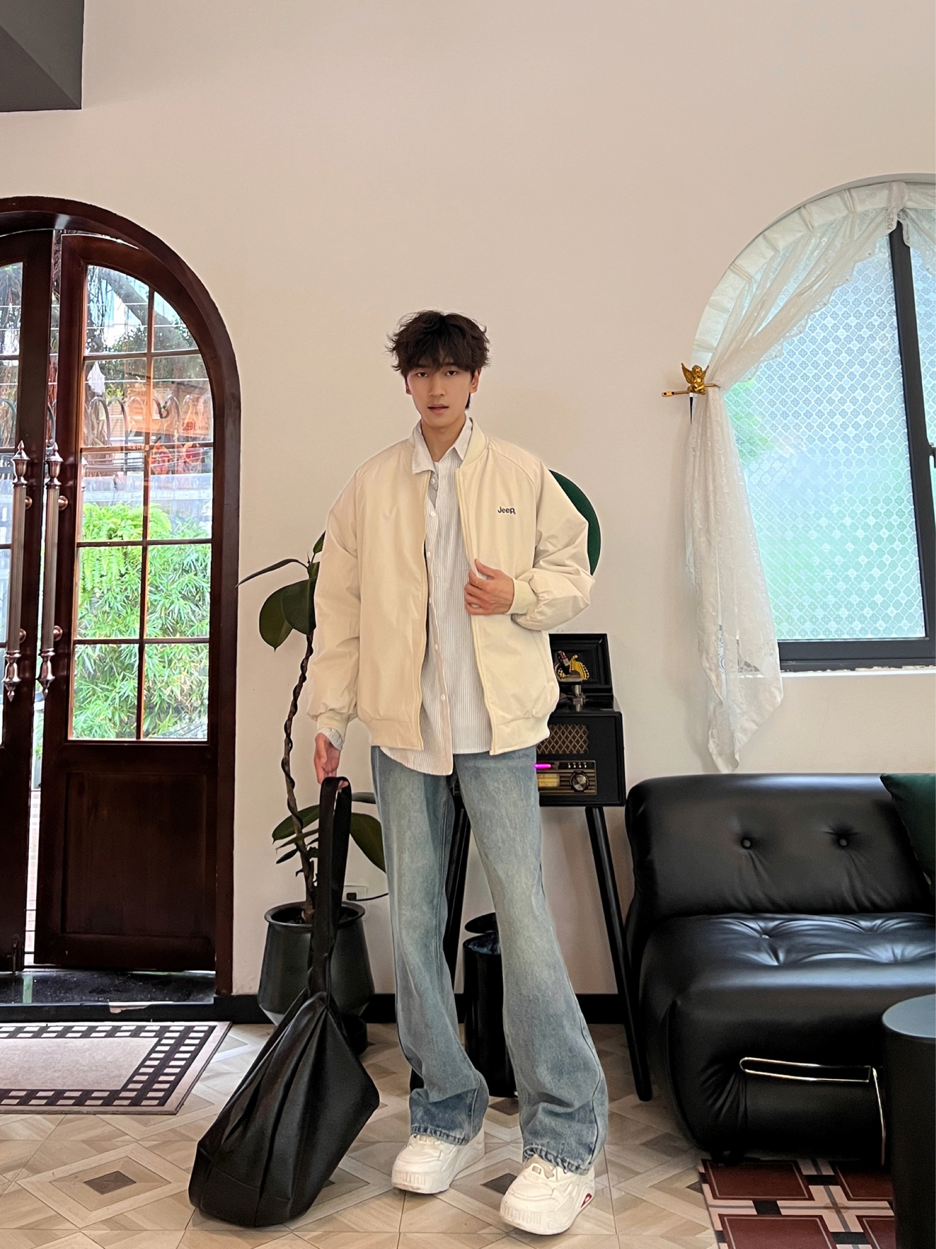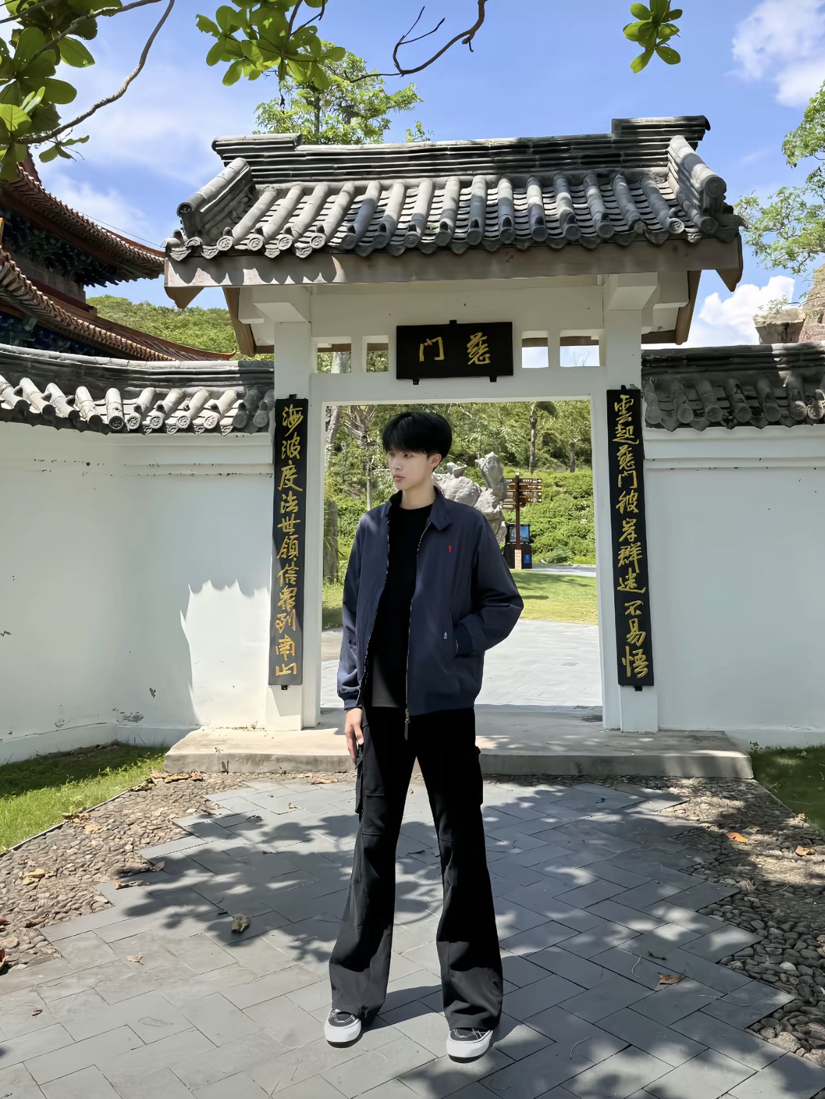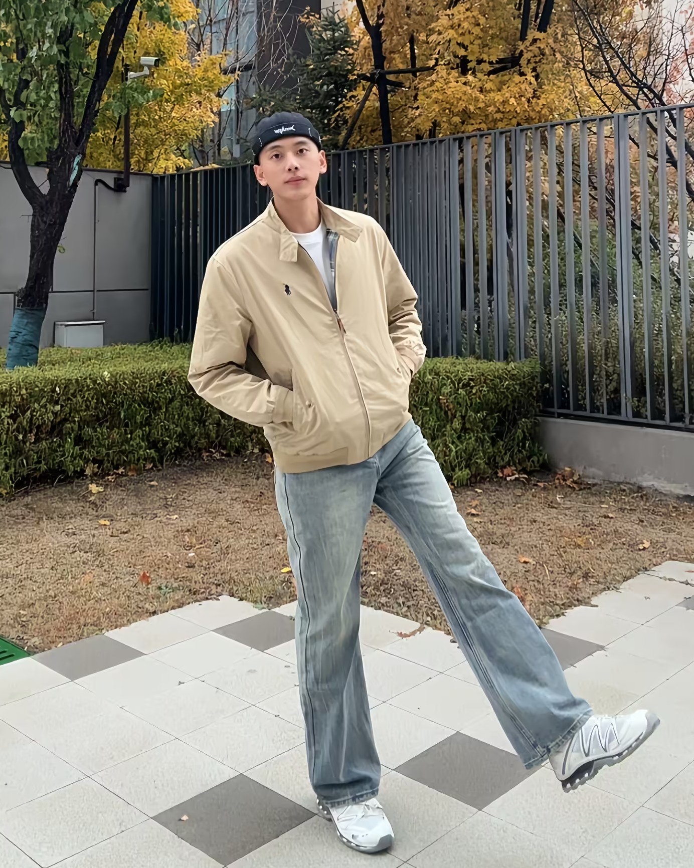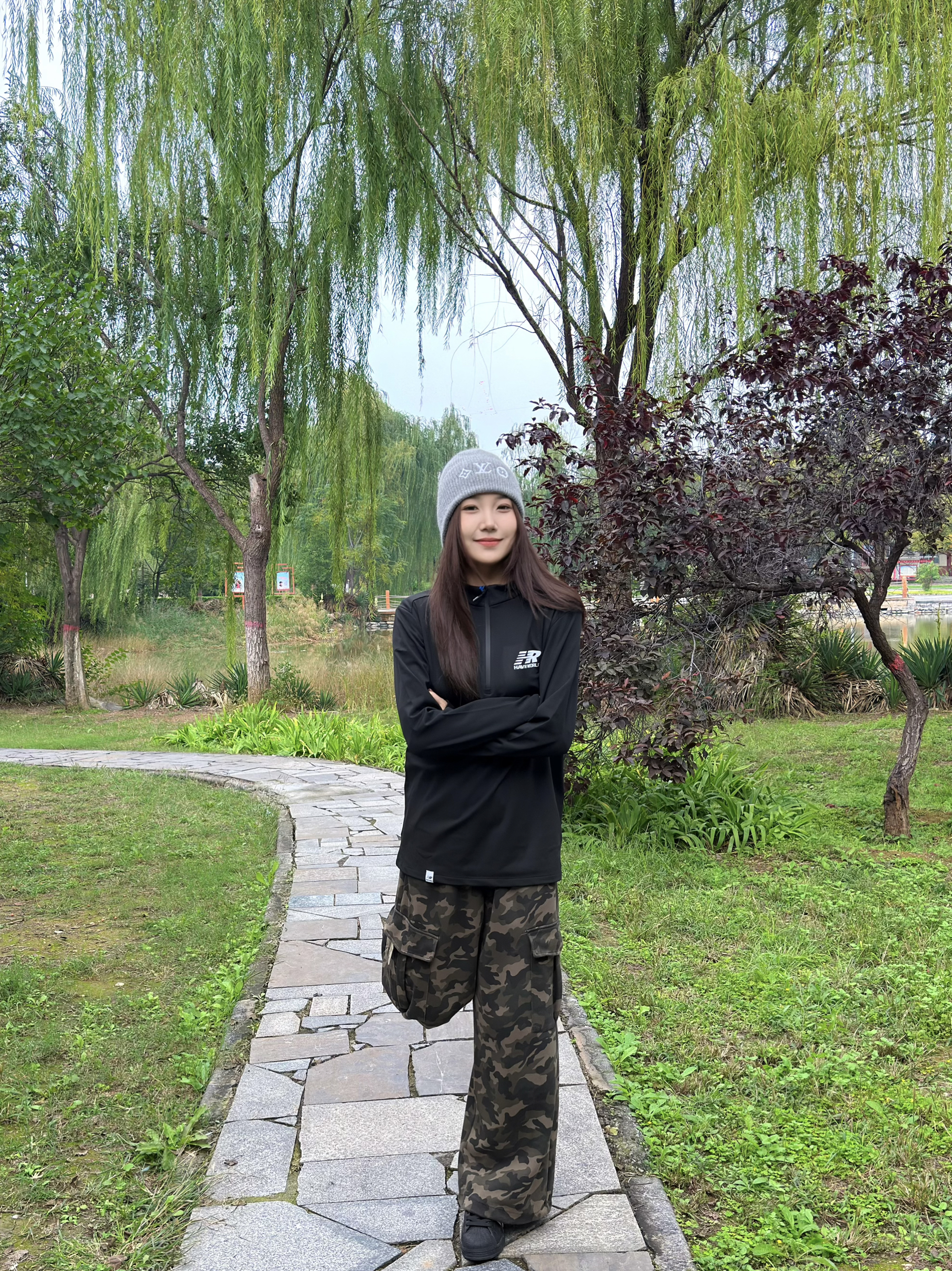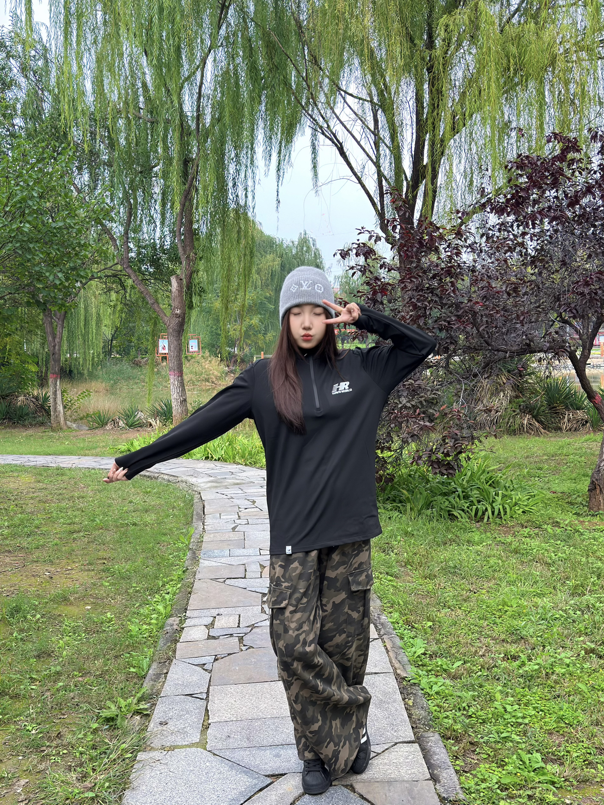 这件黑色高领字母上衣好显精神,面料软软的很亲肤,修身但不紧绷,秋天单穿或者内搭都合适~搭配迷彩工装裤,口袋多又能装,宽松版型藏肉一绝,走路带风超有范儿🌬️ 灰色冷帽一戴,瞬间有了慵懒氛围,往公园石板路上一站,随手插兜都好出片📸 柳树垂下来的枝条衬得整套look更清新,这种舒服又时髦的穿搭,citywalk、逛公园都超适配~