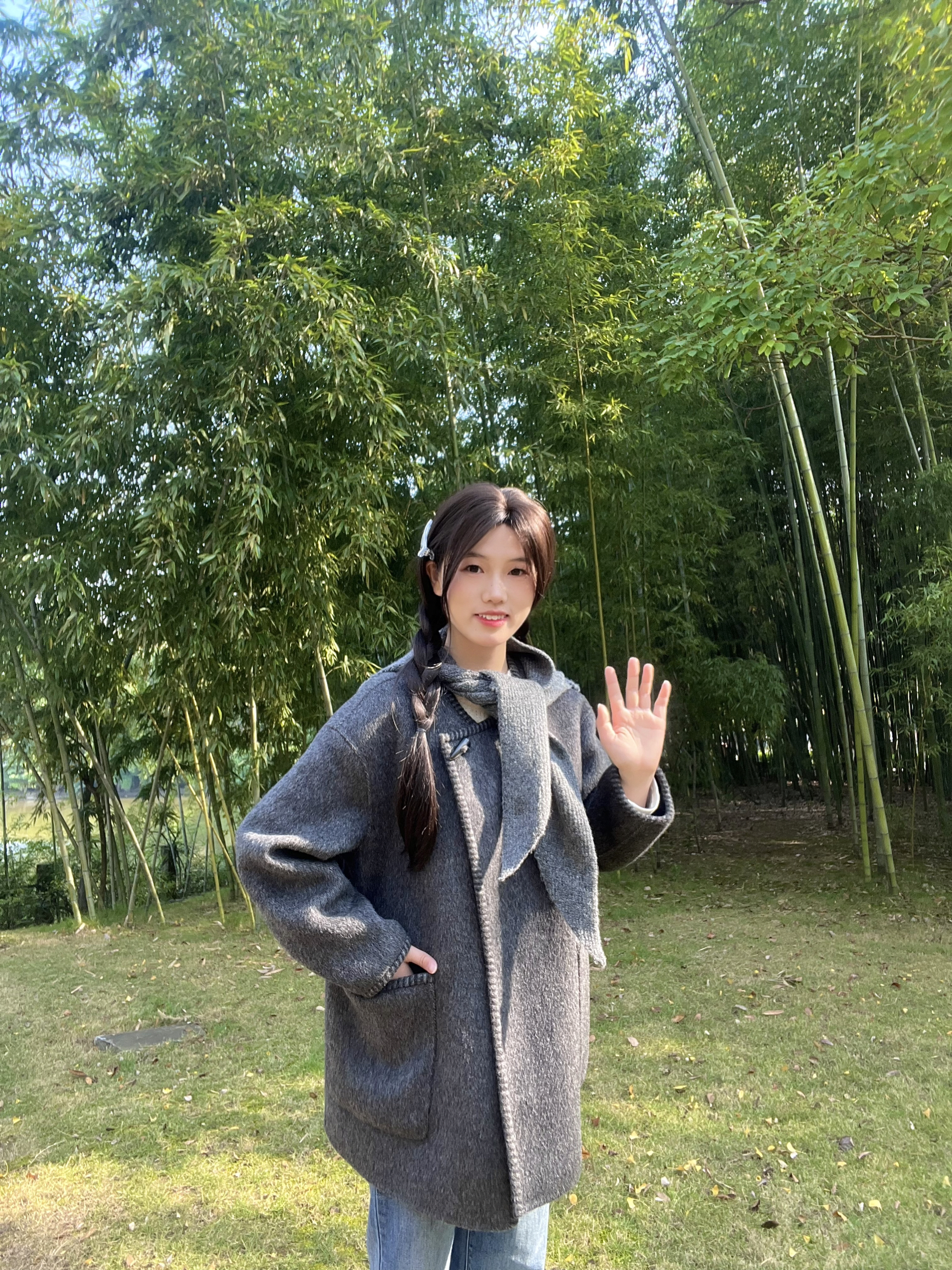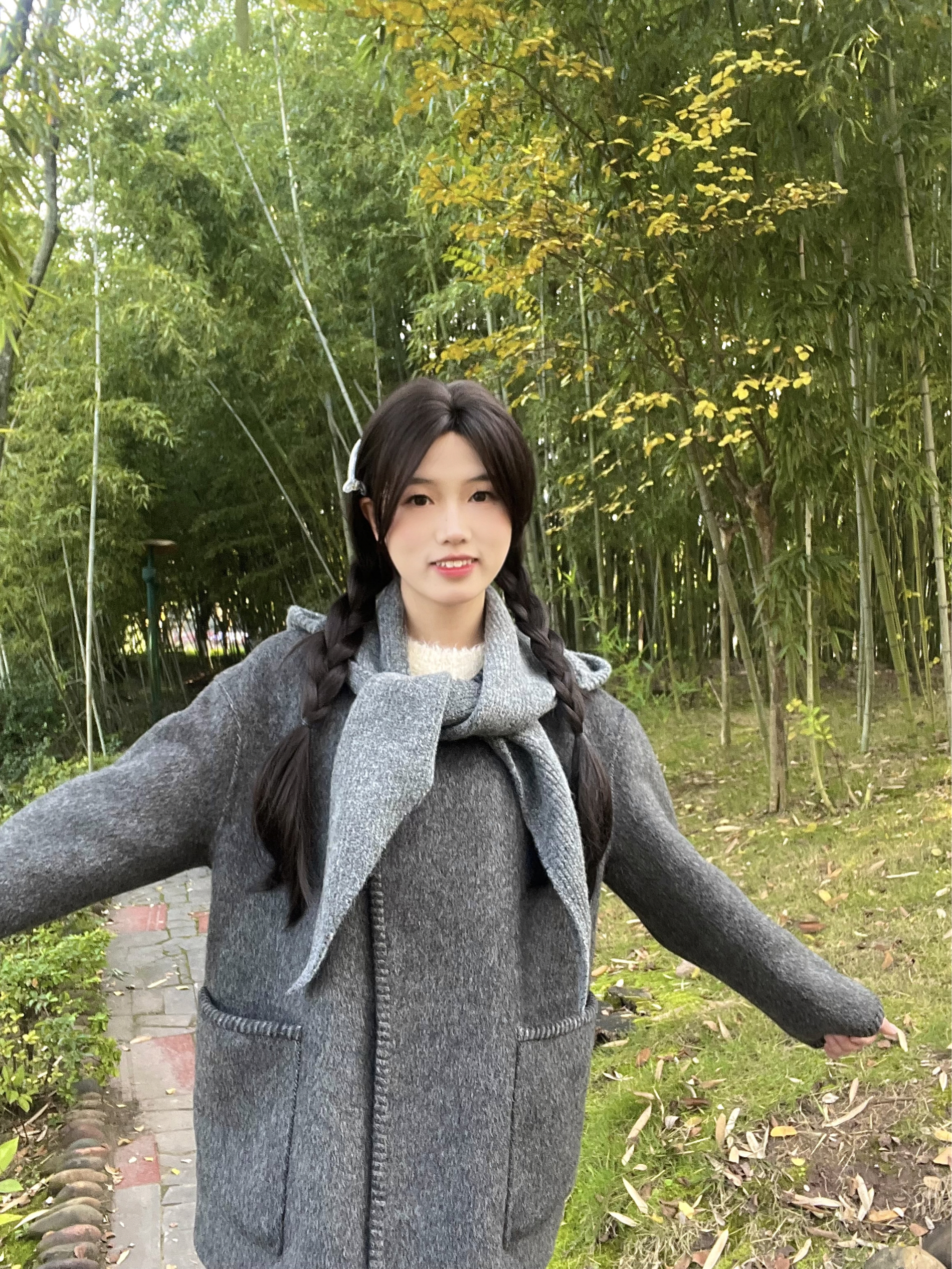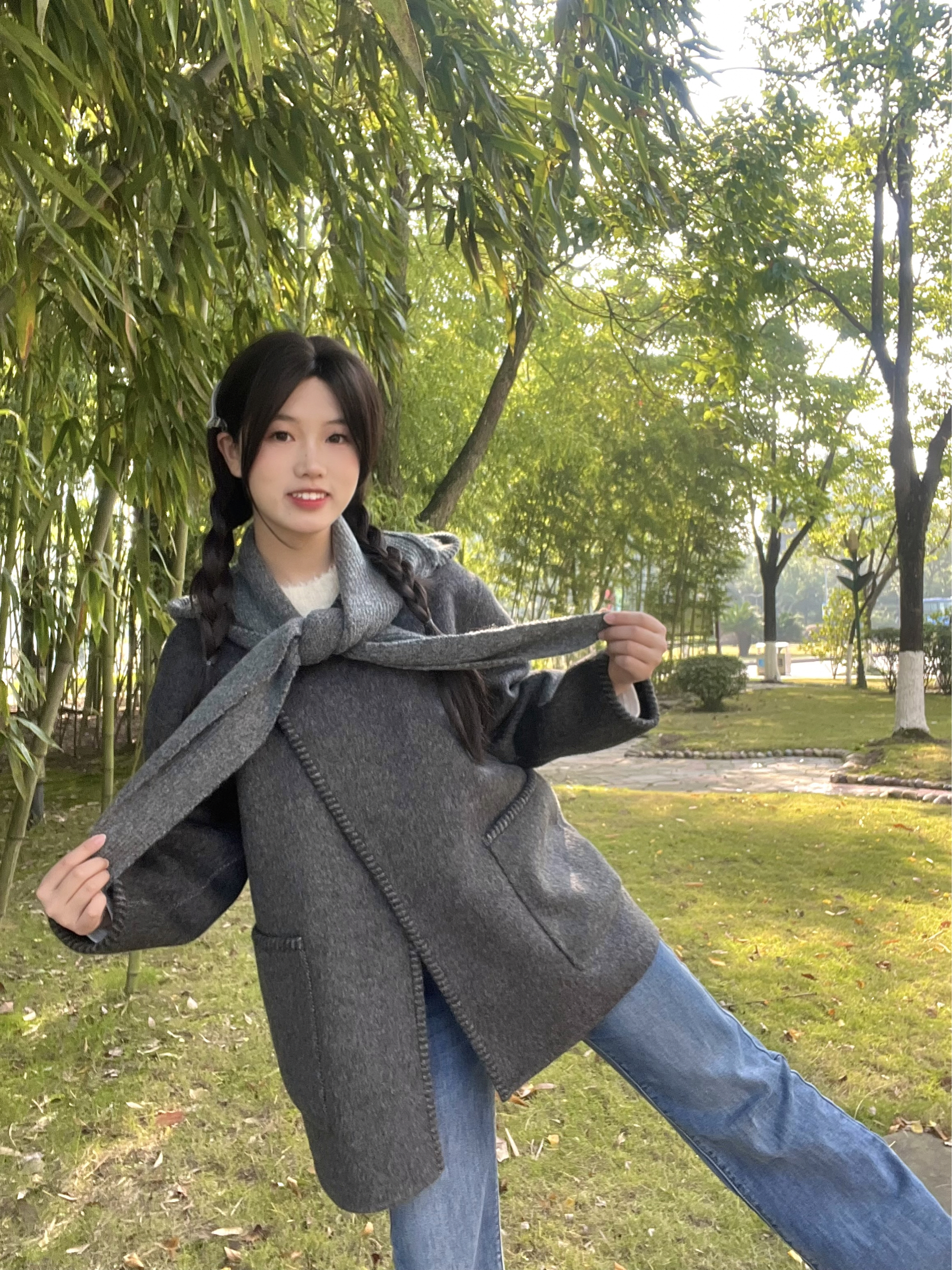 小个子也能轻松驾驭的一件的羊毛外套🧥 最近入手的这件灰色短款羊绒大衣 韩系设计很显气质 短款版型不会压身高 穿上一秒变韩系女孩 秋冬氛围感拿捏 158cm50kg穿m码 这个长度是可以遮住pp的 可以像我这样搭配微喇裤或者牛仔裤 但我没有系这个大衣原本自带的围巾 而是自己搭了个同色系的帽子围巾🧣 这套搭配一整个韩住啦 通勤约会都合适