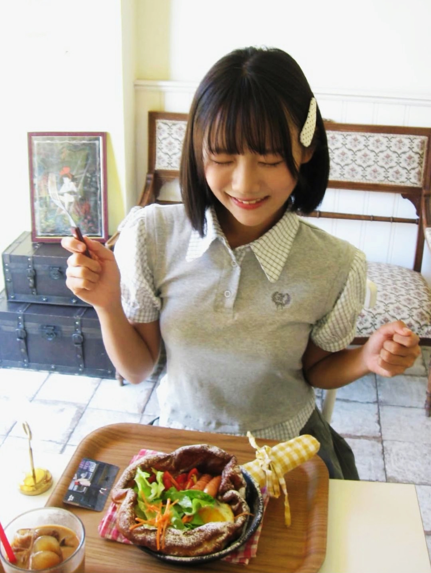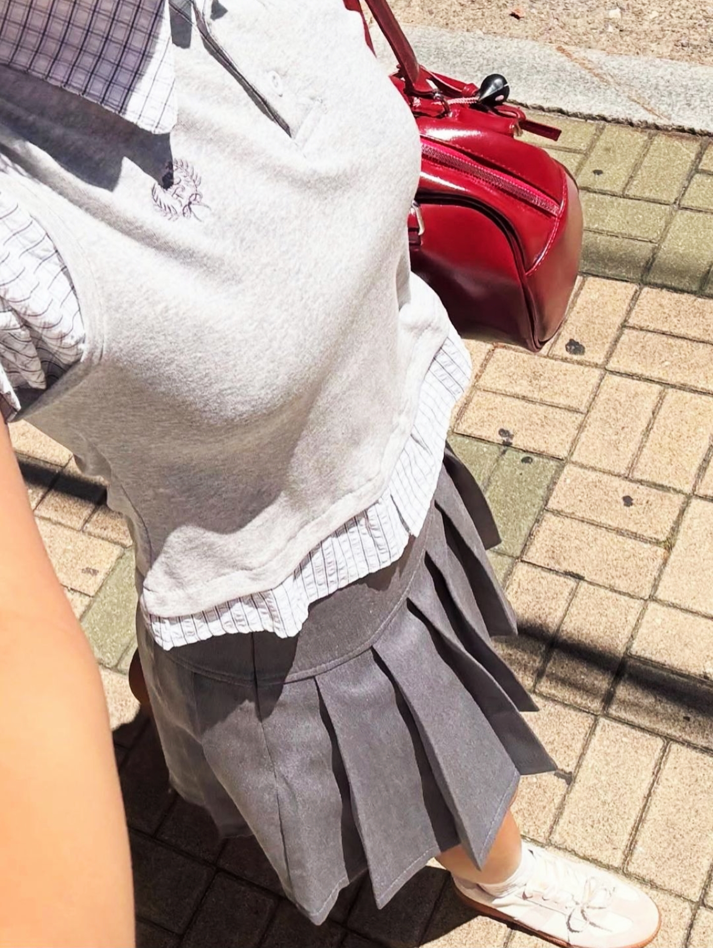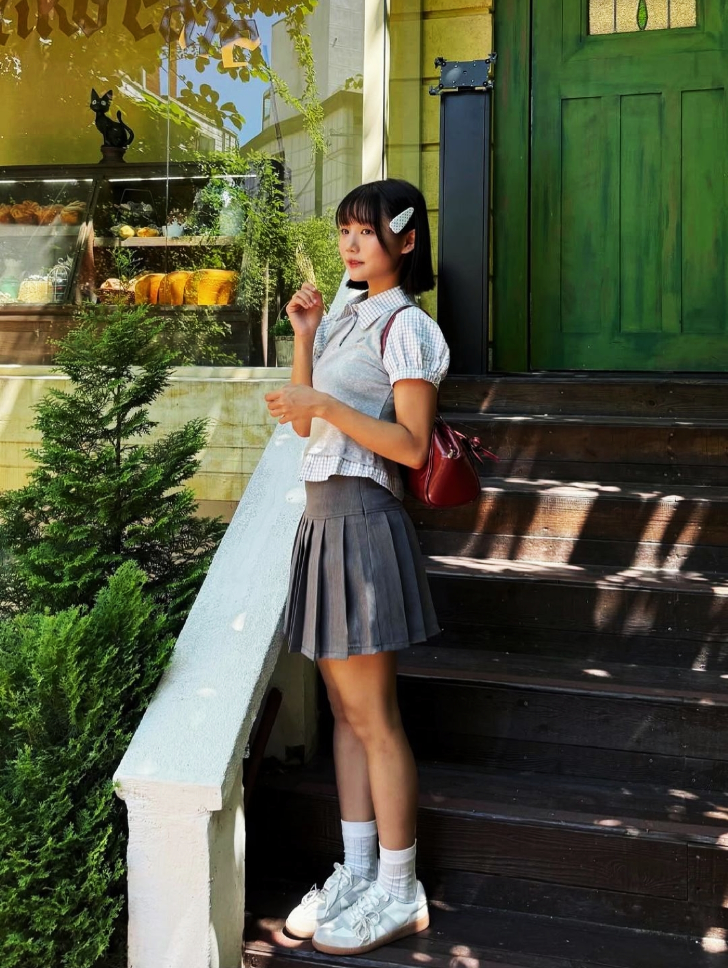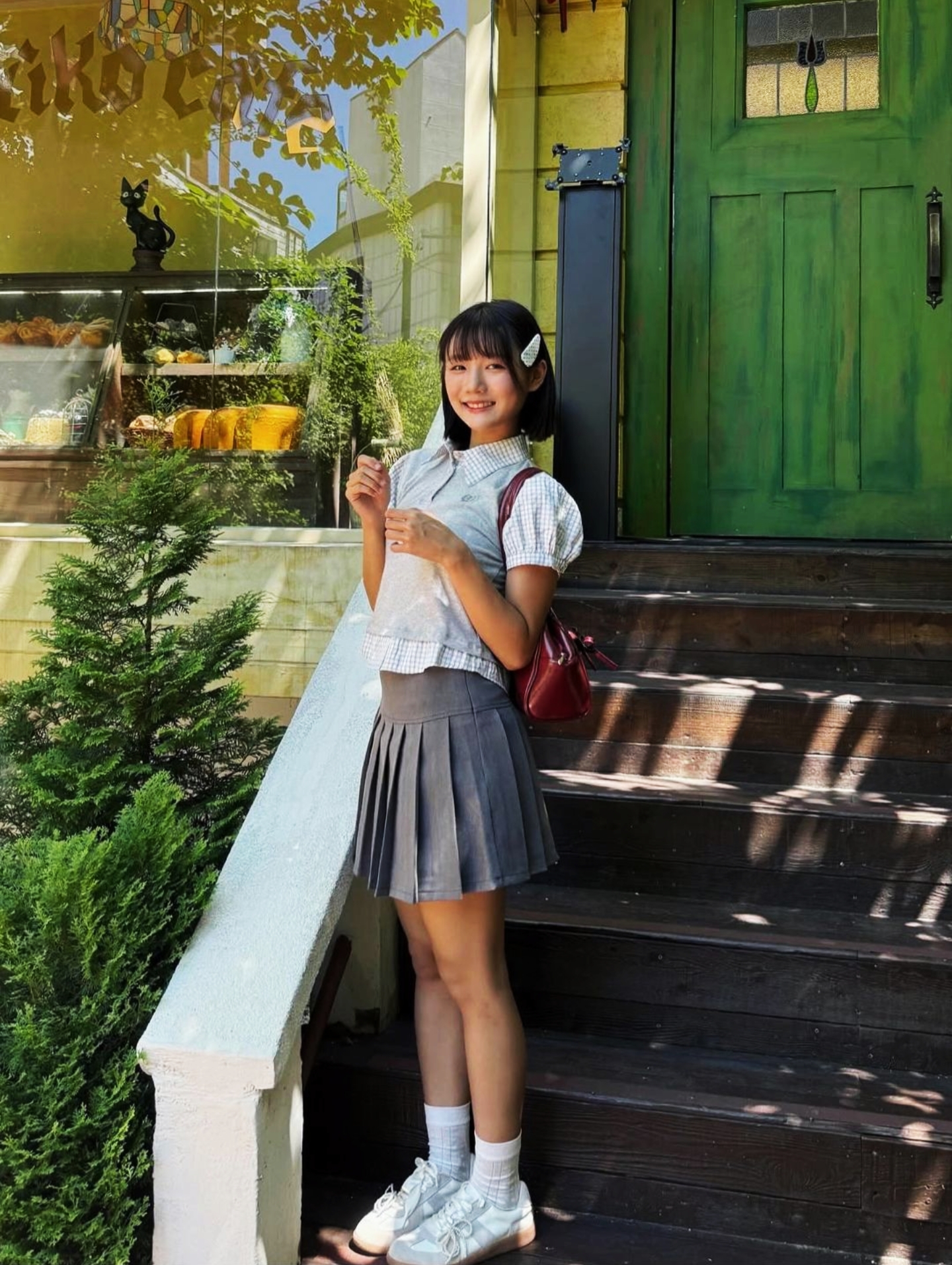 160cm55kg的女孩子🍰 被这套灰调假两件套装[爱心_blue]戳中审美! 格纹拼接+短款版型俏皮又有腔调~ 配酒红小挎包+白袜运动鞋元气感拉满🎒 短发一梳 日系学妹的清甜感直接溢出 倚在台阶上抬着笑 每一帧都像夏日漫画里的治愈日常📖 今天是被青春穿搭裹满的快乐一天~🥰